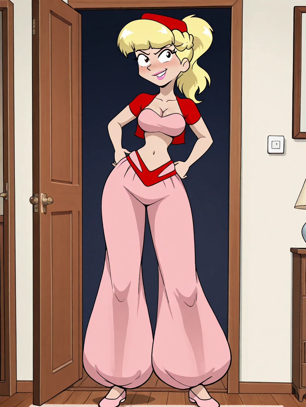 red headwear, narrow waist, red cropped jacket, pink off shoulder top, pink harem pants with red highlights, navel, midriff, pink footwear