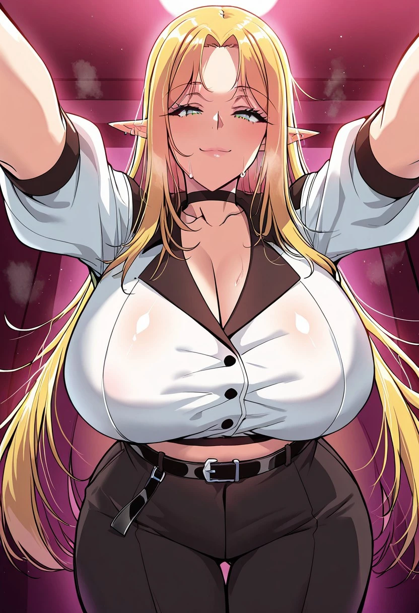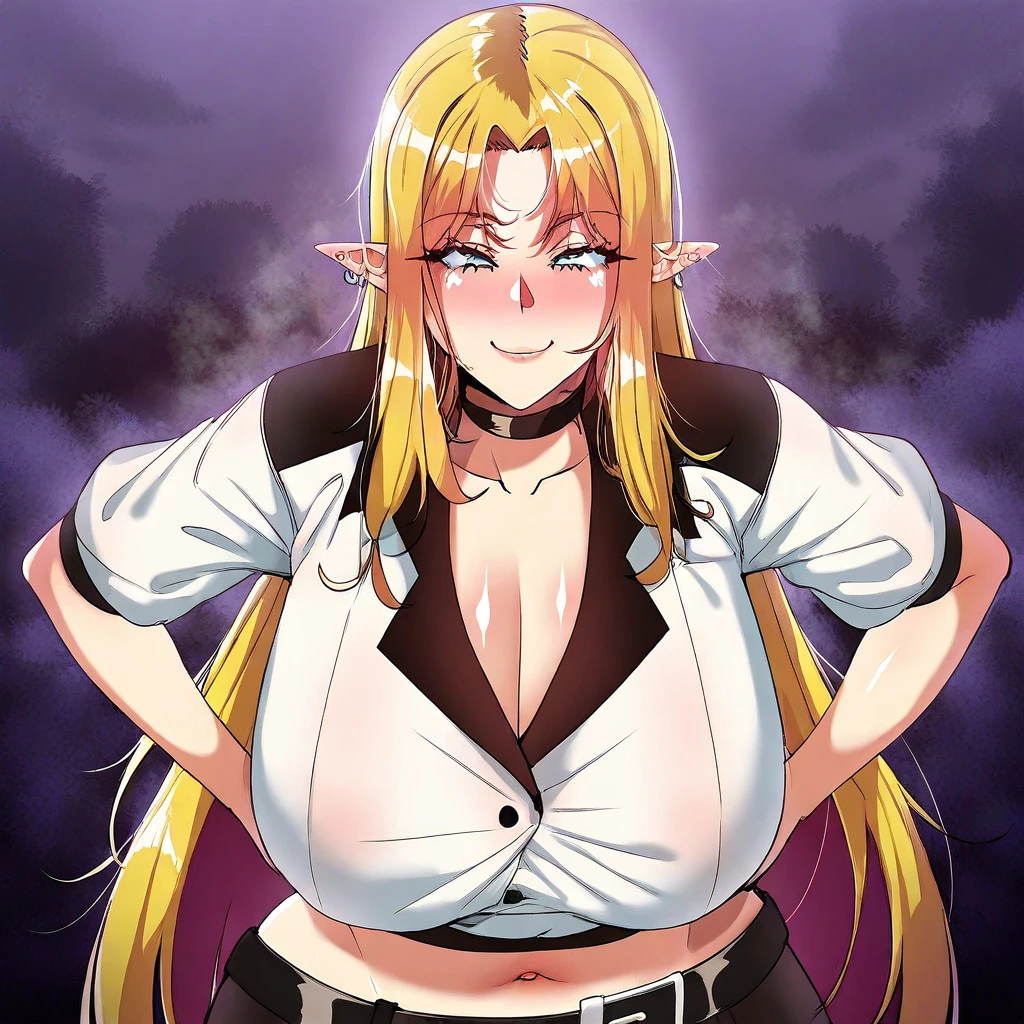 Requre: requre_(isekai_fall_of_the_hero), piercing green eyes, beautiful blonde hair, beautiful long hair, huge and shaggy breasts, pointy elf ears, attractive elf woman,