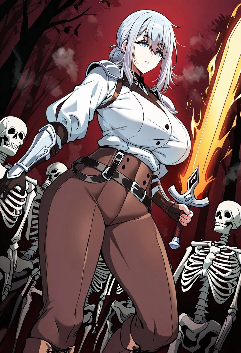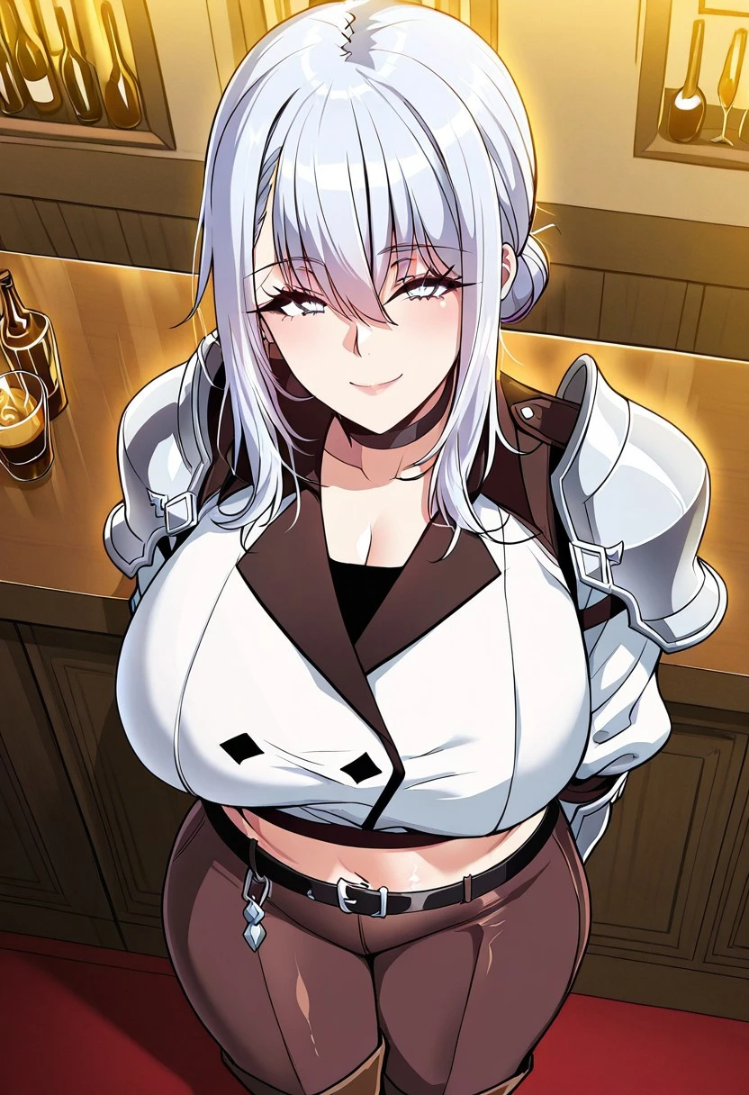 Rootbeer Brandy: rootbeer_brandy, piercing light blue eyes, beautiful silver hair, hair bun, bangs, hair between eyes, huge and shaggy breasts,