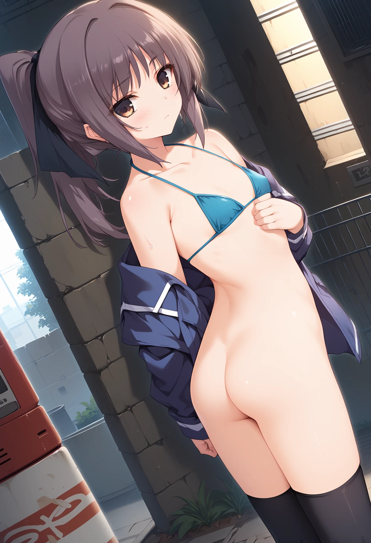 aya,brown eyes,purple hair,ponytail,hair ribbon,