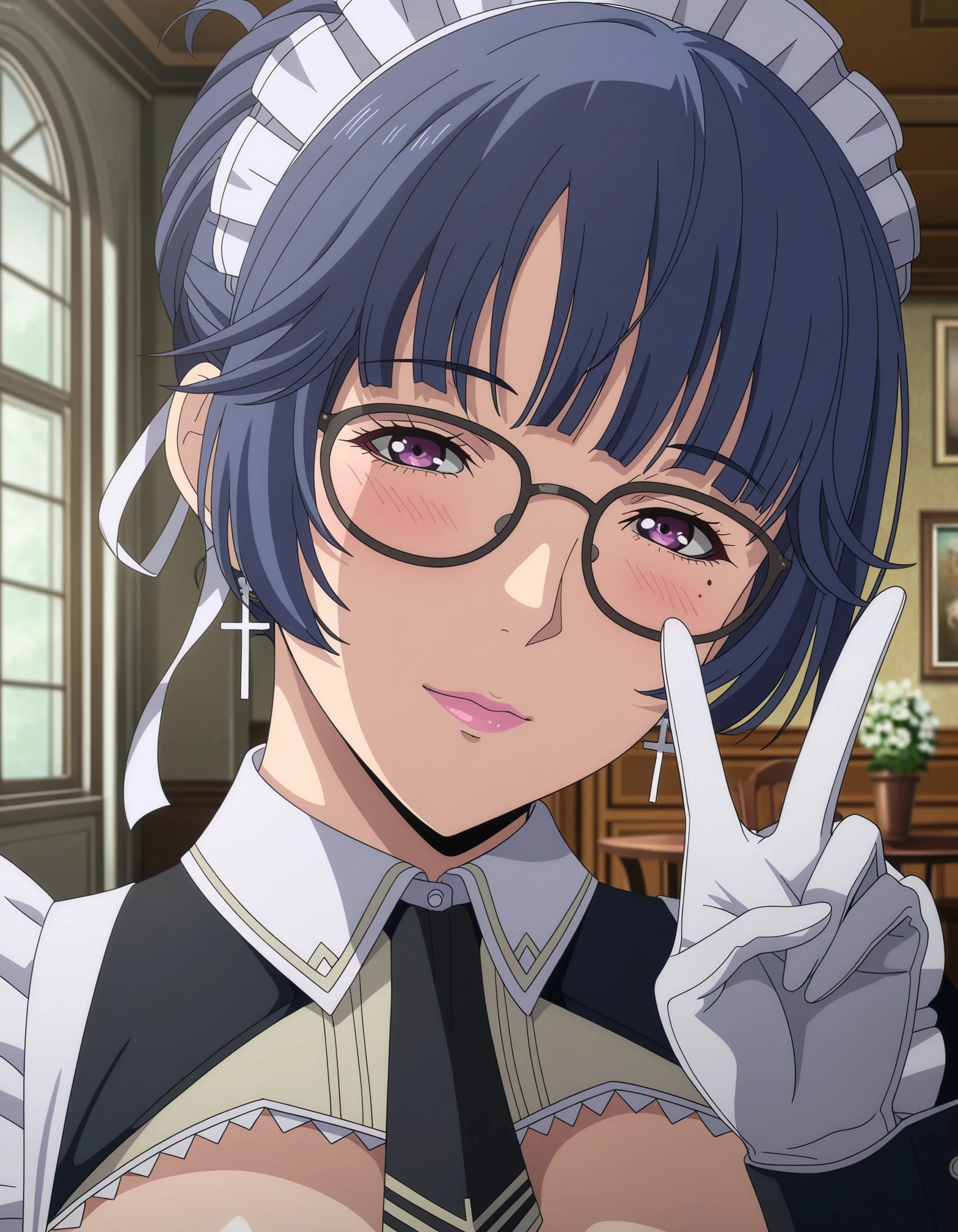 1girl, Katagiri Aira, blue hair, short hair, purple eyes, single hair bun, hair ribbon, pink lips, mole under eye, glasses, cross earrings