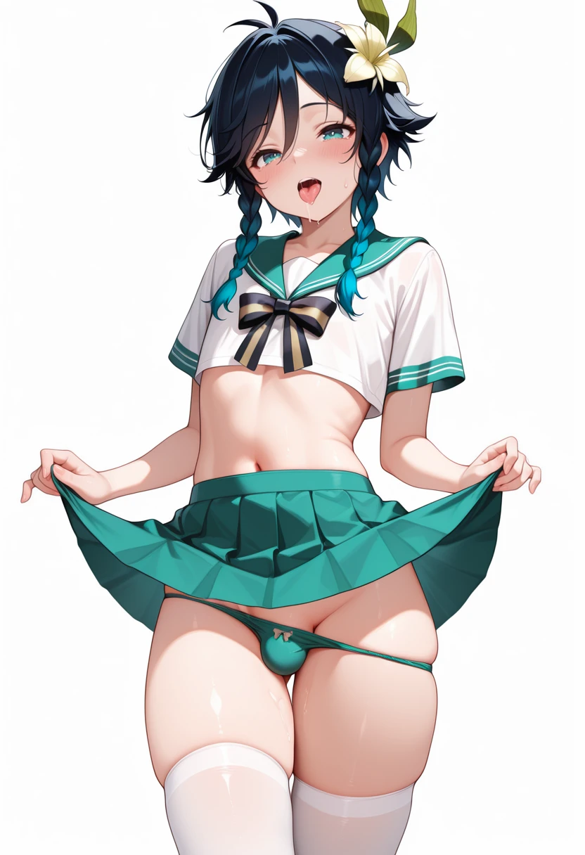 venti, male focus, food, 1boy, flower, skirt, solo, fruit, school uniform, apple, thighhighs, hair flower, hair ornament, serafuku, navel, holding food, gradient hair, pleated skirt, holding, looking at viewer, holding fruitNegative
