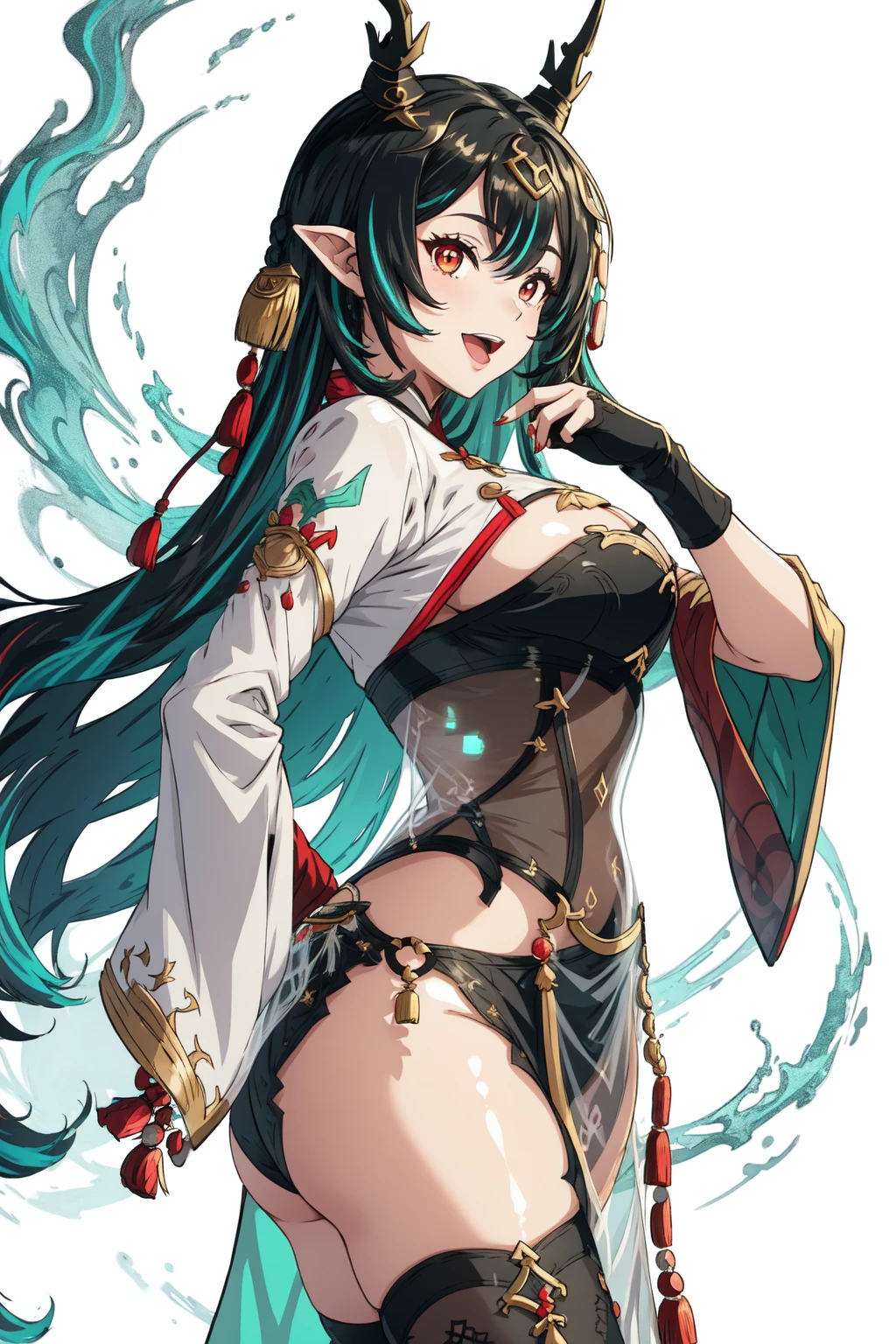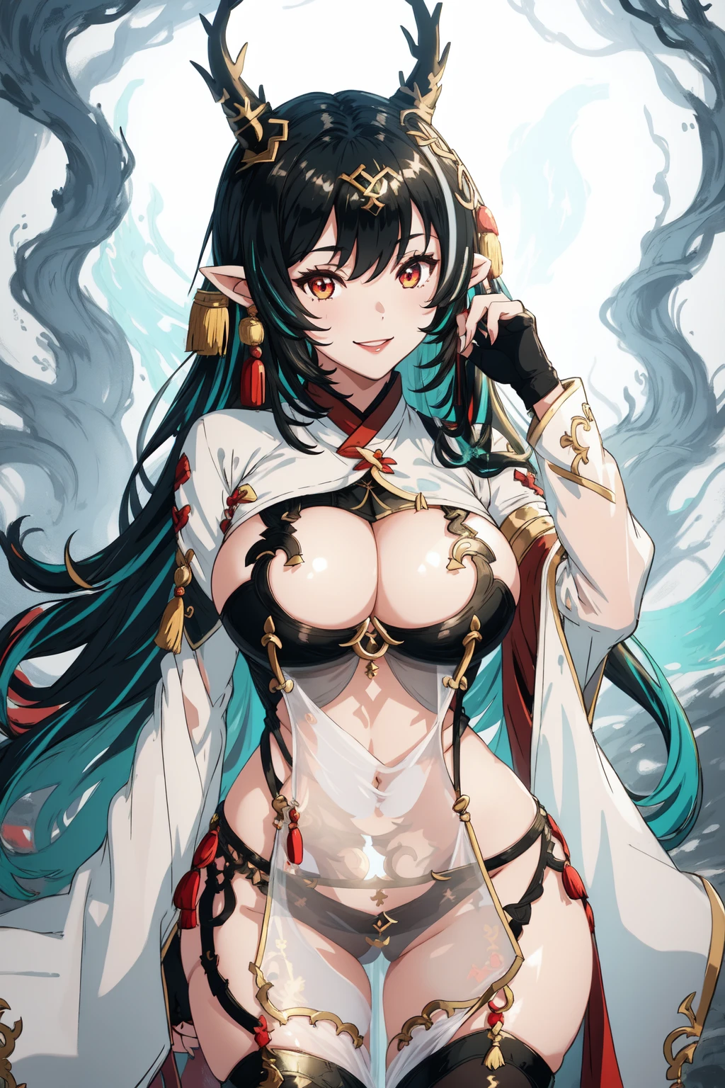 harsd, multicolored hair, horns, pointy ears, streaked hair, hair ornament, chinese clothes, clothing cutout, black thigh highs, detached sleeves, see through pelvic curtain, multicolored eyes, one side fingerless gloves, okobo
