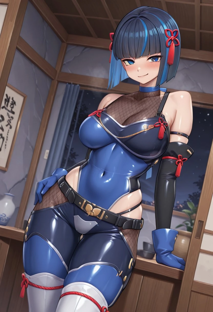 KuraKeitotaim , 1girl , blue eyes , multicolor hair , Streaked hair , dark-blue hair , blue inner hair , bob cut , blue eyes , ribbon choker , blue choker , brown fishnet , red-hair ornament , red rope ,brown fishnet , high-neck fishnet ,fishnet bodystocking , bare shoulders , detachable sleeves , black sleeves , blue gloves , ninja , multicolor leotard , , blue leotard , black leotard , hips vent ,multicolor pants , blue pants ,pants , ,blue , black belt , tilted belts , multiple belts , white boots , thigh boot