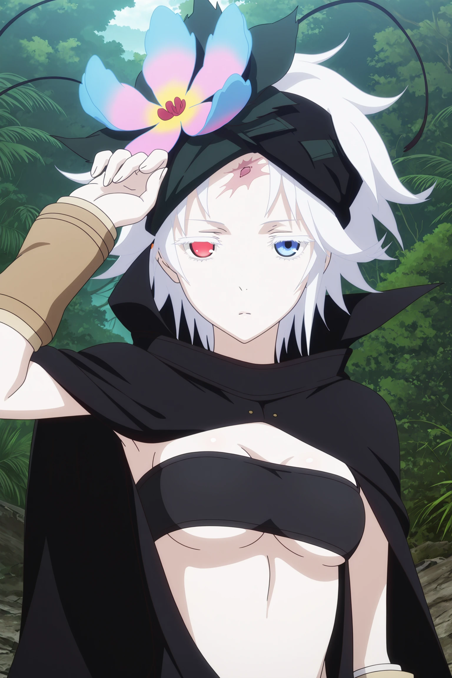 fremy speeddraw, short hair, white hair, headband, hair flower, hairband, eyepatch, eyepatch lift, scar on forehead, white eyelashes, heterochromia, red eyes, blue eyes, cape, tube top, black shirt, sleeveless, clothing cutout, single elbow gloves, single arm warmer, black shorts, black pantyhose, fanny pack, black footwear, thigh boots, knee pads, garter strapsOPTIONAL WORDS
