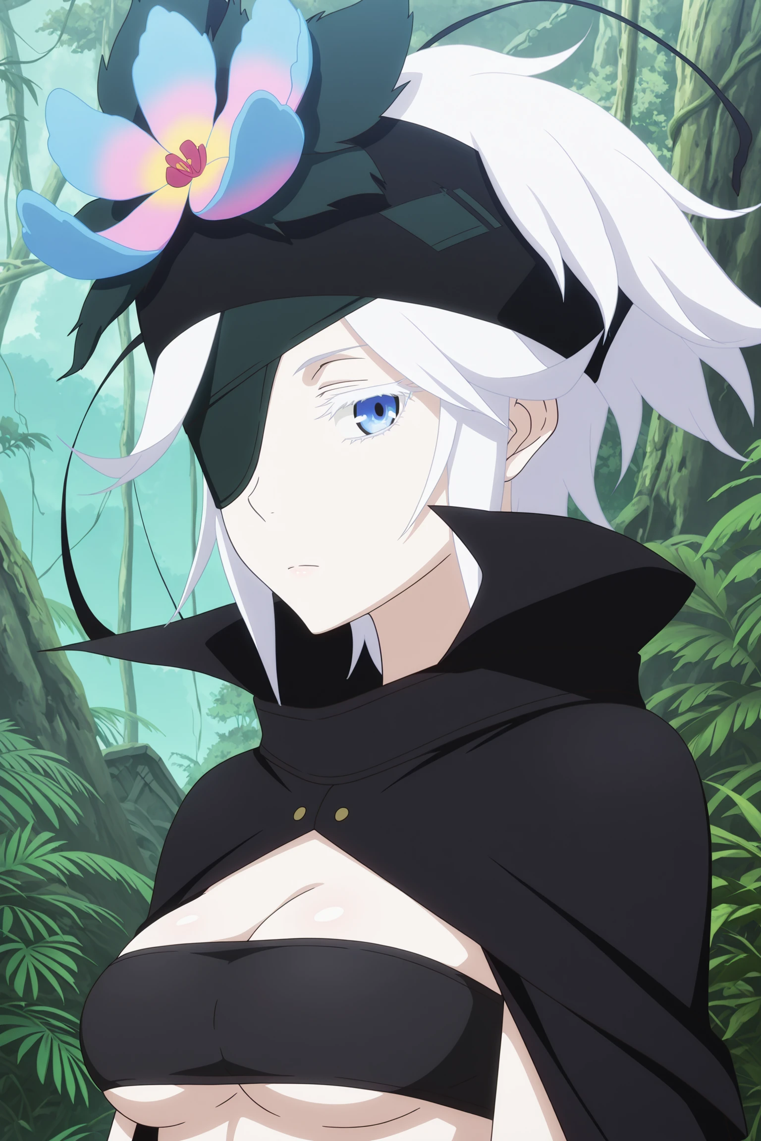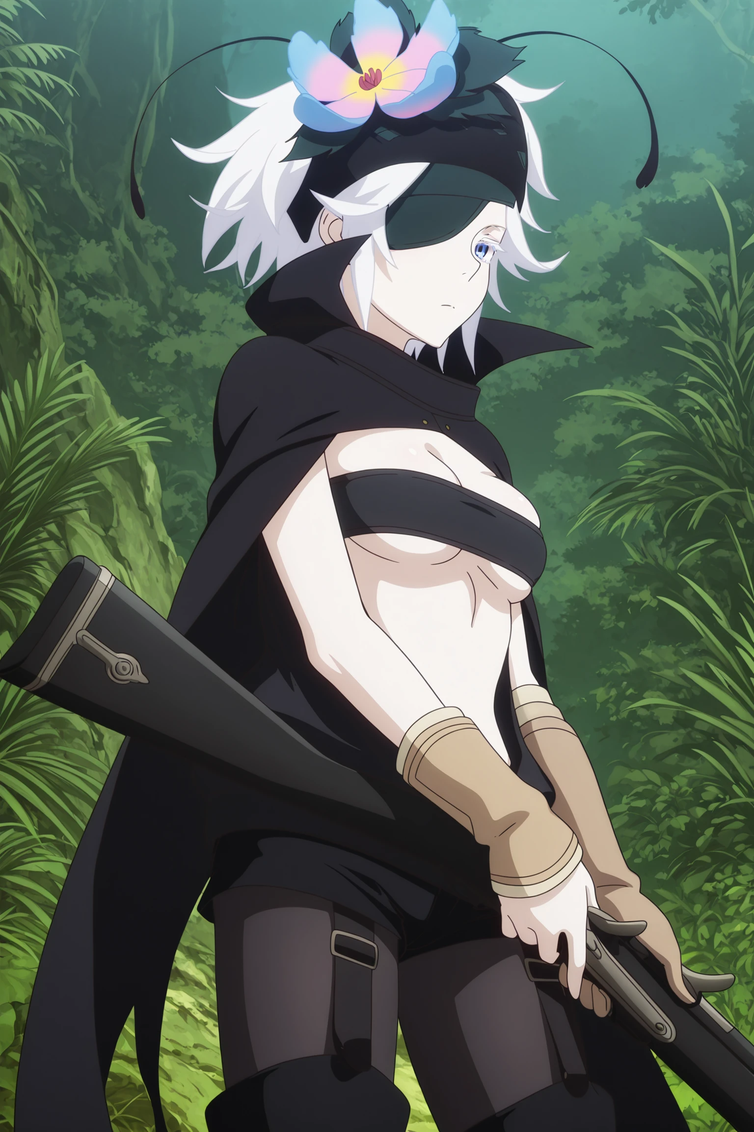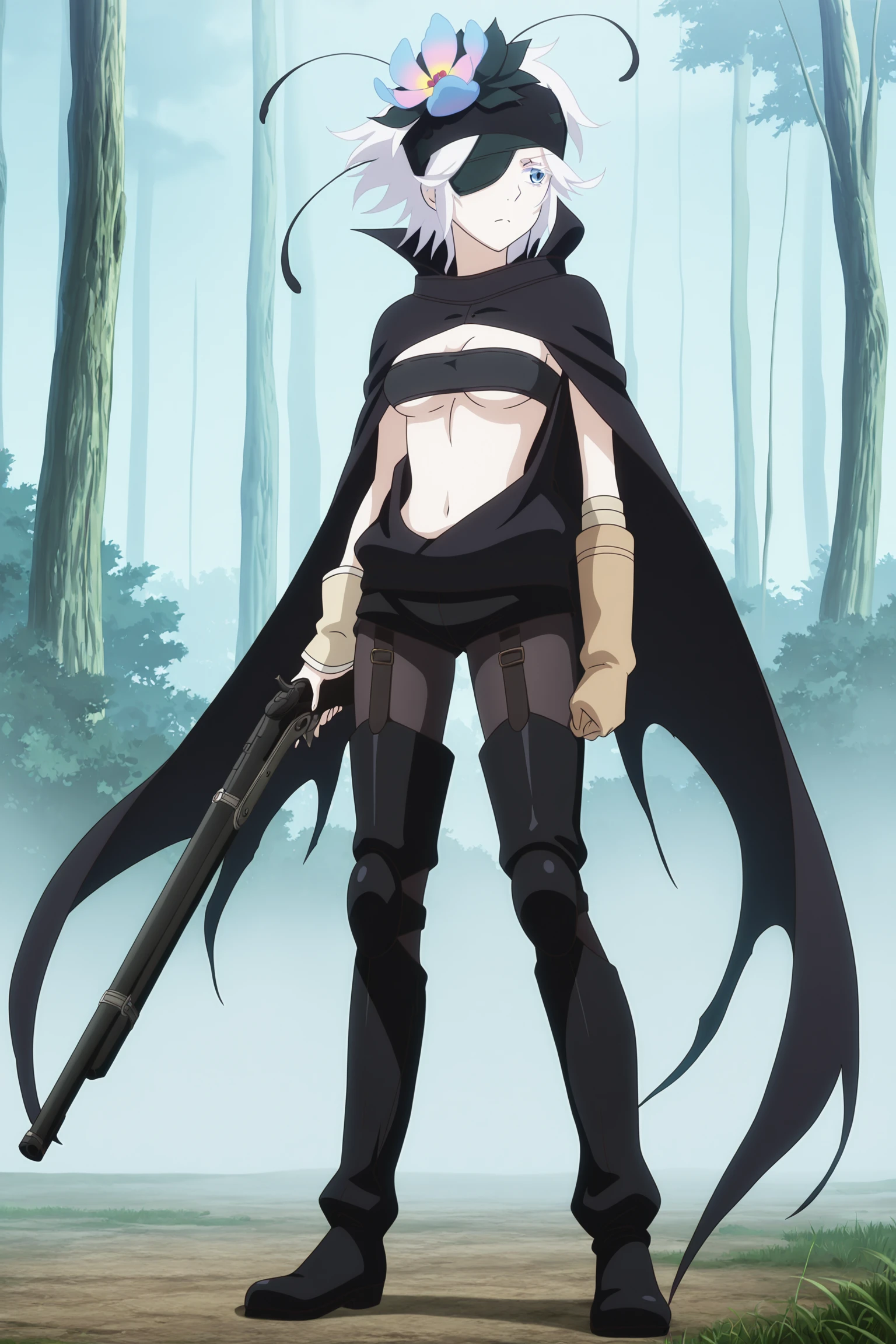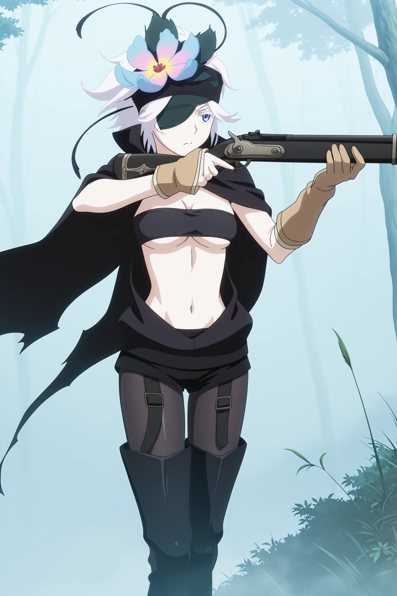 fremy speeddraw, short hair, white hair, headband, hair flower, hairband, eyepatch, white eyelashes, blue eyes, cape, tube top, black shirt, sleeveless, clothing cutout, single elbow glove, single arm warmer, black shorts, black pantyhose, fanny pack, black footwear, thigh boots, knee pads, garter strapswithout Eyepatch