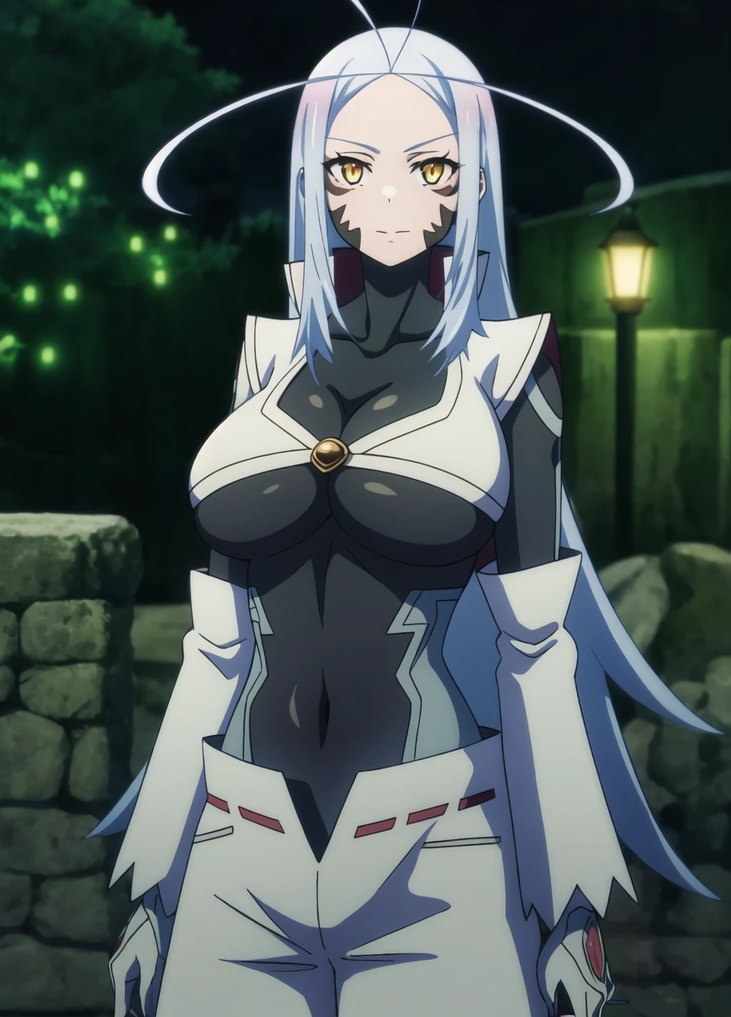 Trigger words: Aoba Wakura, colored skin, 1girl, solo, breasts, long hair, yellow eyes, antenna hair, white hair, large breasts, facial mark, dark skin,