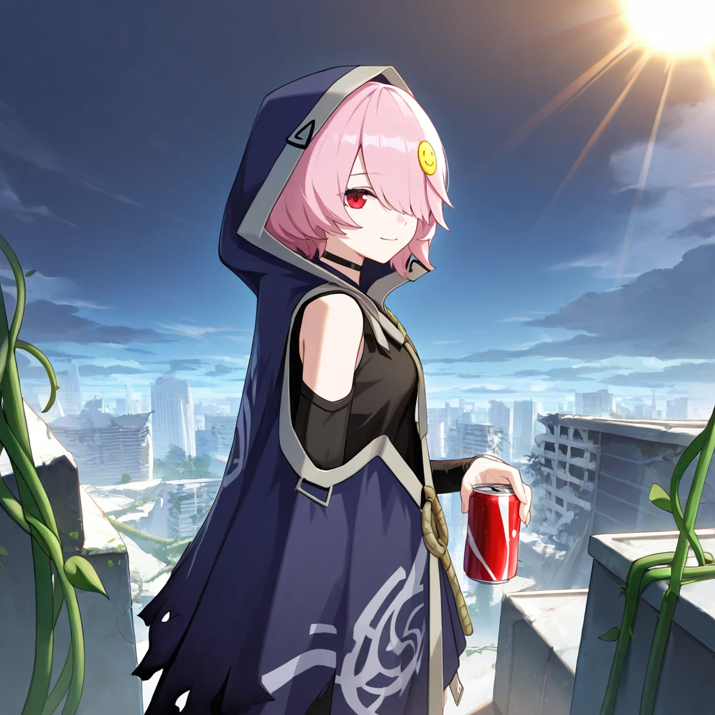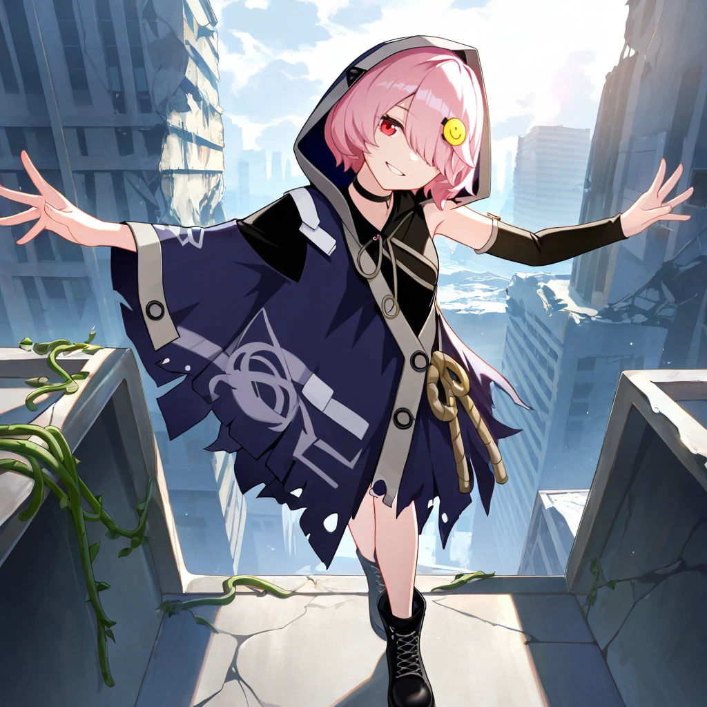 SoraHi3, pink hair, hair over one eye, red eyes, smiley hair ornament, dark blue cloak, hooded cloak, torn cloak, hood up, single bare shoulder, black shirt, single sleeve, black choker, black sleeves, asymmetrical clothes, grey trim, rope, single arm warmer, black arm warmers, straps,black footwear, cross-laced boots, ankle boots, The results of your generations are dependent on the additional LoRAs, weights, and models you use, so it may not work or come out as consistent as my sample images.