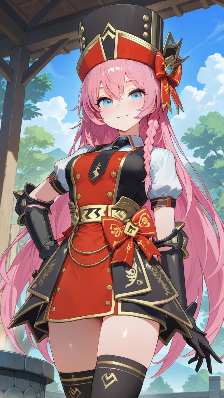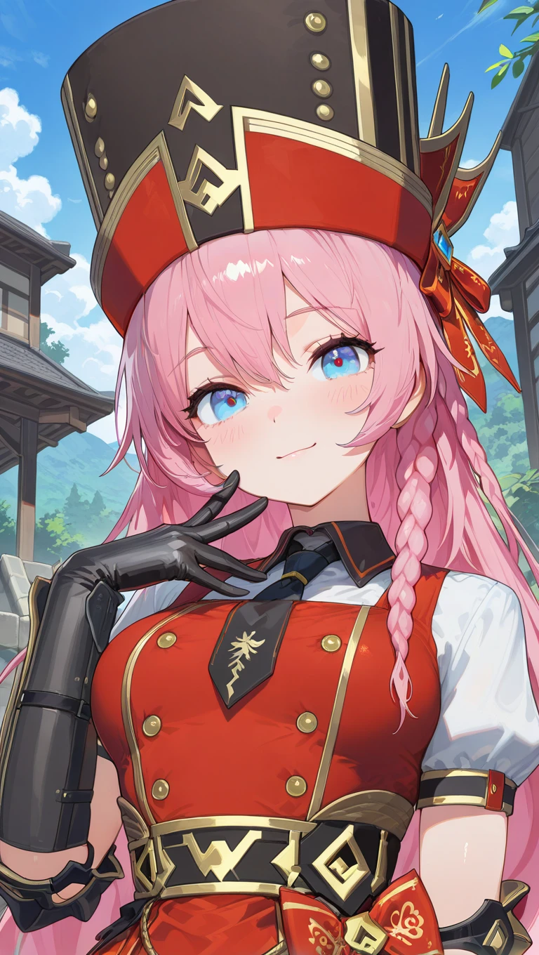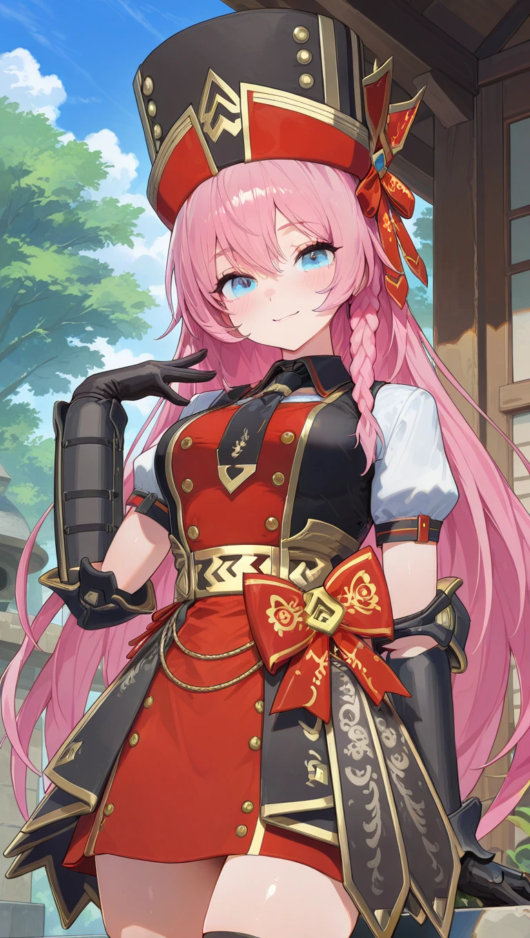 hat,black headwear,very long hair,pink hair,braid,hair between eyes,blue eyes