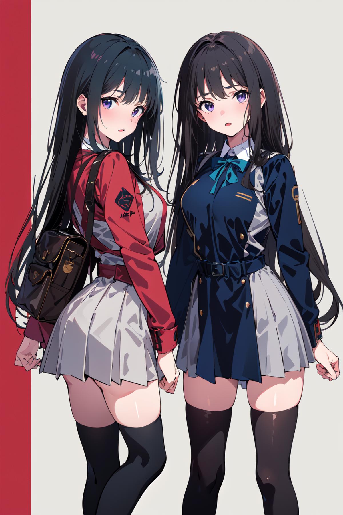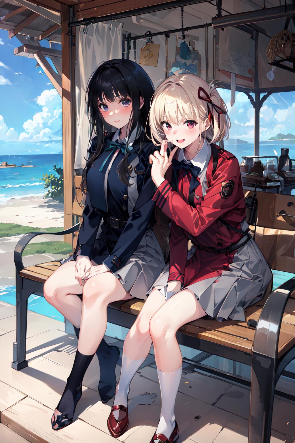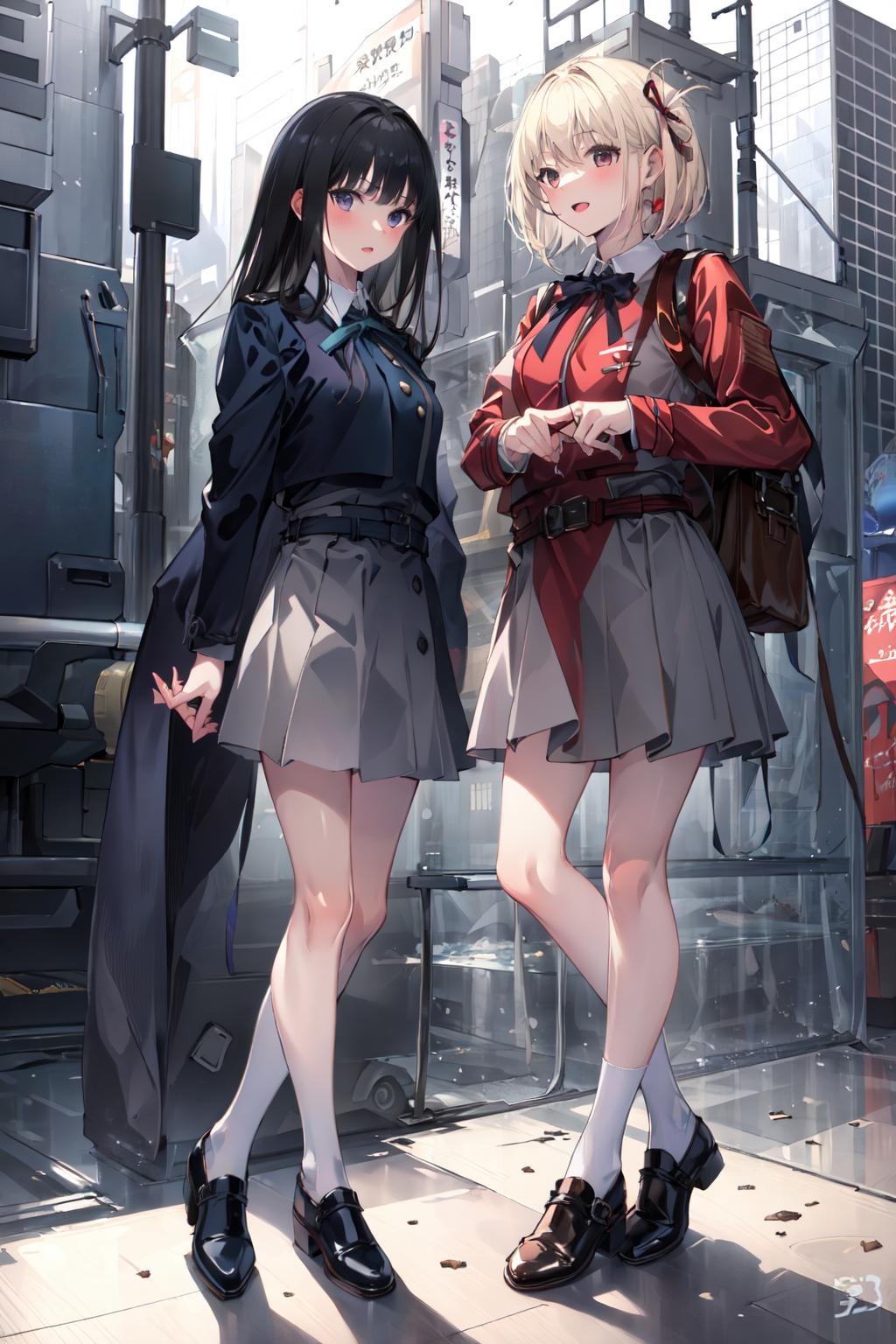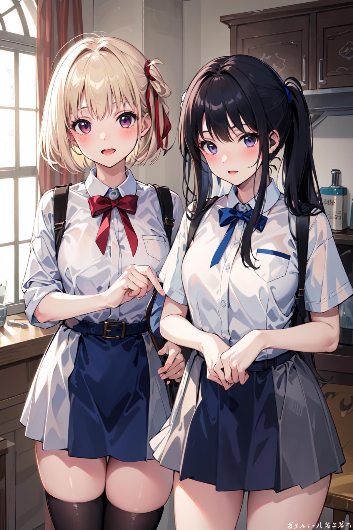 nishikigi chisato, multiple girls, inoue takina, lycoris uniform (can be swapped for whatever you want, less than a bunny, or none at all),