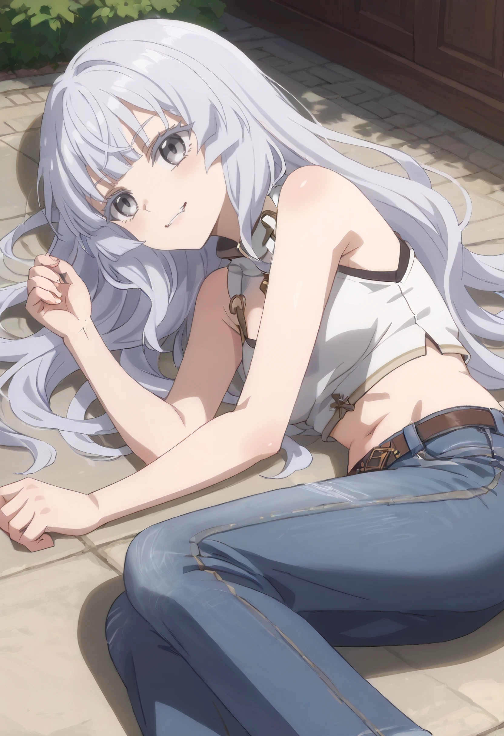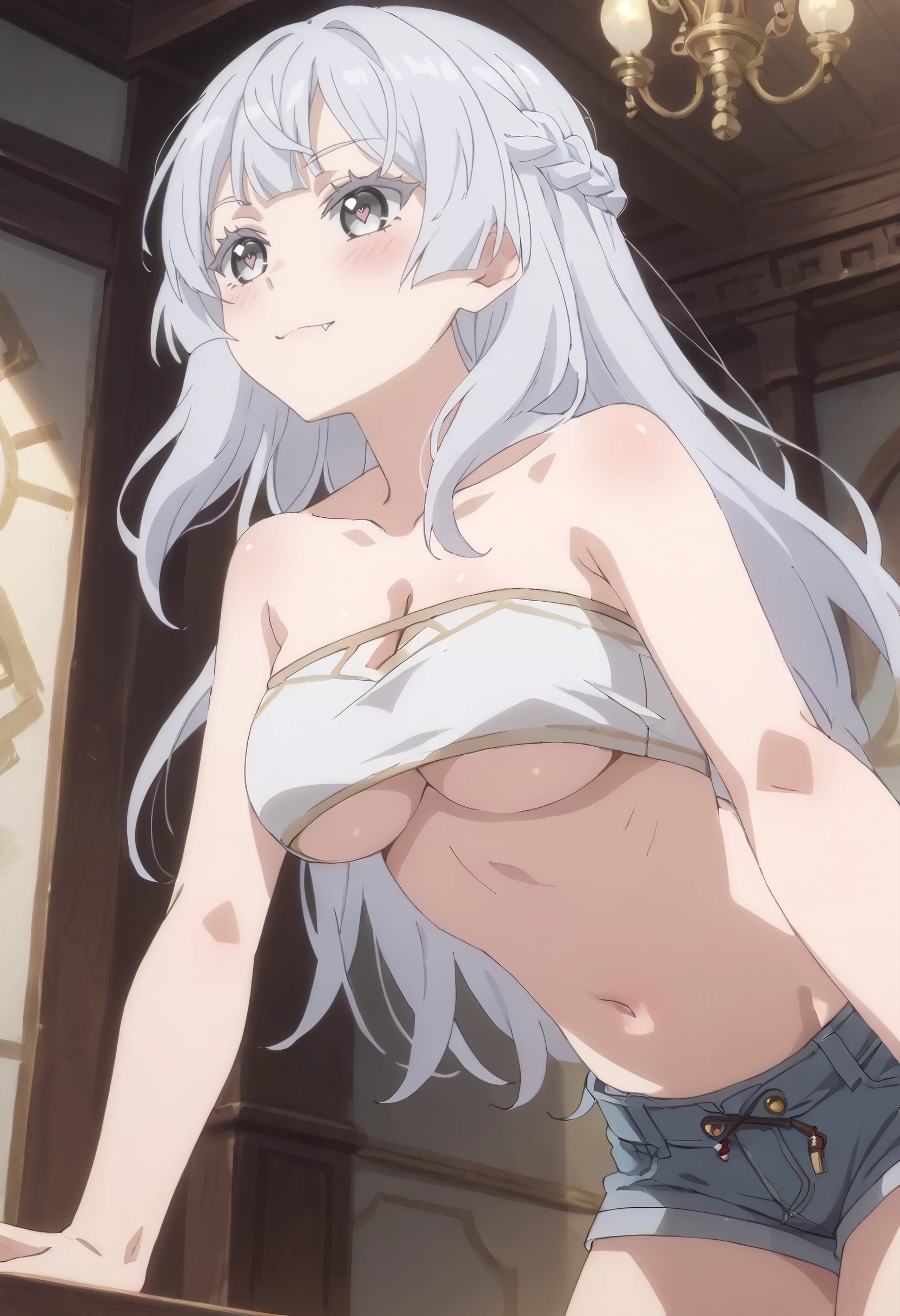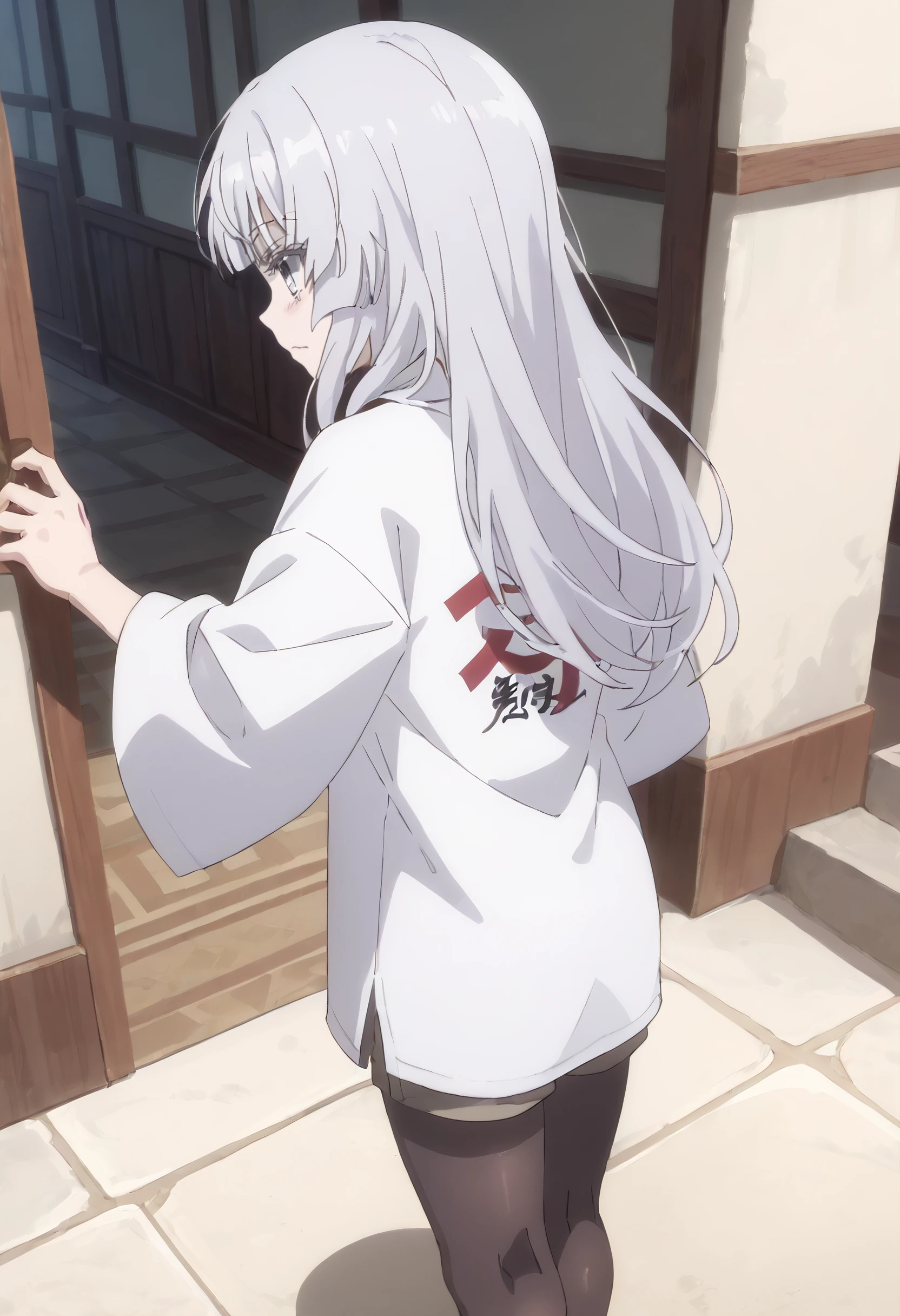 AMGChloe, long hair, bangs, eyebrows visible through hair, grey eyes, blunt bangs, silver hair,