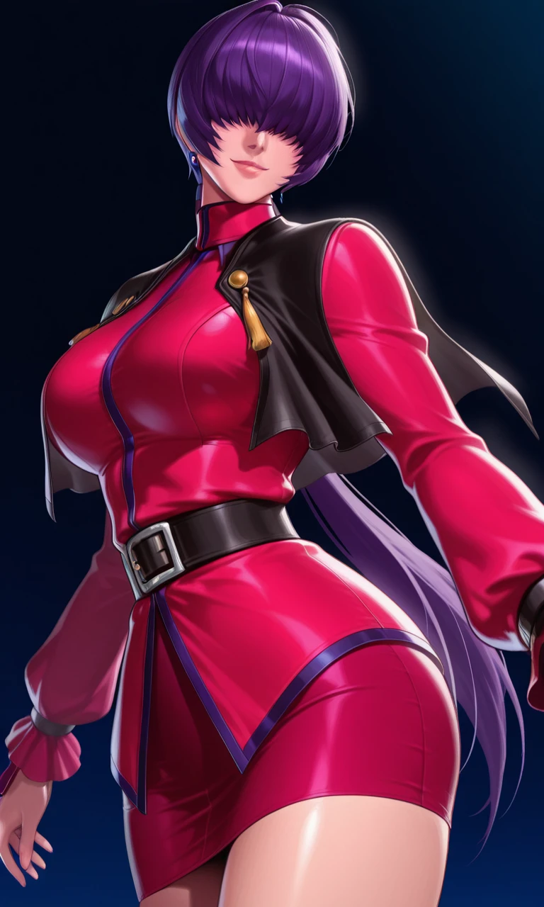 Orochi Shermie, 1girl, solo, purple hair, hair over eyes, split ponytail, clothing cutout,nose, lips, earrings, jewelry, leotard, red jacket, long sleeves,Belt, black belt,red skirt, miniskirt,