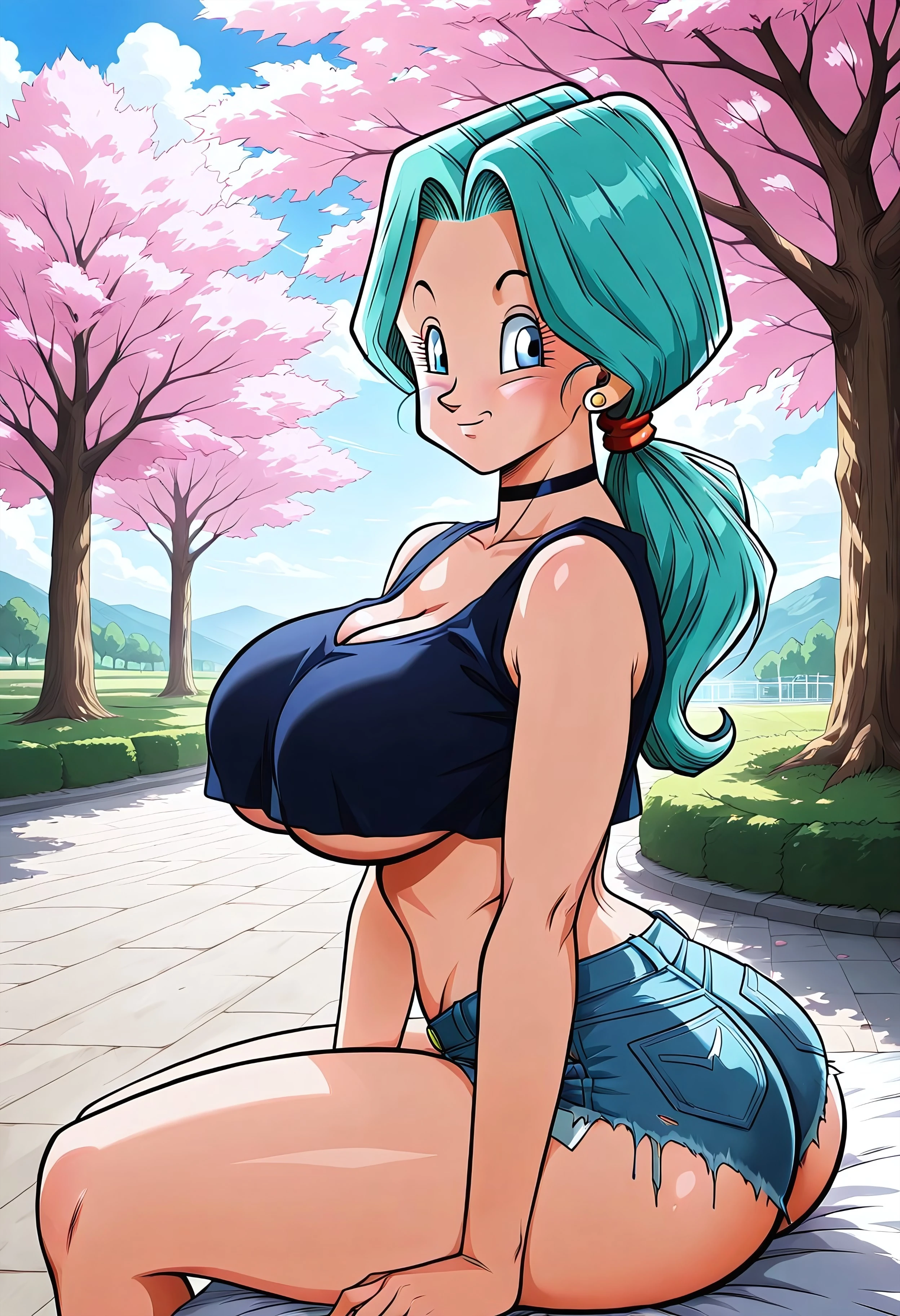 IllusFutureBulma, blue eyes, aqua hair, long hair, ponytail, jewelry, earrings