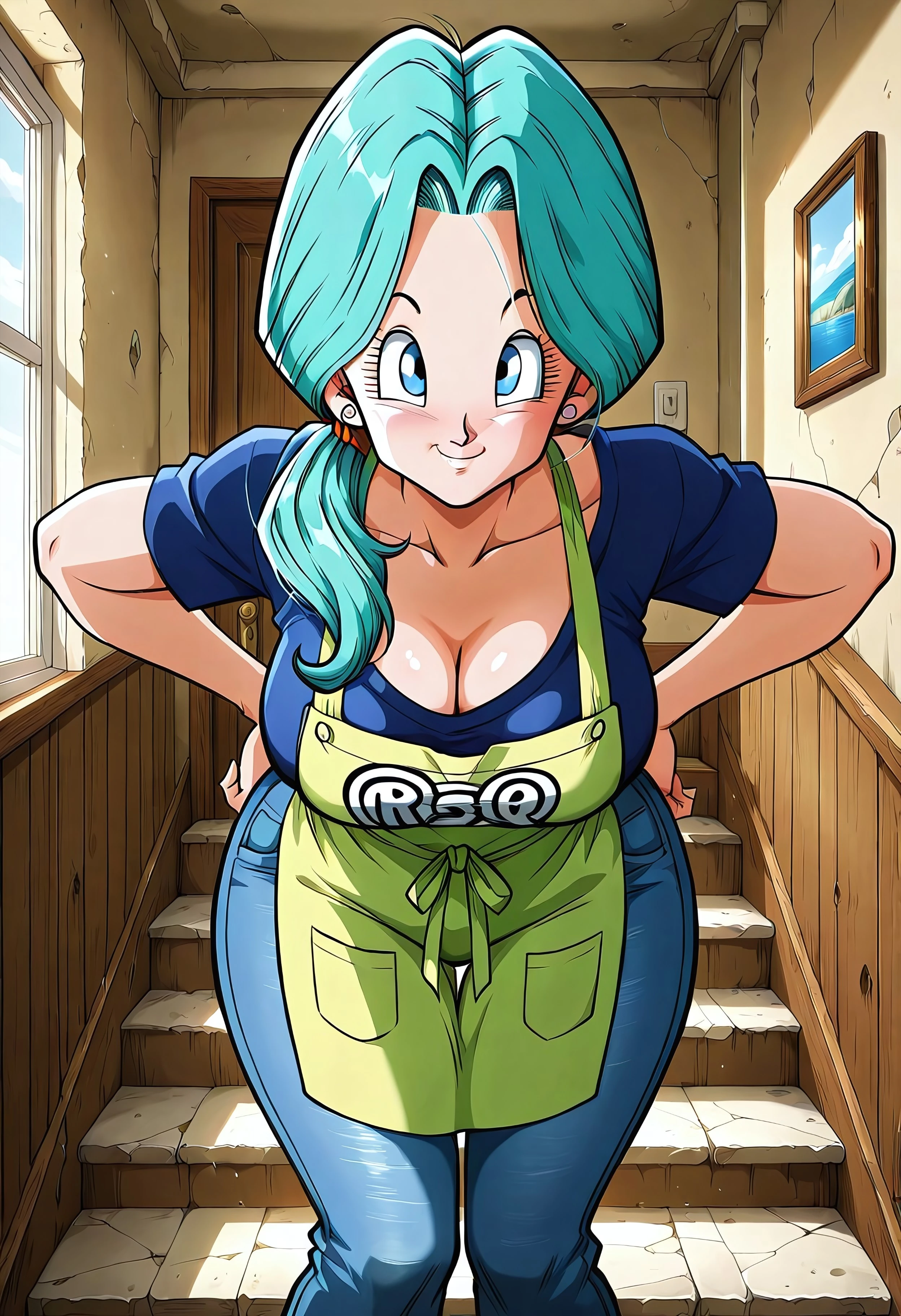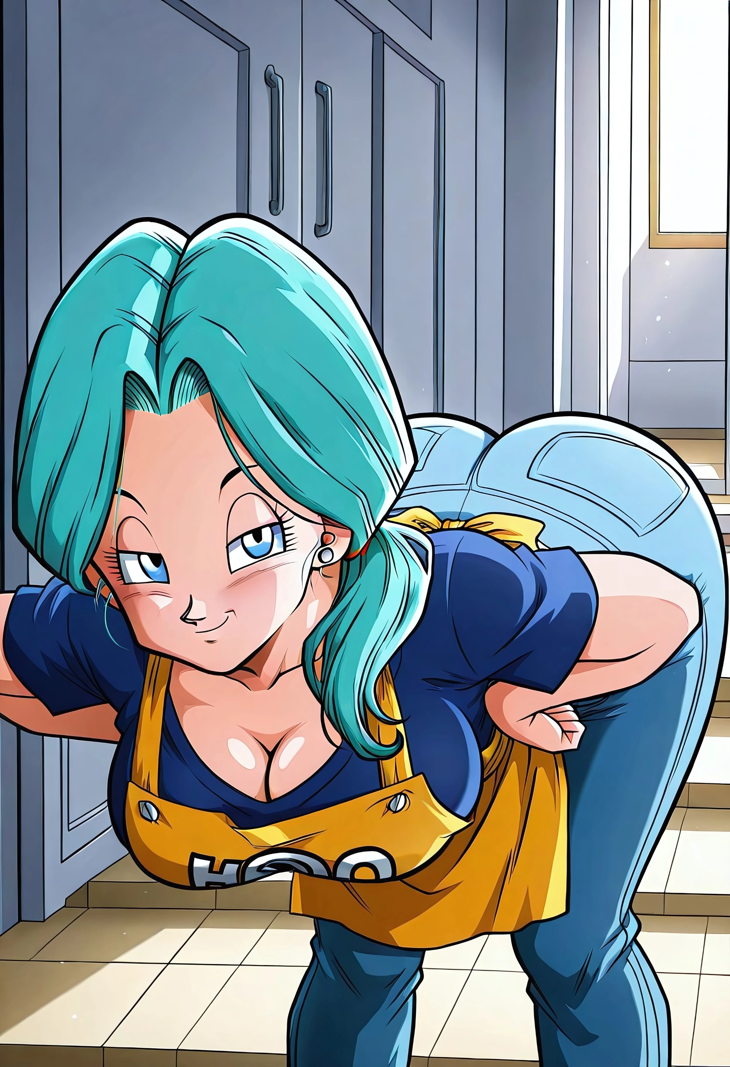 blue t-shirt, jeans, apron