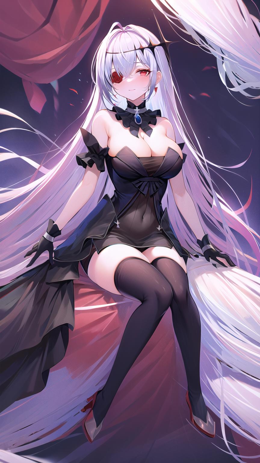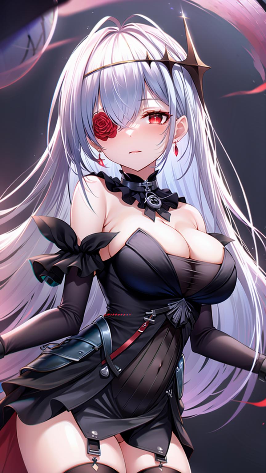 masterpiece, best quality, (1girl, solo), red eyes, red flower, red rose, white hair, black dress, black thighhighs, black gloves, flower over eye, hair ornament, bare shoulders, cleavage, strapless dress, eyepatch, hair between eyes, ahoge, flower, detached collar, <lora:EmdenV1.0:0.8>, ironemdenschwarz,