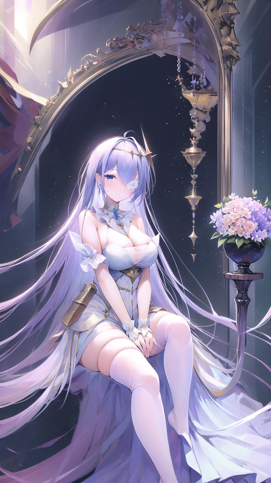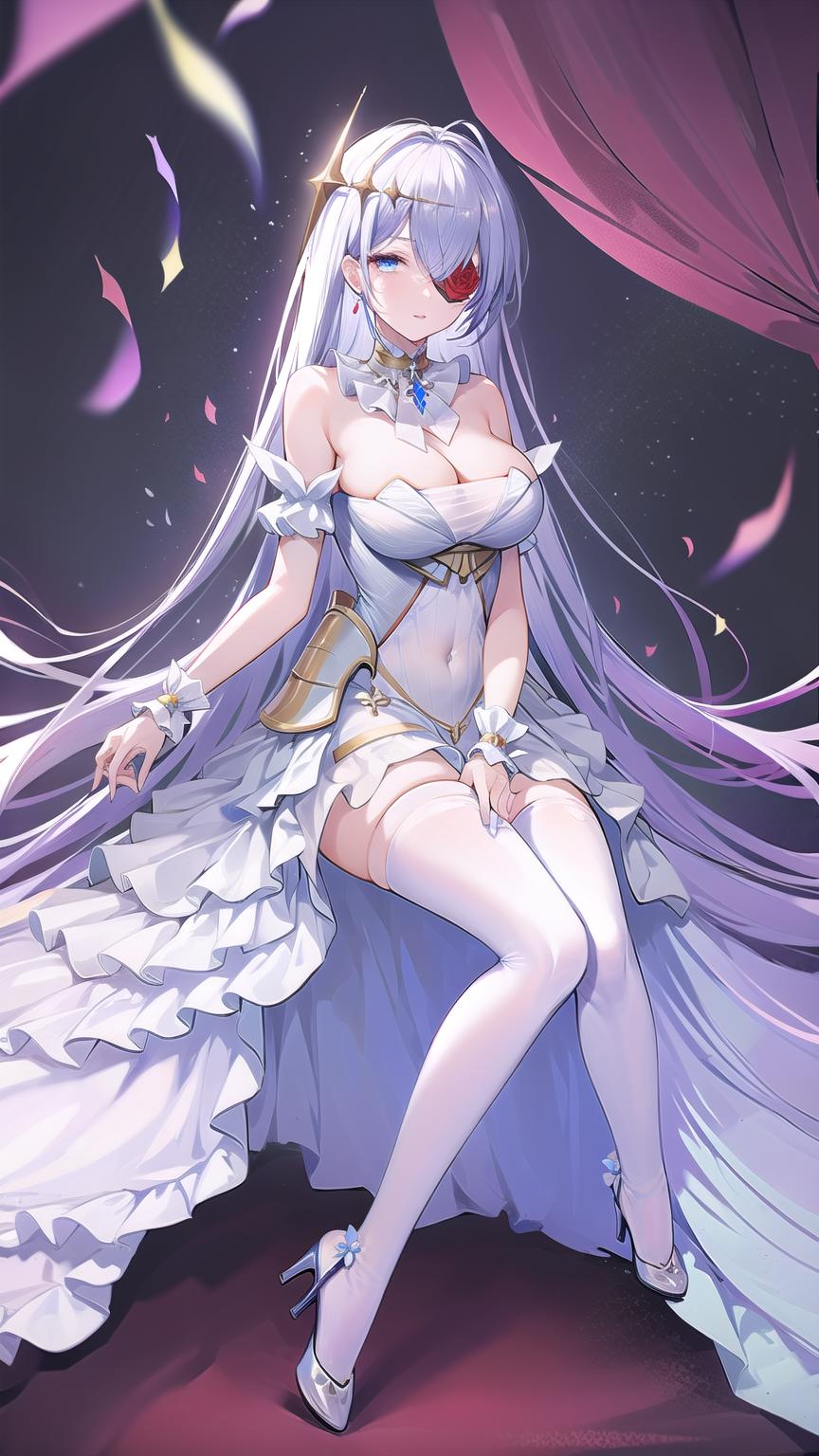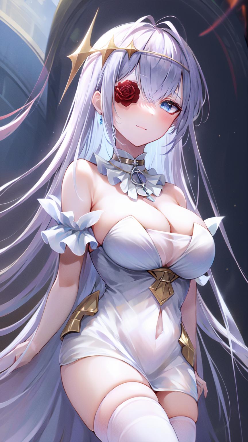 masterpiece, best quality, (1girl, solo), white rose, blue eyes, white dress, white hair, white thighhighs, white flower over eye, hair ornament, bare shoulders, cleavage, strapless dress, eyepatch, hair between eyes, ahoge, detached collar, <lora:EmdenV1.0:0.8>, ironemdenweiß,