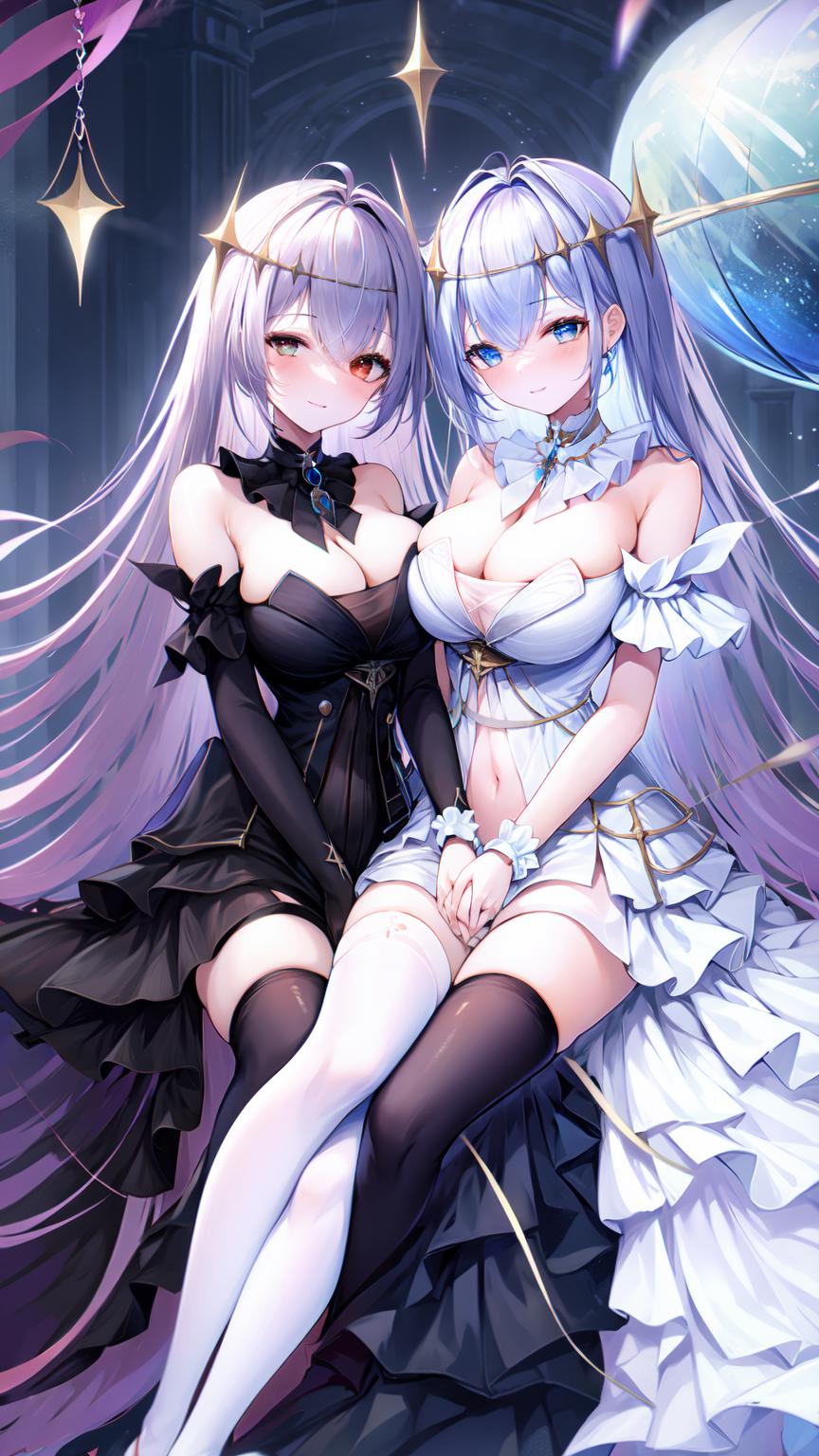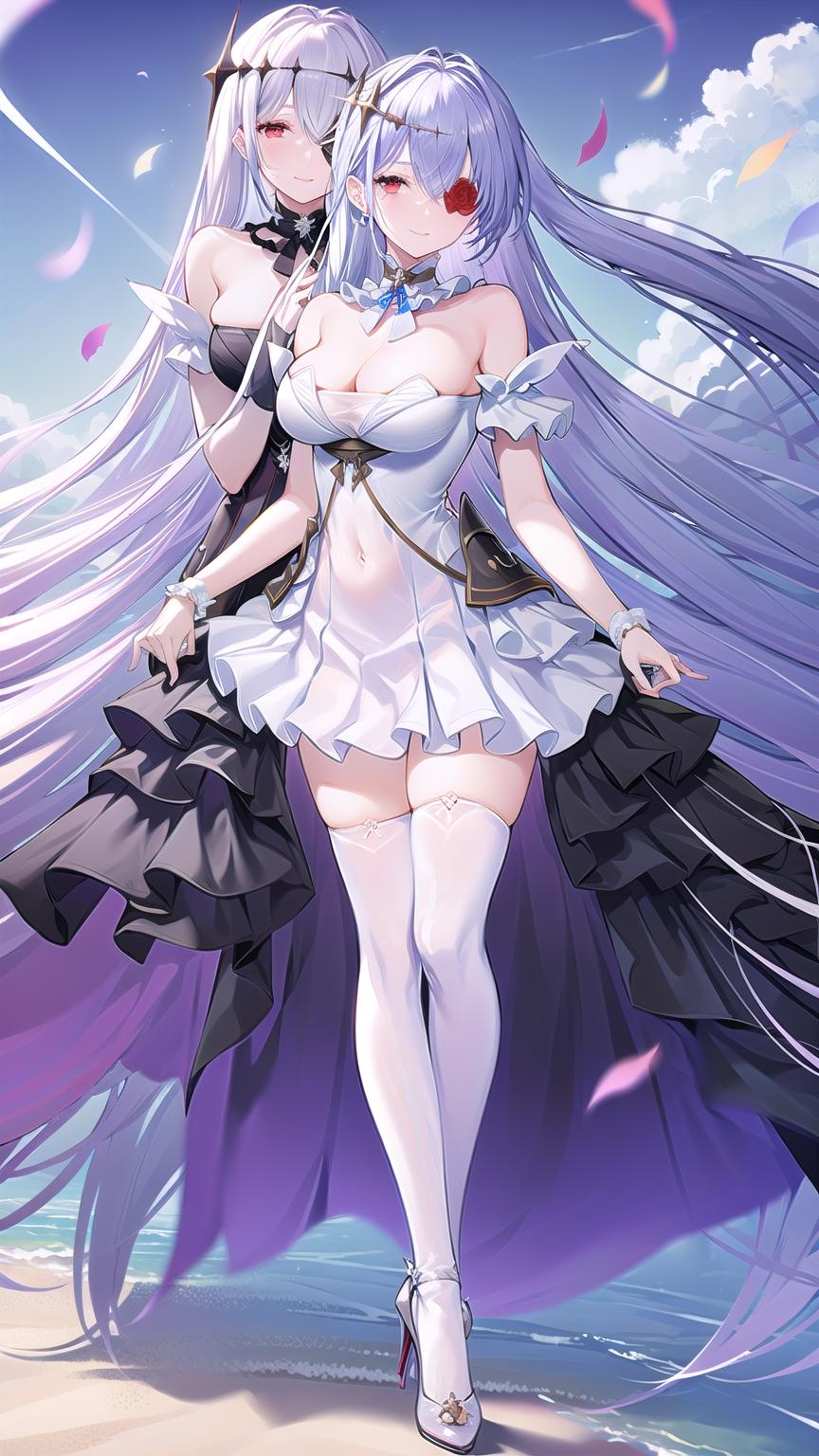 (2girls, multiple girls:1.2), flower, breasts, red flower, white flower, flower over eye, dress, black dress, long hair, rose, red eyes, red rose, blue eyes, thighhighs, white dress, white rose, white hair, very long hair, bare shoulders, bangs, hair ornament, eyepatch, white thighhighs, black gloves, <lora:EmdenV1.0:0.8>, (ironemdenbeide:1.2), full body, blue sky, clouds, sky background, standing on beach,