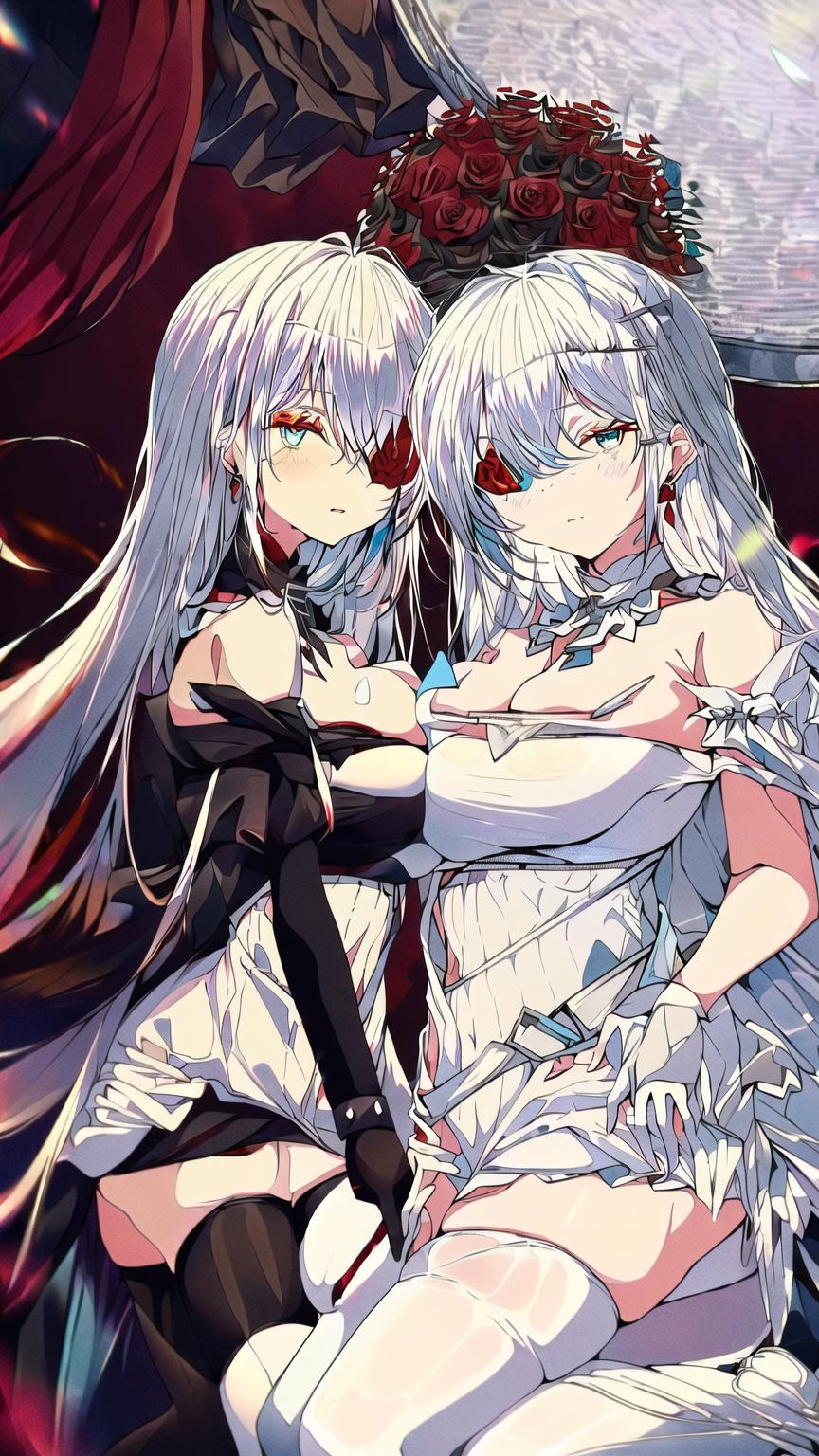 masterpiece, best quality, (((2girls, multiple girls))),((red eyes, red flower, red rose, white hair, black dress, black thighhighs, black gloves, flower over eye), (white flower, white rose, blue eyes, white dress, white hair, white thighhighs, flower over eye)),<lora:EmdenV1.0:0.8>, ironemdenbeide,
