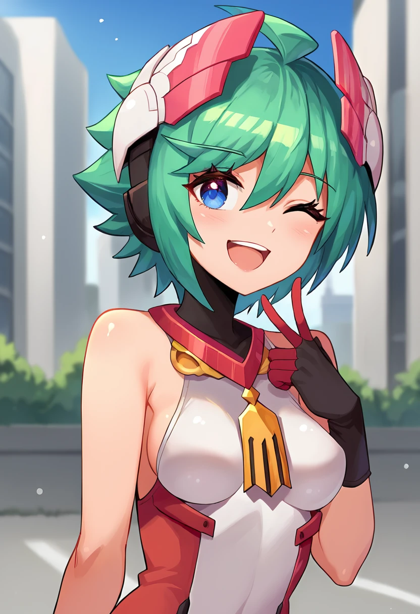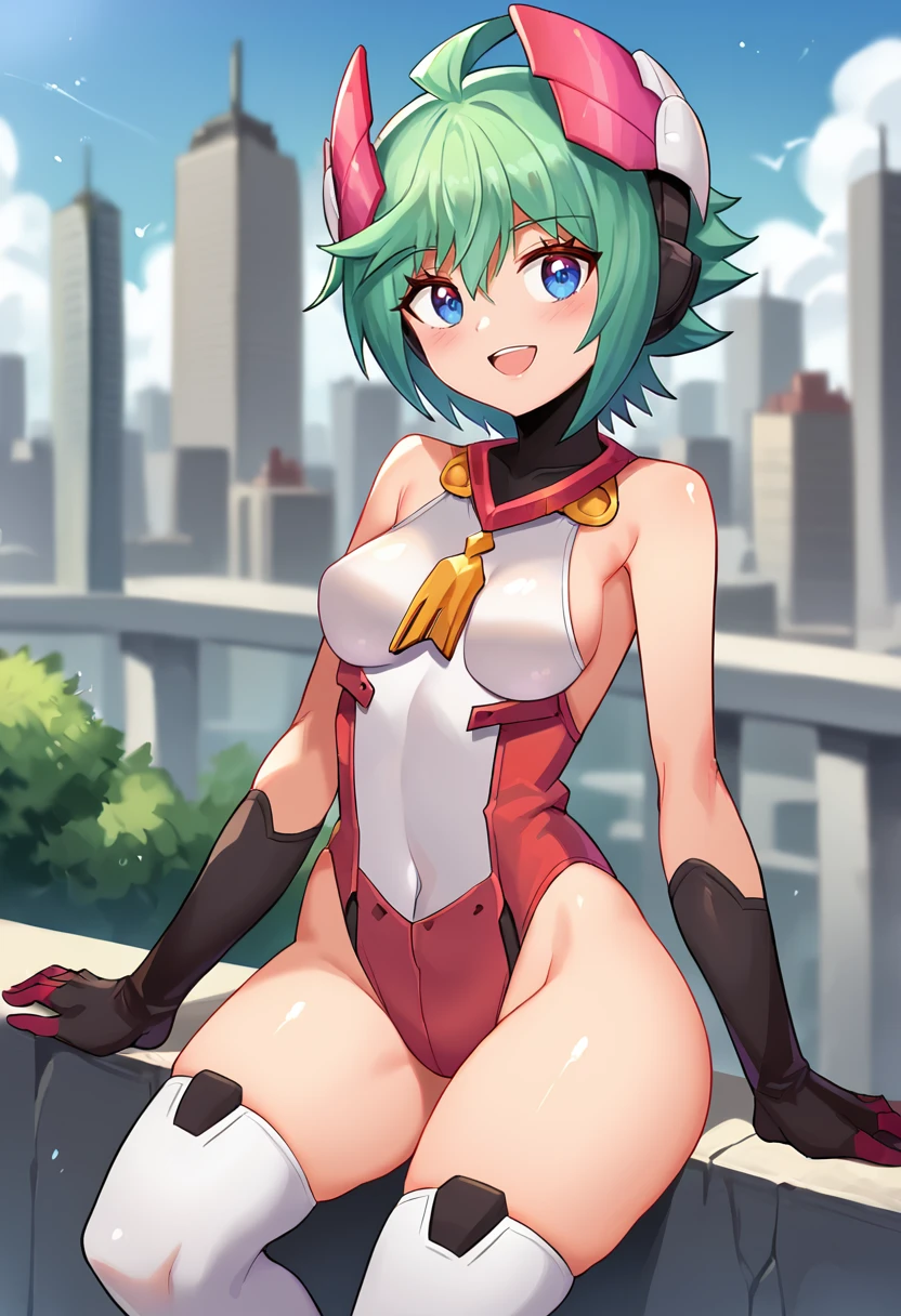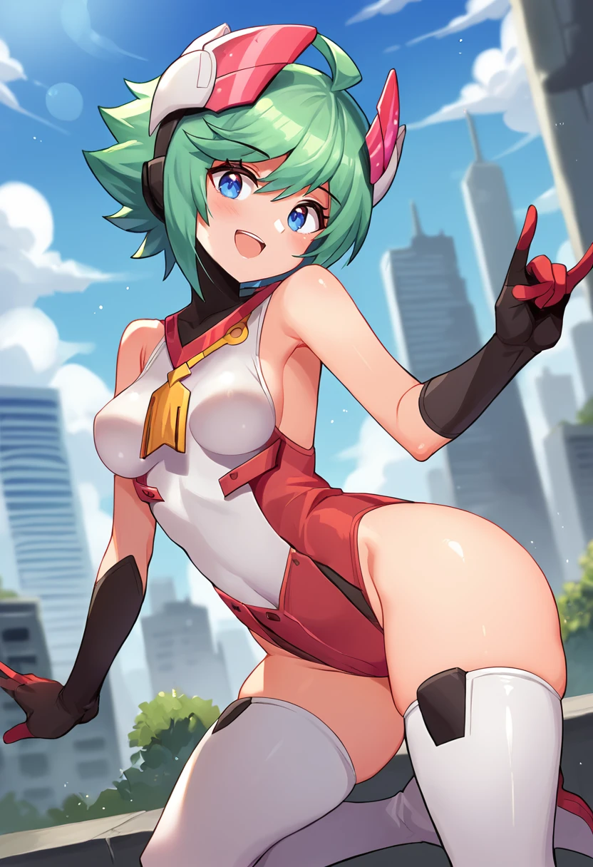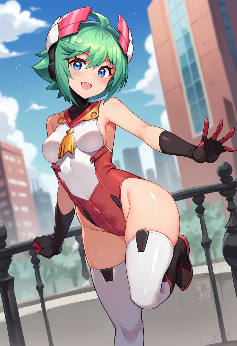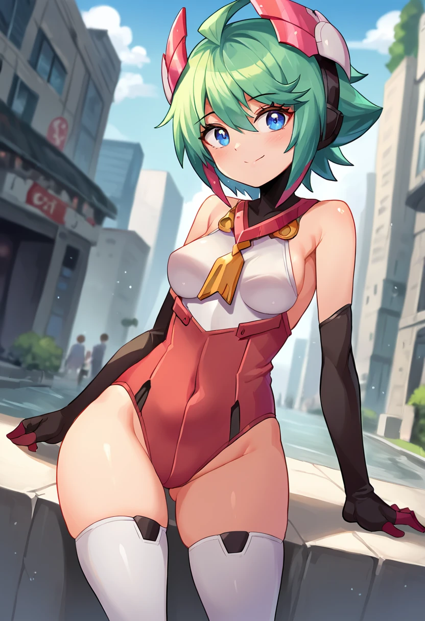 score_9, score_8_up, score_7_up, masterpiece, source_anime, 1girl, ct_ror0, green hair, short hair, blue eyes, ahoge, headgear, medium breasts, leotard, gold ascot, black turtleneck, elbow gloves, white thigh boots, looking at viewer, outdoors, city, depth of field, cowboy shot, Negative prompt ❌: