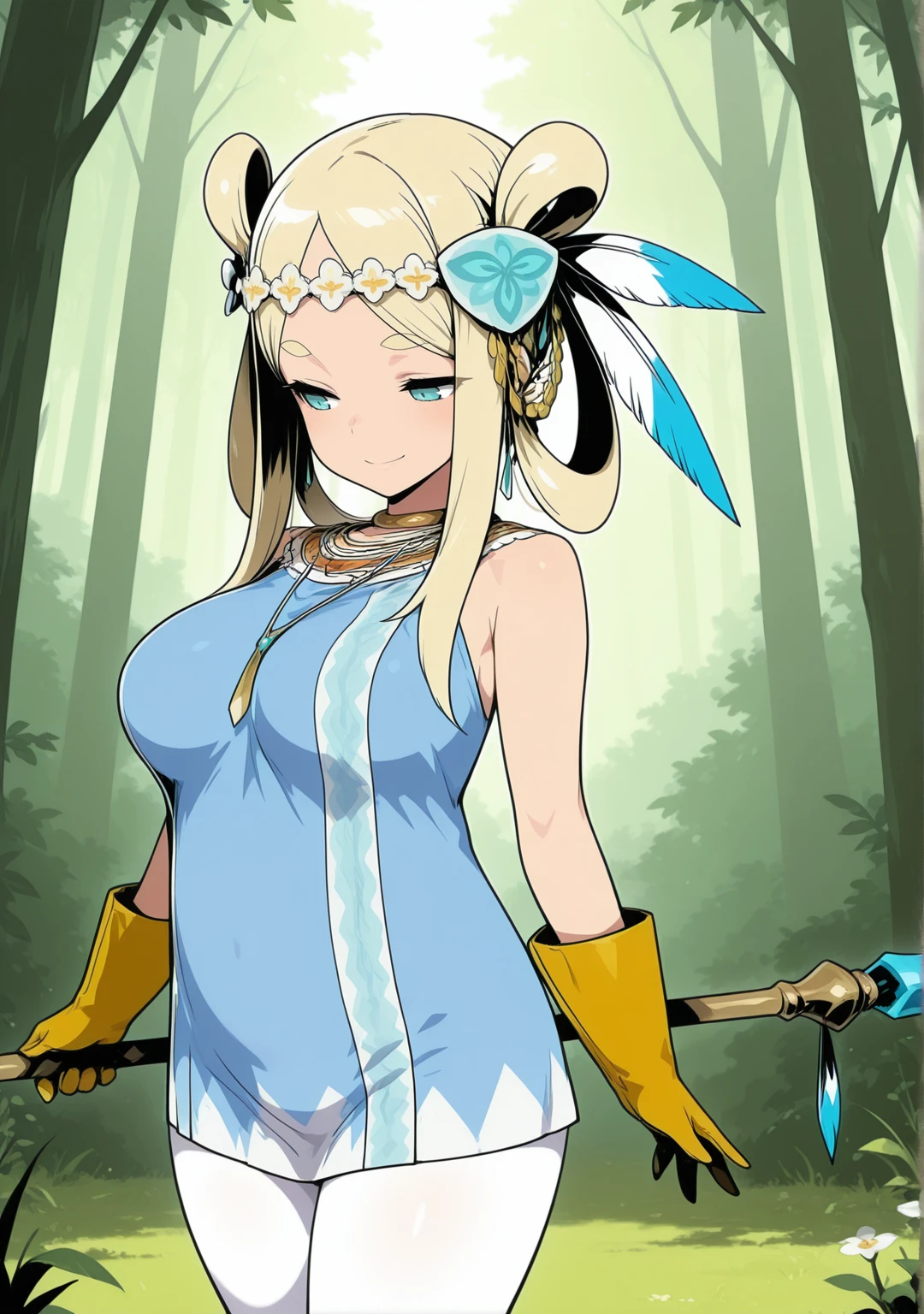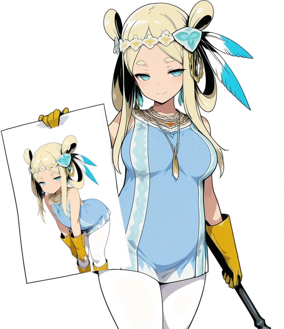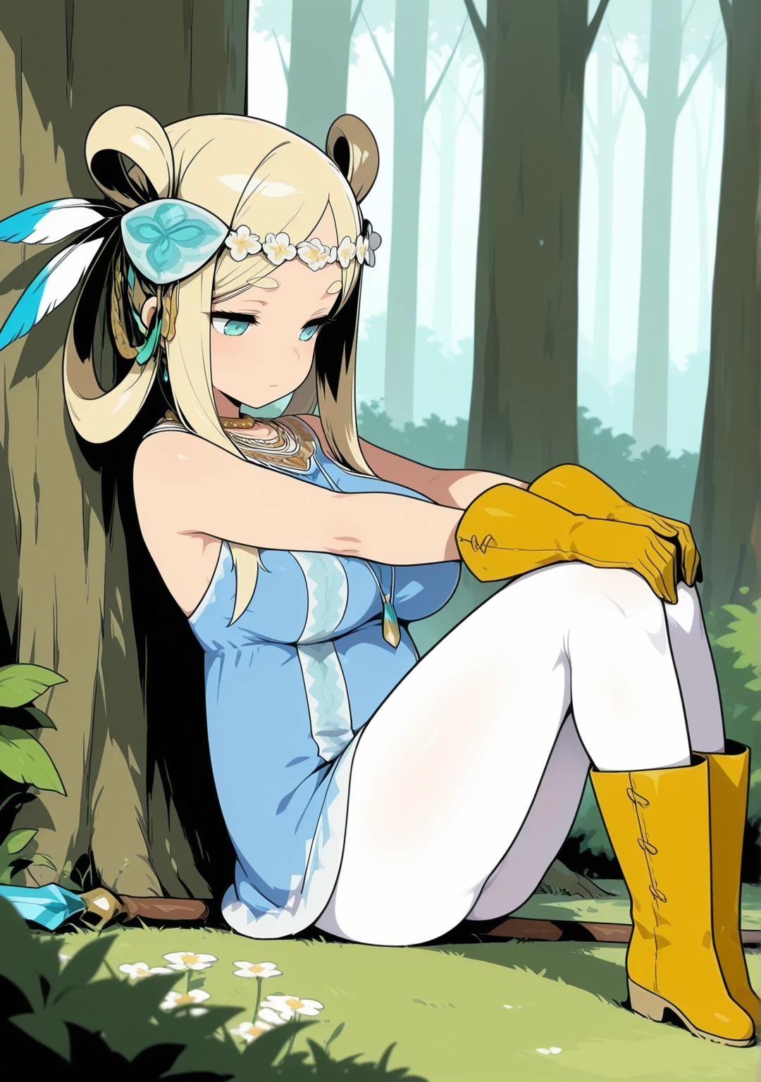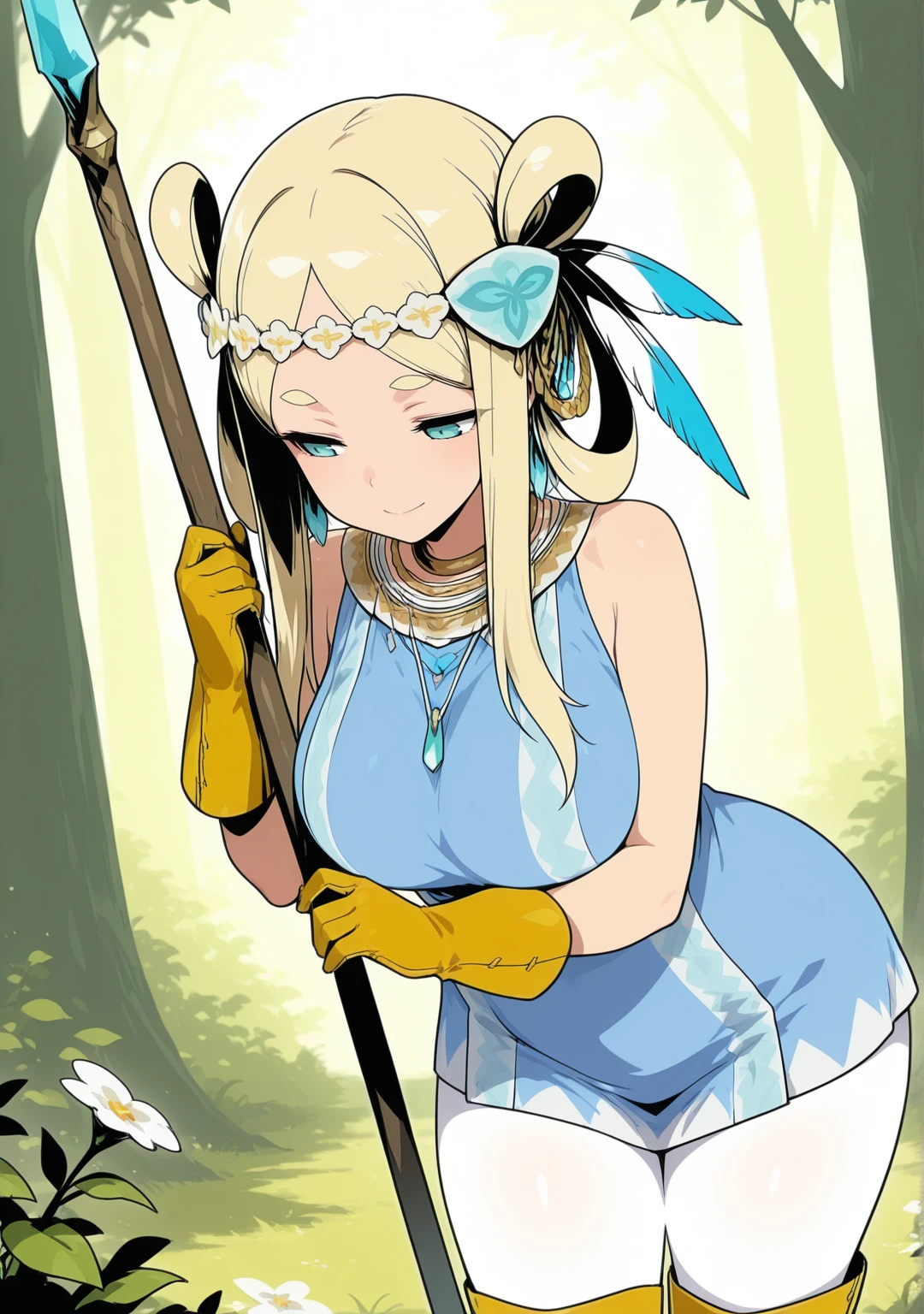 recommend:aqua eyes,blonde hair,blue eyes,sidelocks,parted bangs,short dress,head wreath,yellow footwear,boots,blue dress,sleeveless dress,bare shoulders,feathers,white flower,feather hair ornament,hair rings,headdress,jewelry,long hair,necklace,polearm,thick eyebrows,white pantyhose,yellow gloves,