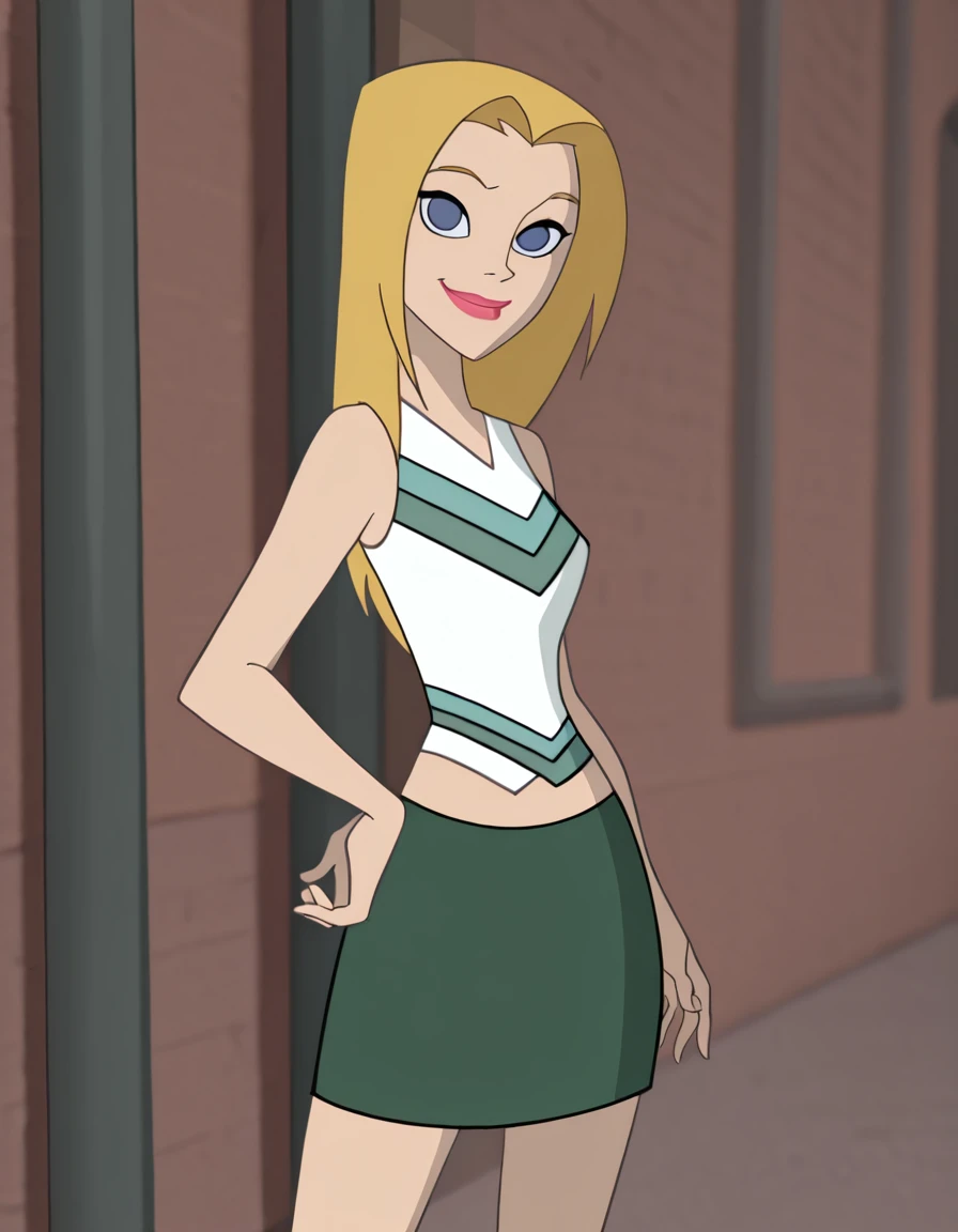 shirt, sleeveless, green skirt,midriff