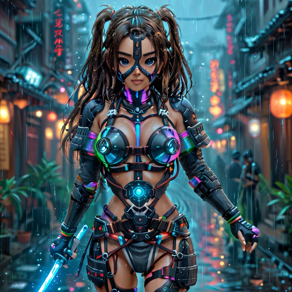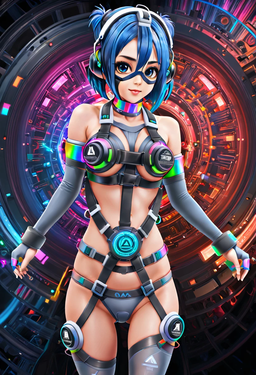 Typical look: 1girl, speakini, multicolor long hair, orange hair, twintails, slight smile, mask, face straps, bra, bare shoulders, wristbands, dark gray elbow gloves, dark gray thighhighs, fingerless gloves, neck choker, vibrator, harness, headphones, cybernetics
