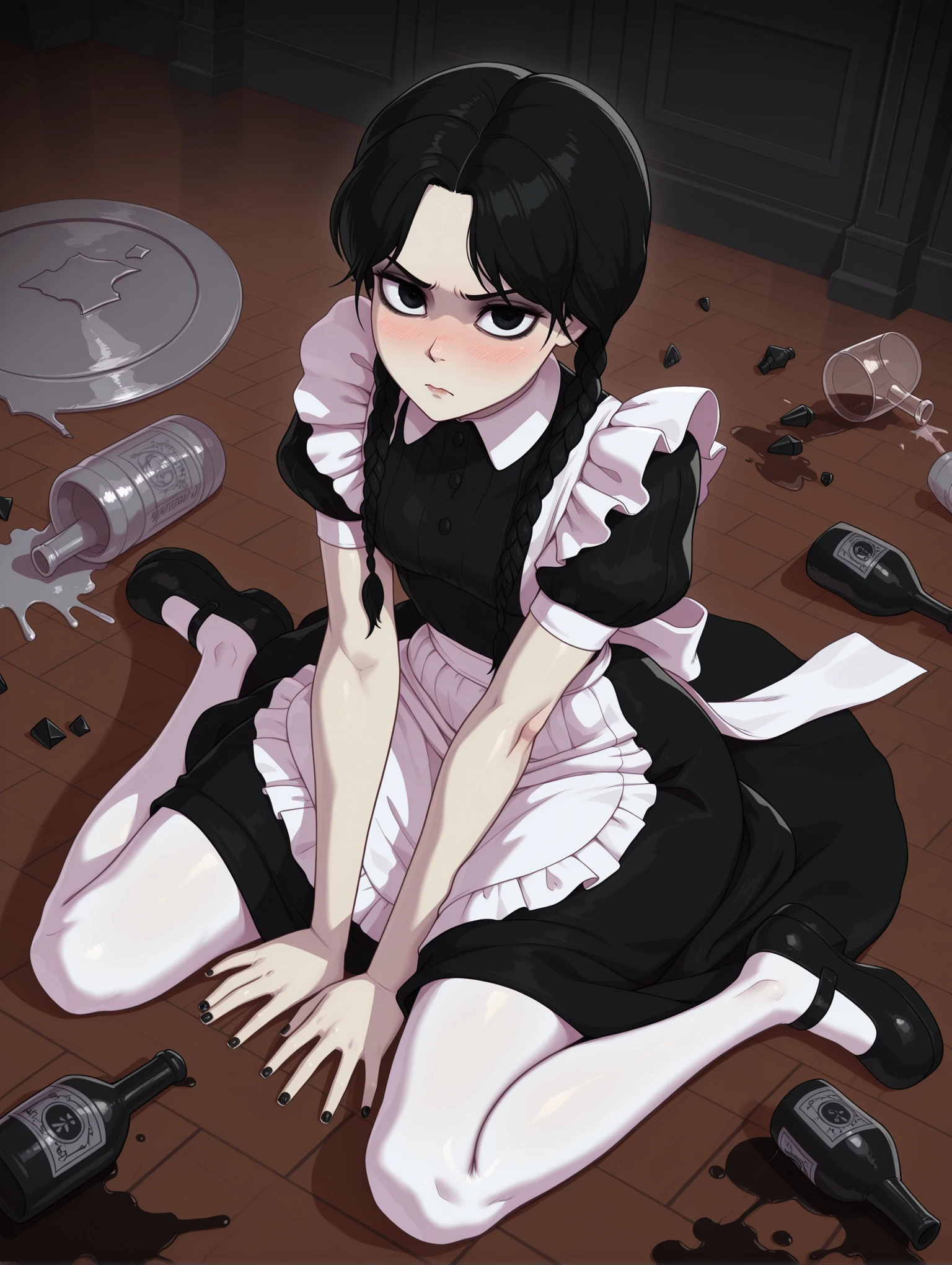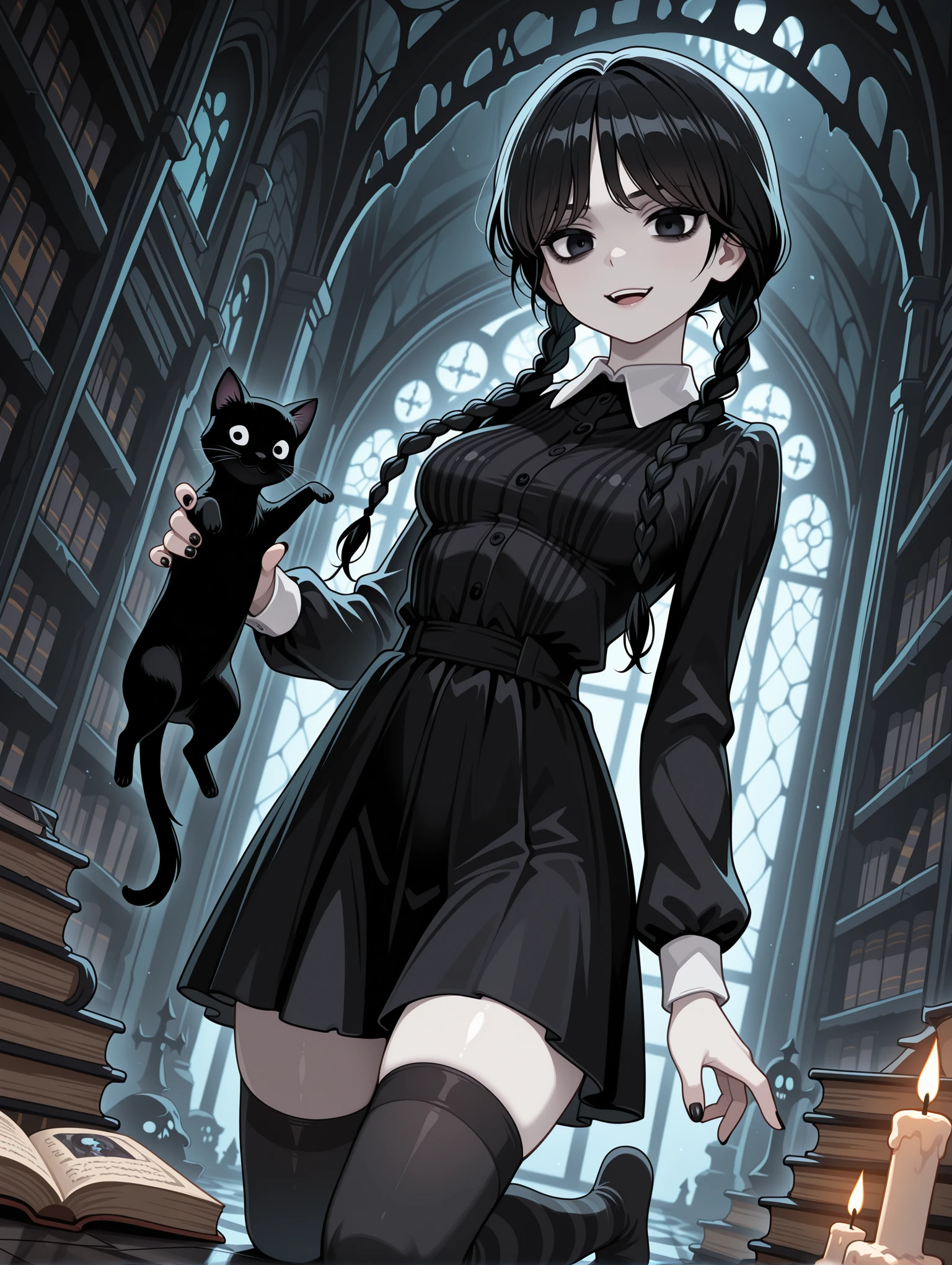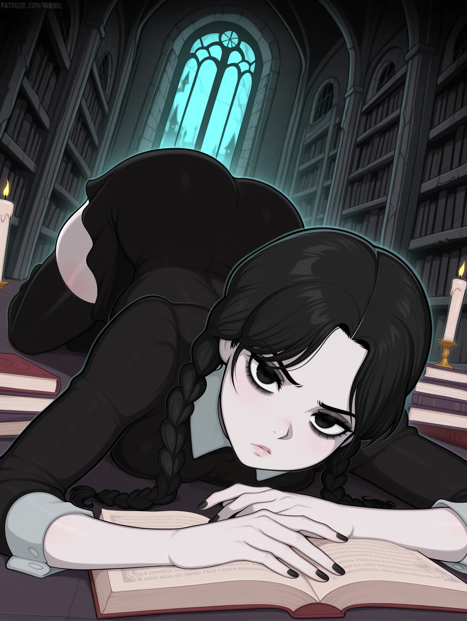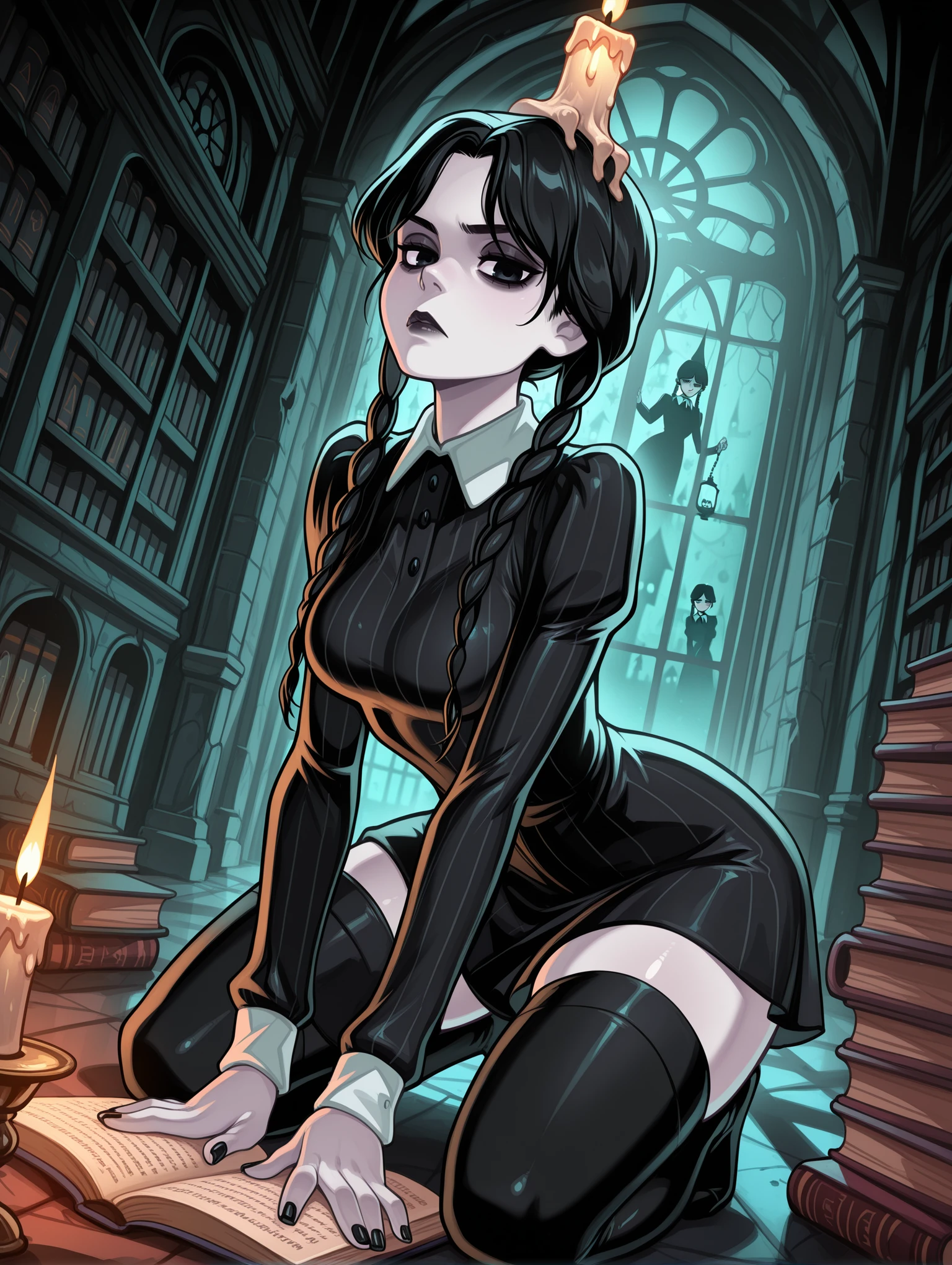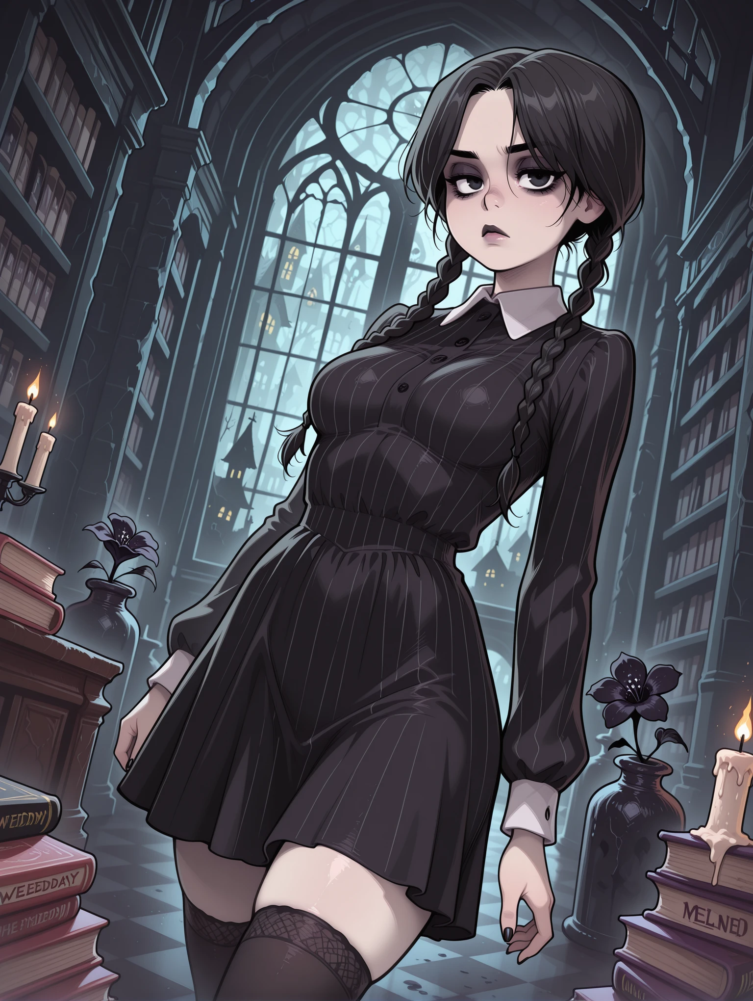 Appearance: wedaddams, wednesday addams, black hair, twin braids, pale skin, black eyes, nail polish, black nails,
