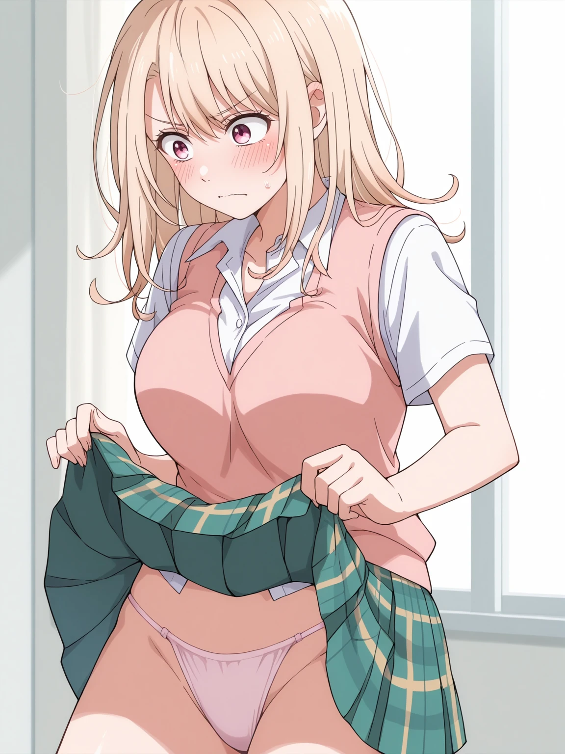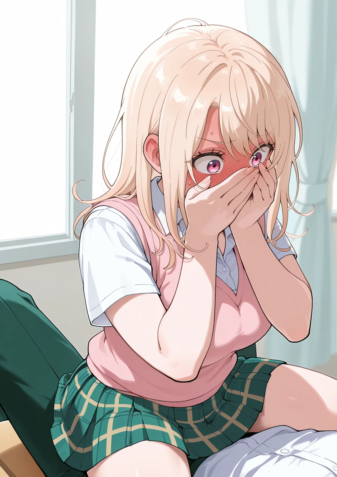 school uniform, white shirt, sweater vest, green skirt, pleated skirt, plaid skirt