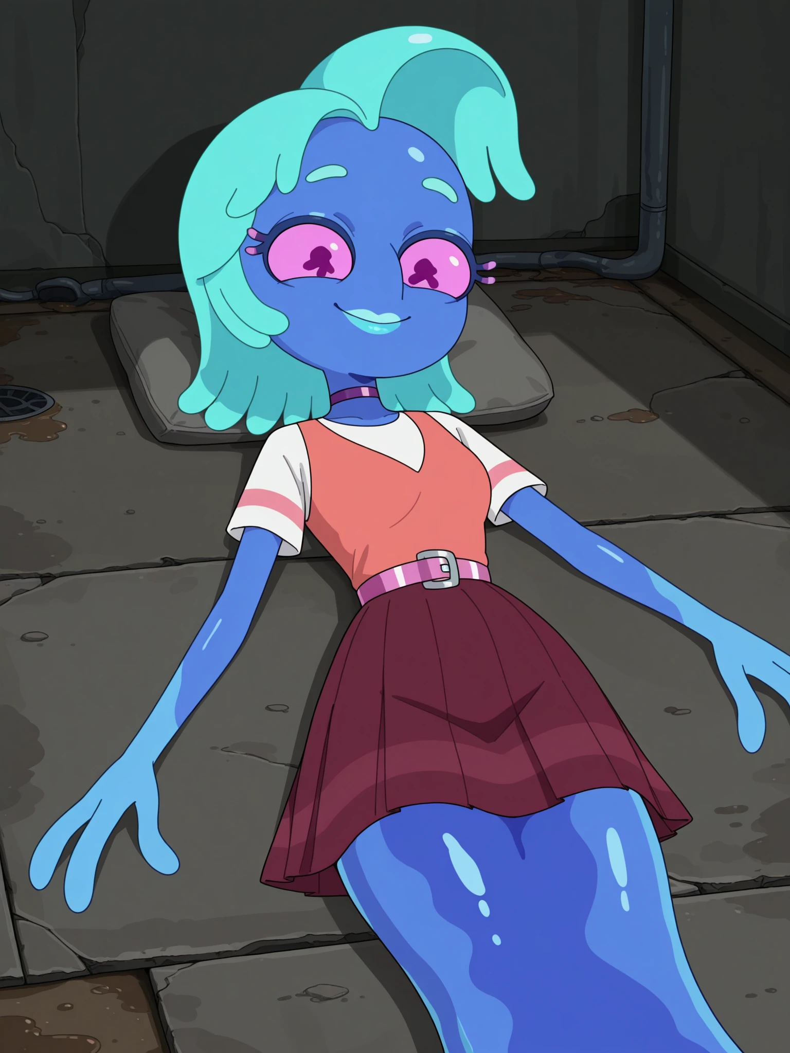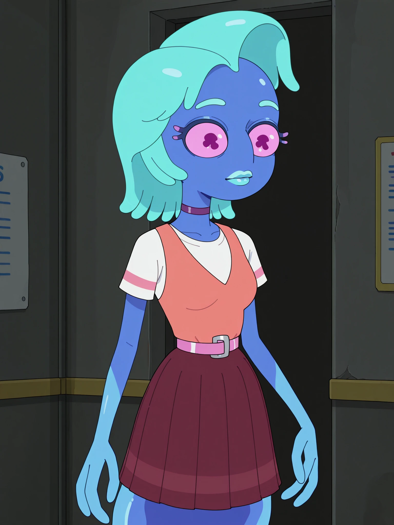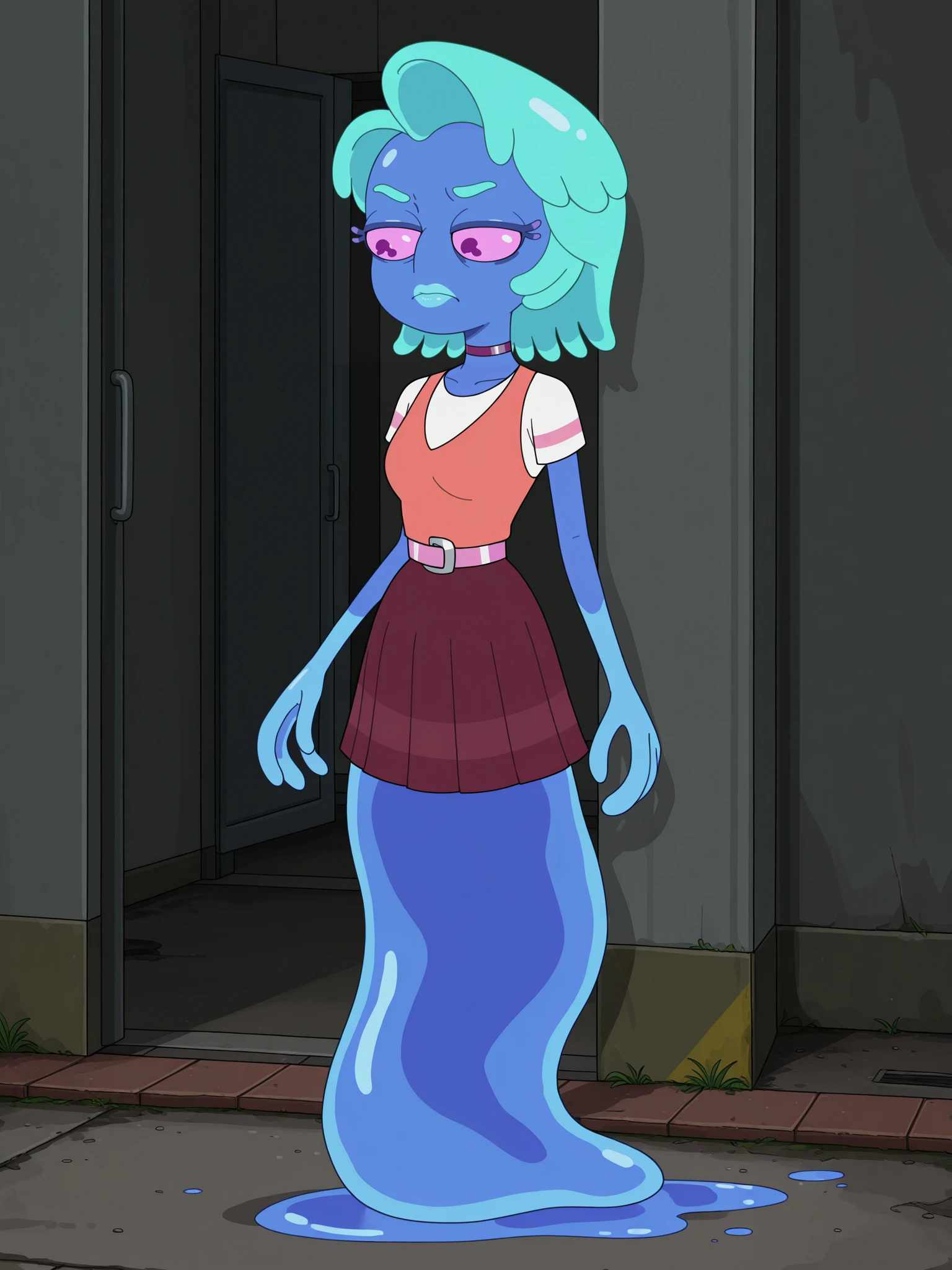 Triggers: s8mortygf, 1girl, solo, monster girl, blue skin, pink eyes, no nose, tentacle hair, aqua hair, aqua lips, (no legs:1.2), fewer digits, purple choker, white shirt, short sleeves, pink stripe on sleeves, vest, pink belt, maroon skirt, pleated skirt, slime trail