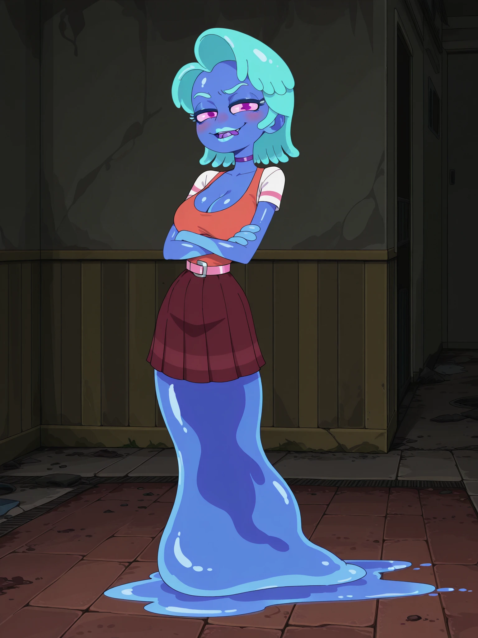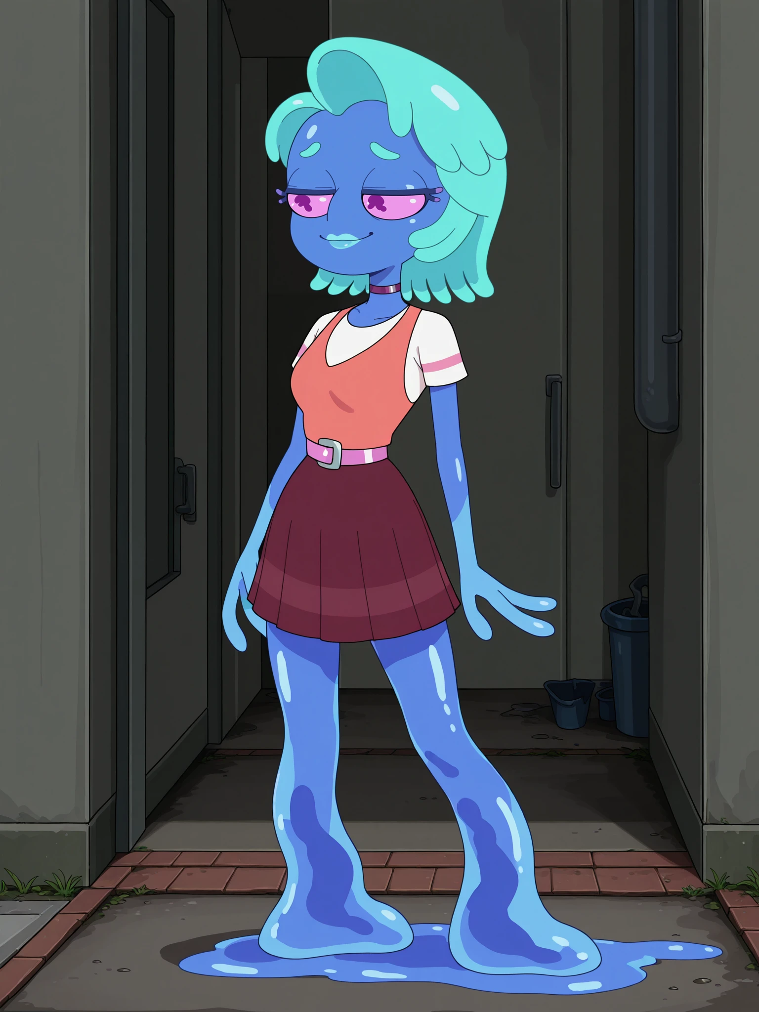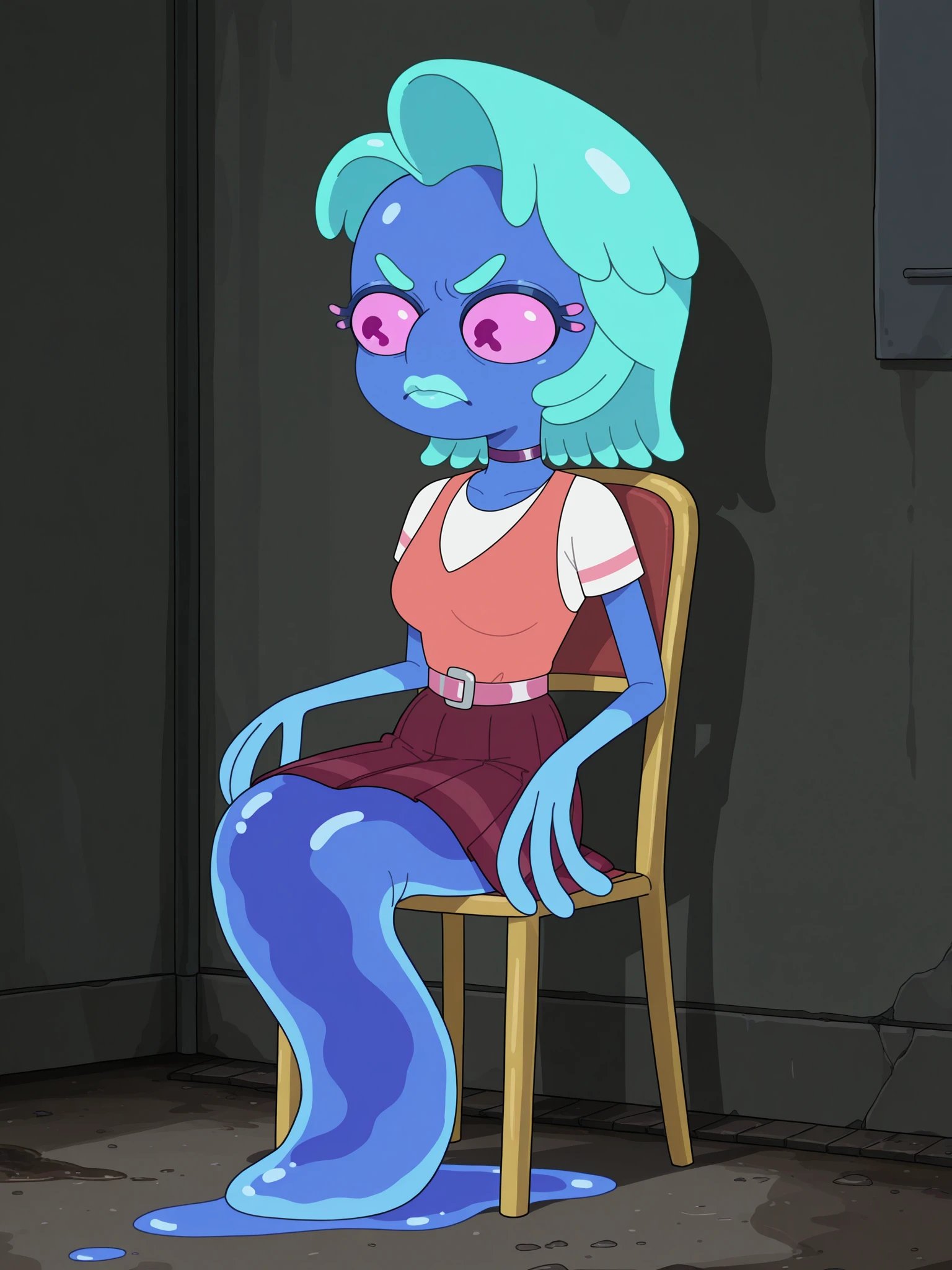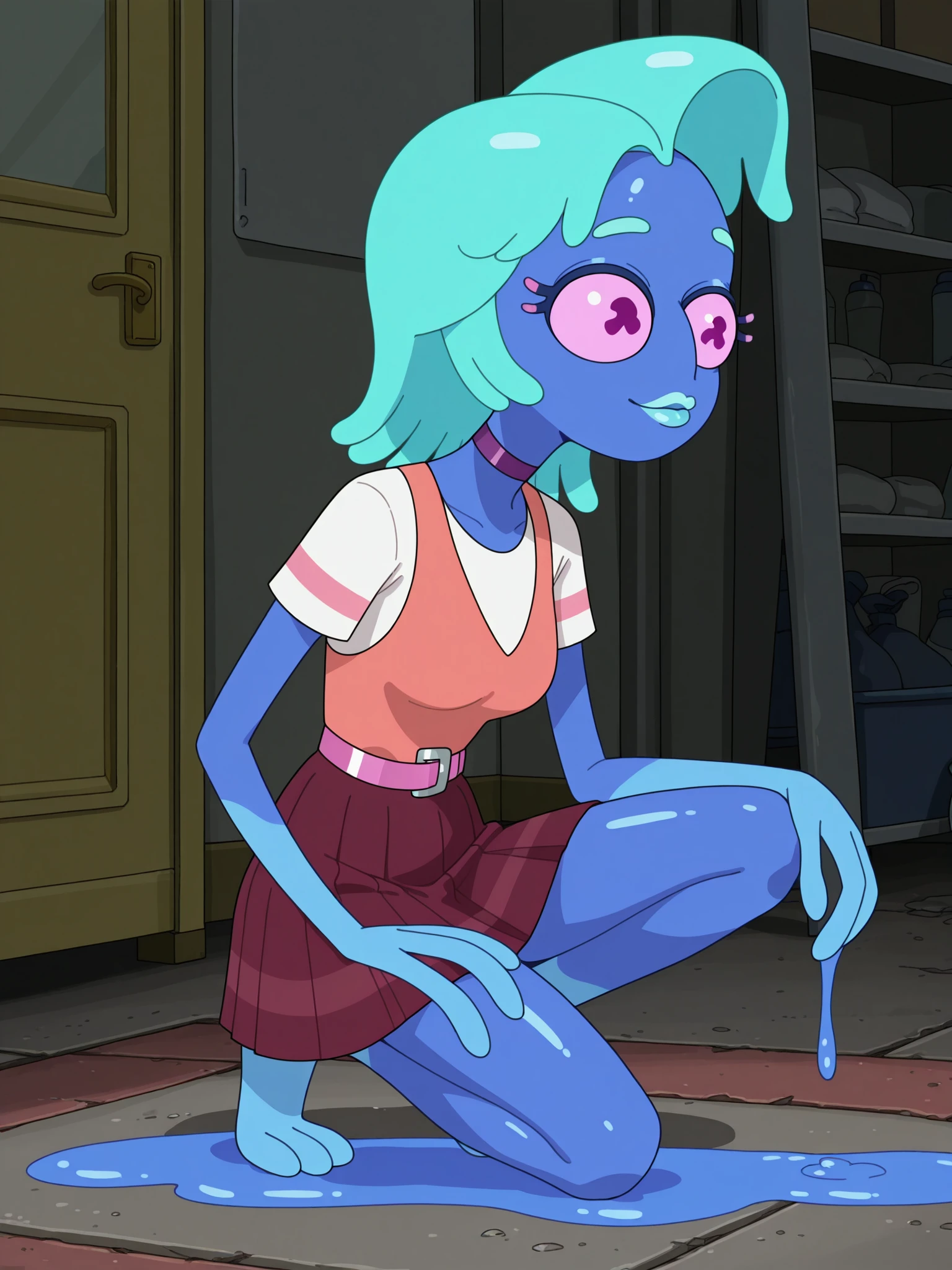 Triggers: s8mortygf, 1girl, solo, monster girl, blue skin, pink eyes, no nose, tentacle hair, aqua hair, aqua lips, (no legs:1.2), fewer digits, purple choker, white shirt, short sleeves, pink stripe on sleeves, vest, pink belt, maroon skirt, pleated skirt, slime trail