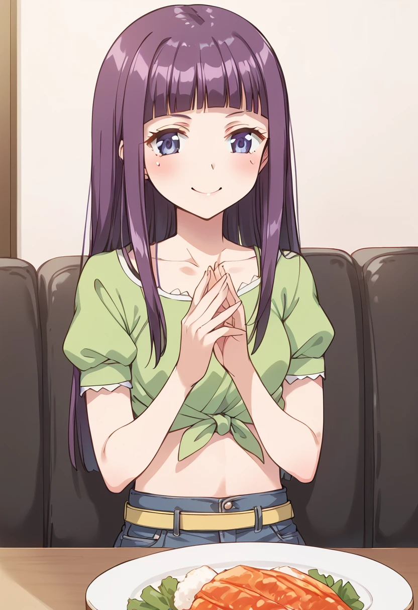 fujiwara zakuro, purple hair, blunt bangs, sidelocks, hime cut, straight hair, long hair, blue eyes, purple eyes, eyelashes, green shirt, tied shirt, puffy short sleeves, collarbone, midriff, pants, denim, jeans, yellow belt, sneakers, black footwear