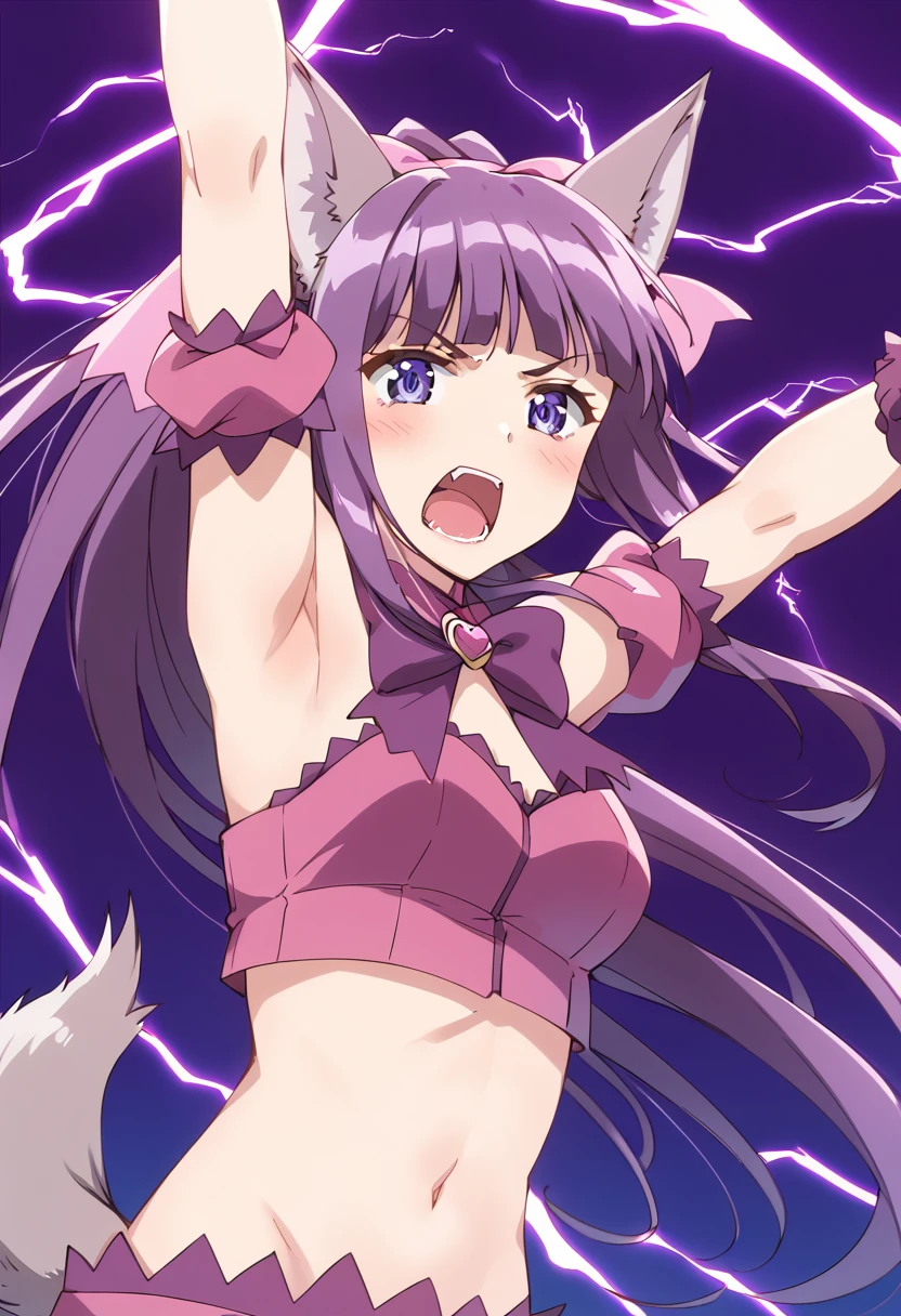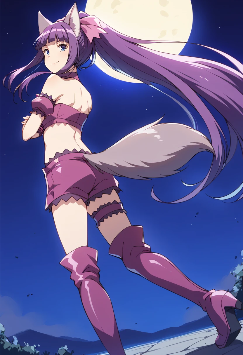 mew zakuro, purple hair, blunt bangs, ponytail, sidelocks, very long hair, purple eyes, blue eyes, eyelashes, wolf ears, animal ear fluff, pink bow, hair bow, strapless, crop top, bandeau, tube top, brooch, pink choker, purple neckwear, purple bowtie, puffy detached sleeves, arm garter, wrist cuffs, short shorts, purple shorts, bridal garter, wolf tail, purple footwear, thigh boots, bare shoulders, navel, midriff