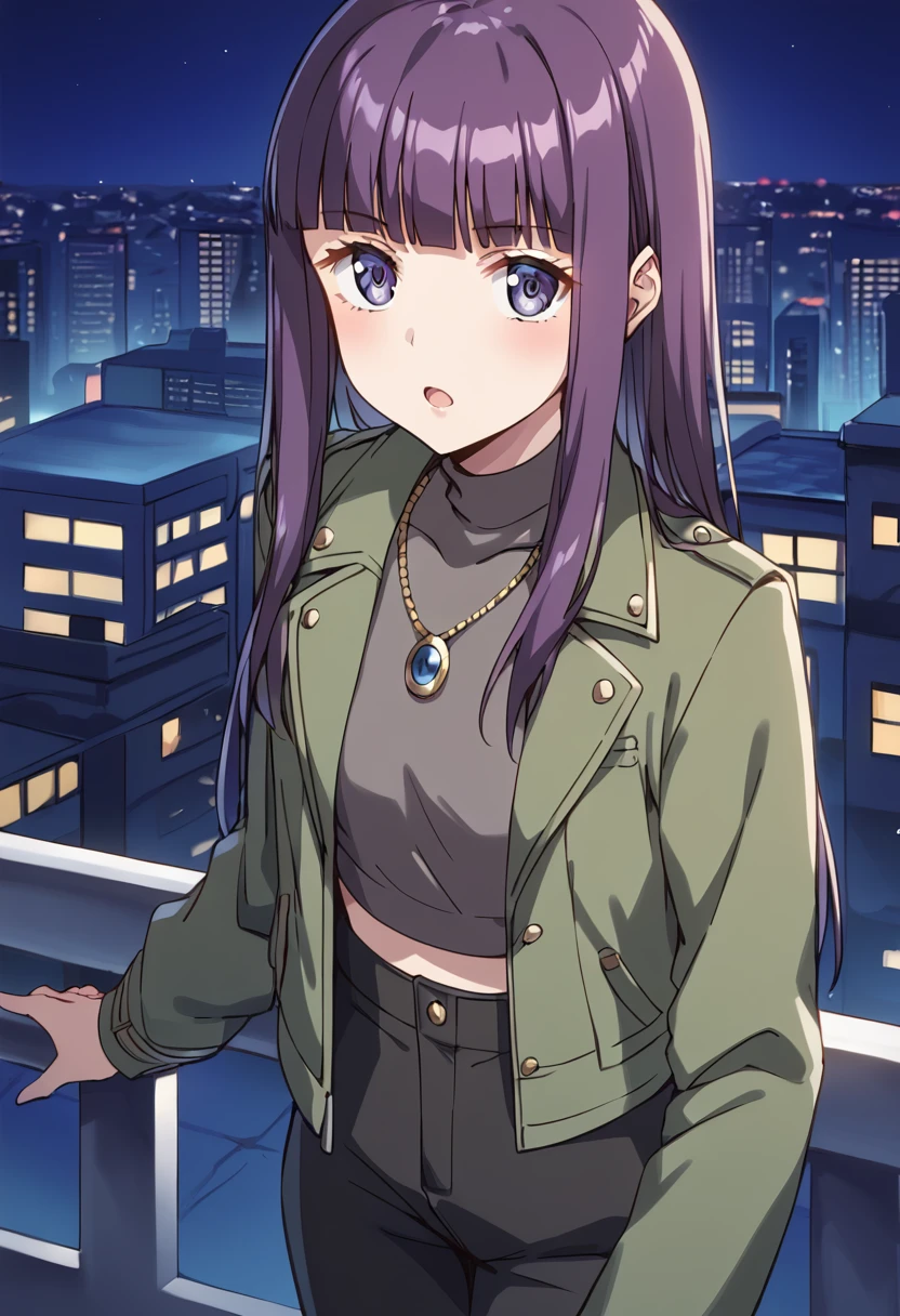 fujiwara zakuro, purple hair, blunt bangs, sidelocks, hime cut, straight hair, long hair, blue eyes, purple eyes, eyelashes, brown jacket, open jacket, cropped jacket, turtleneck, black shirt, black pants, high-waist pants, torn pants, knee boots, black footwear, necklace, midriff