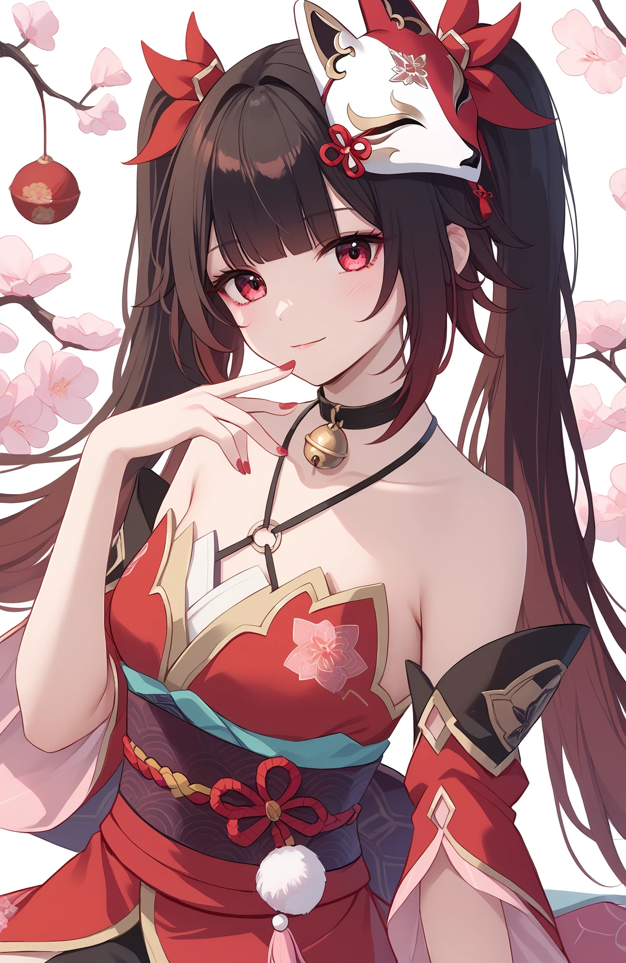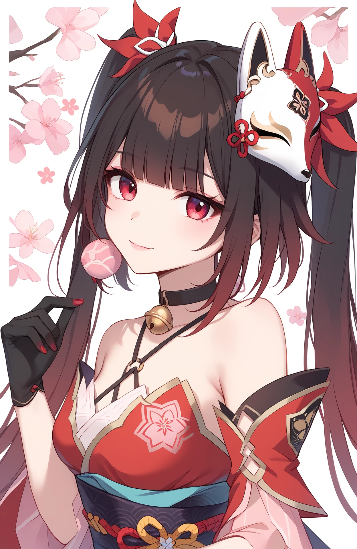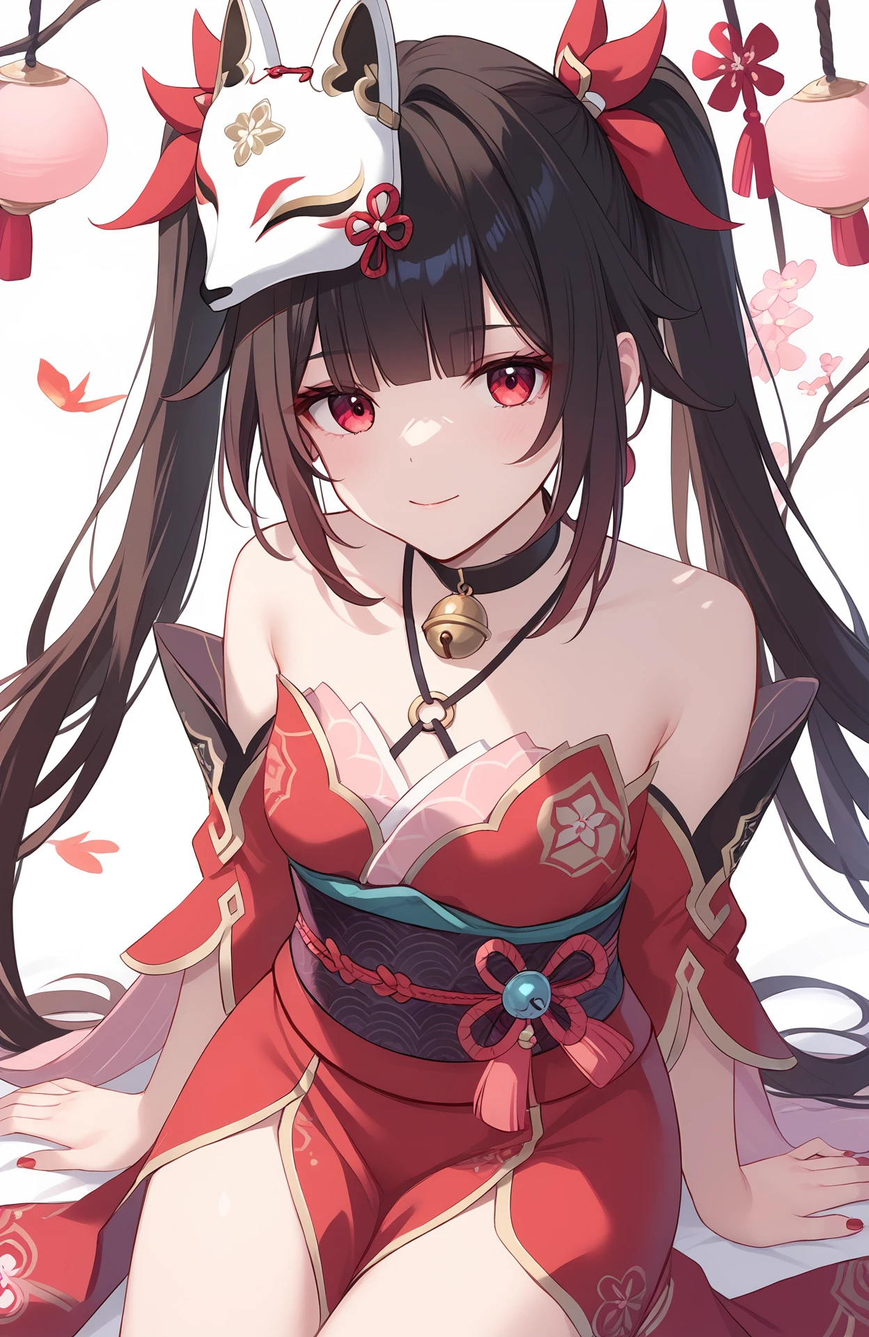 a girl named huahuo,huahuo,1girl,twintails,looking at viewer,fox mask,bare shoulders,mask on head,black choker,detached sleeves,obi,jingle bell,black sash,black gloves,neck bell,criss-cross halter,red nails,red dress