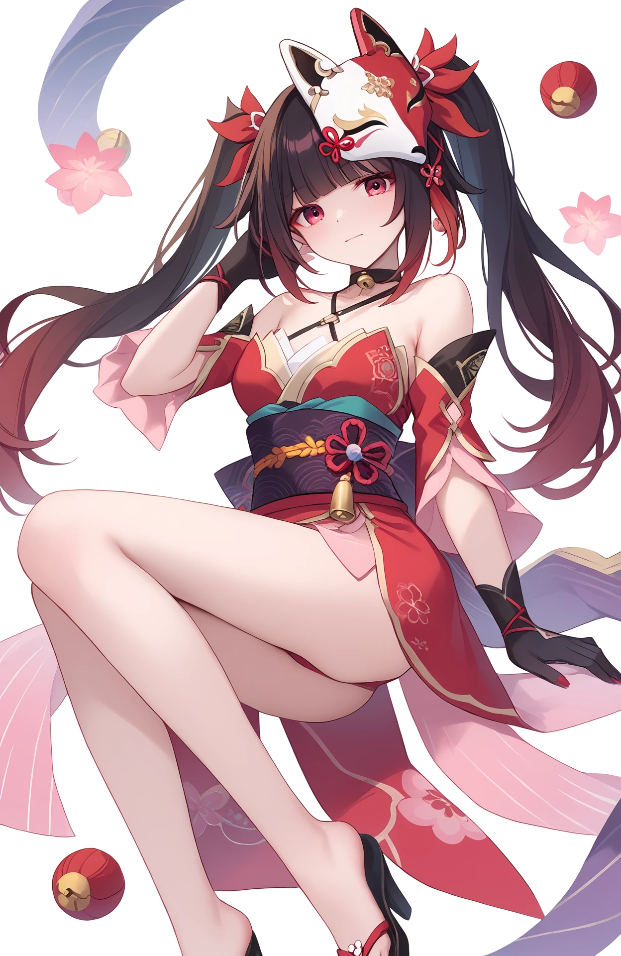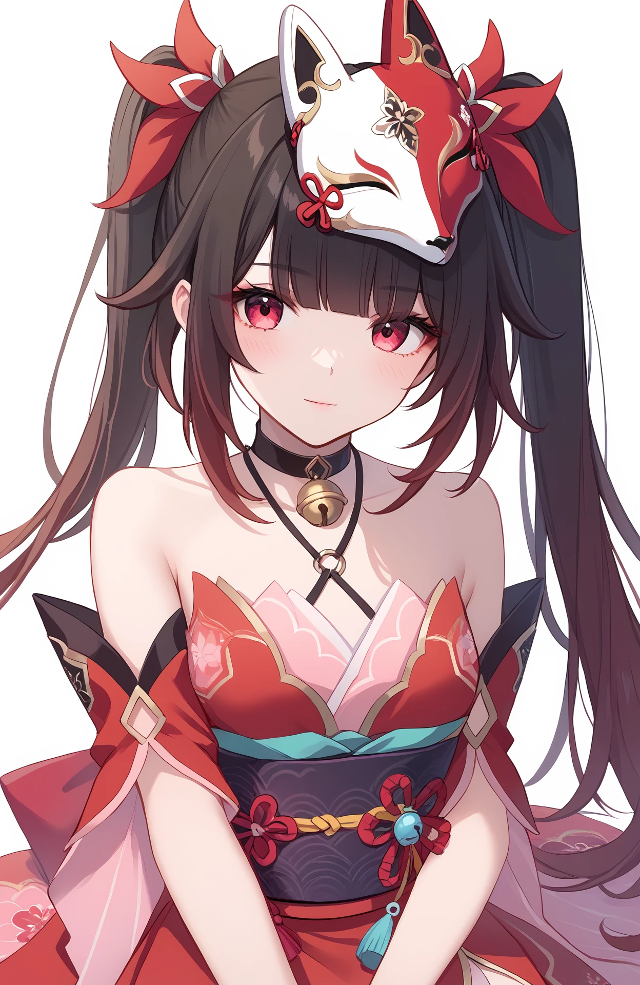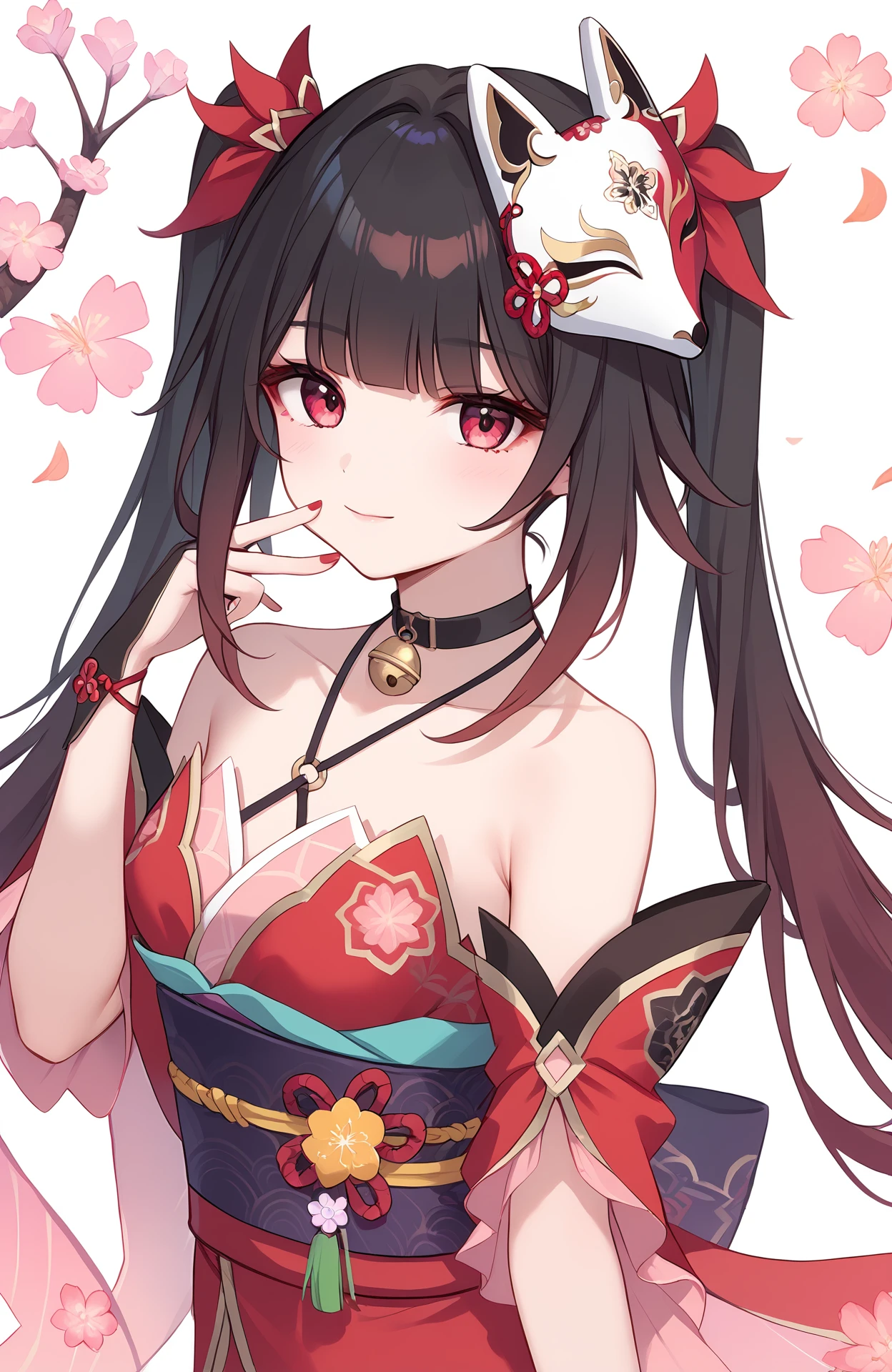 a girl named huahuo,huahuo,1girl,twintails,looking at viewer,fox mask,bare shoulders,mask on head,black choker,detached sleeves,obi,jingle bell,black sash,black gloves,neck bell,criss-cross halter,red nails,red dress