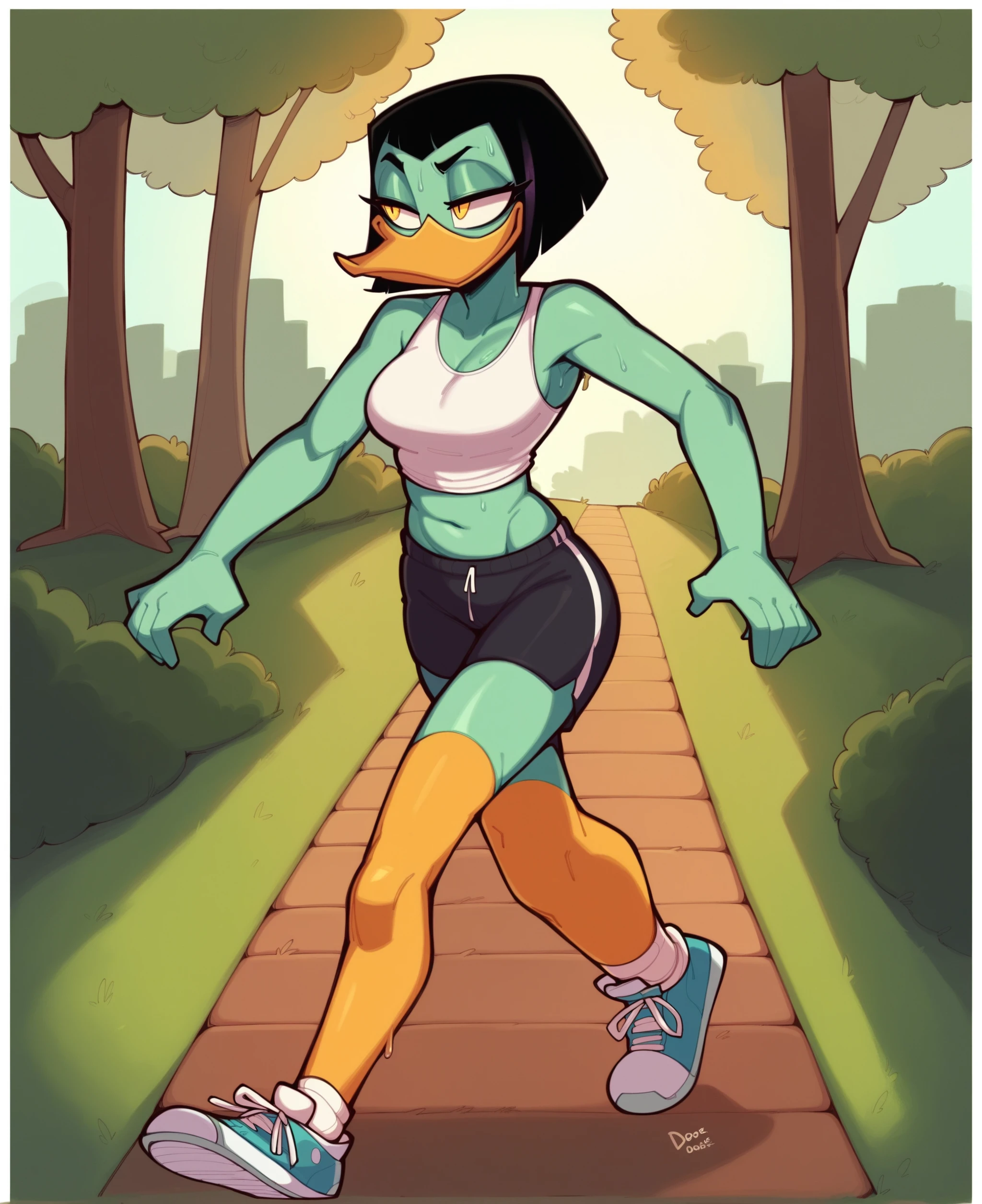 magica de spell, female, anthro, duck, beak, ducktales, black hair, scut tail, green skin, white skin, yellow eyes, eye bags, eyeliner, orange legs, webbed feetReinforcement SFW Tags: