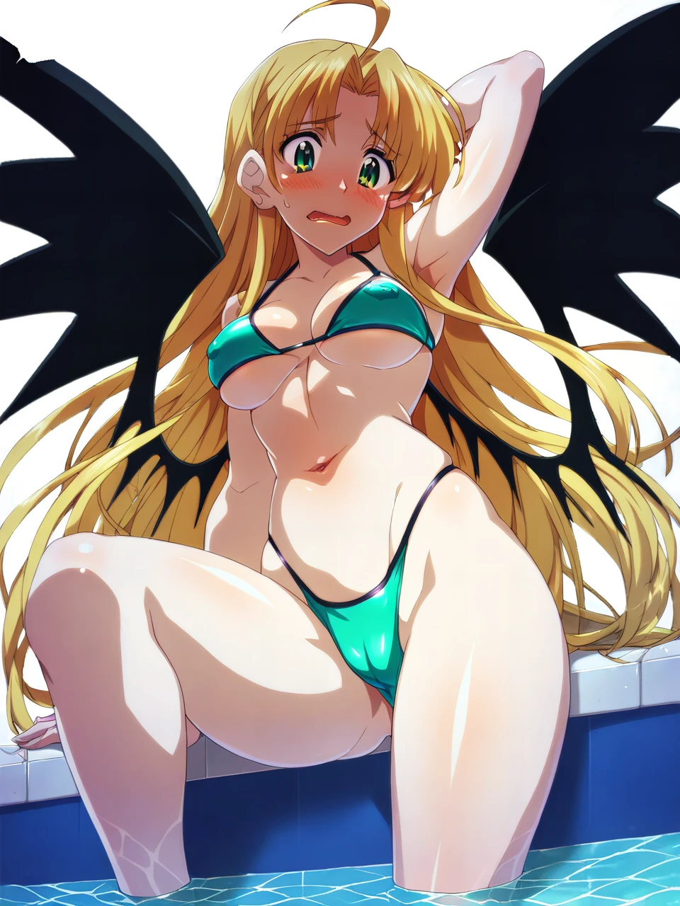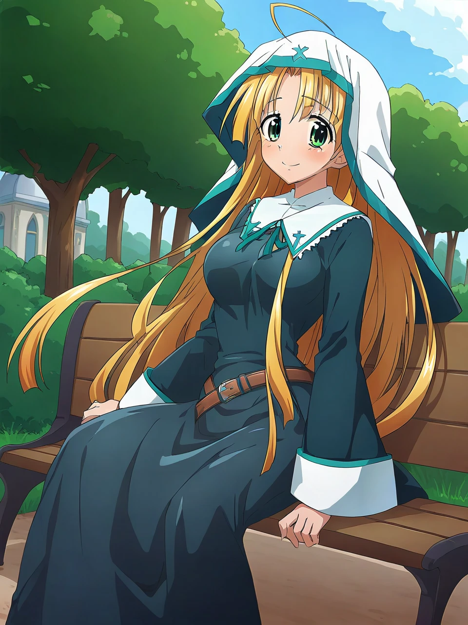 asiamobage, 1girl, long hair, blonde hair, ahoge, green eyes, medium breasts,