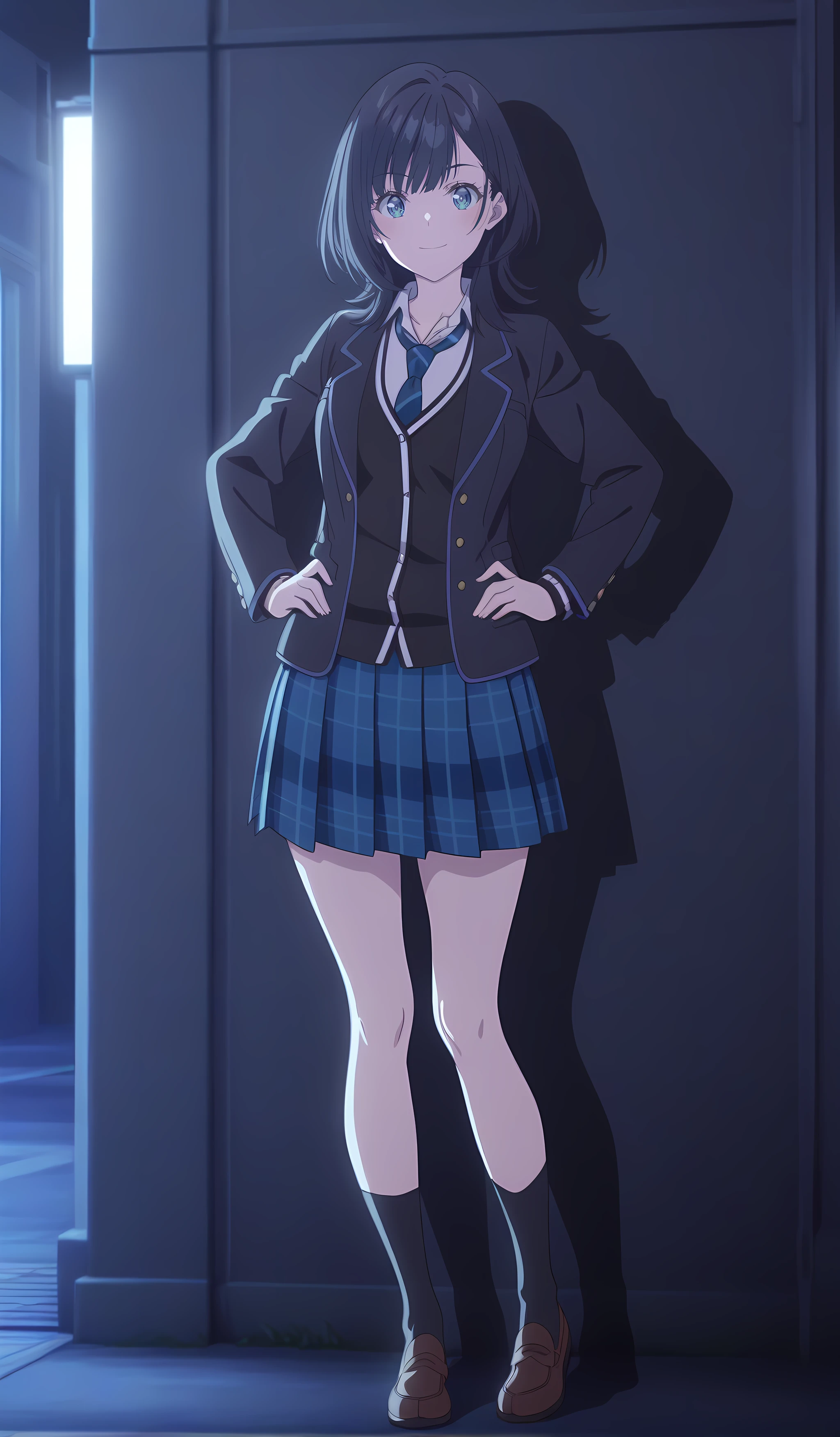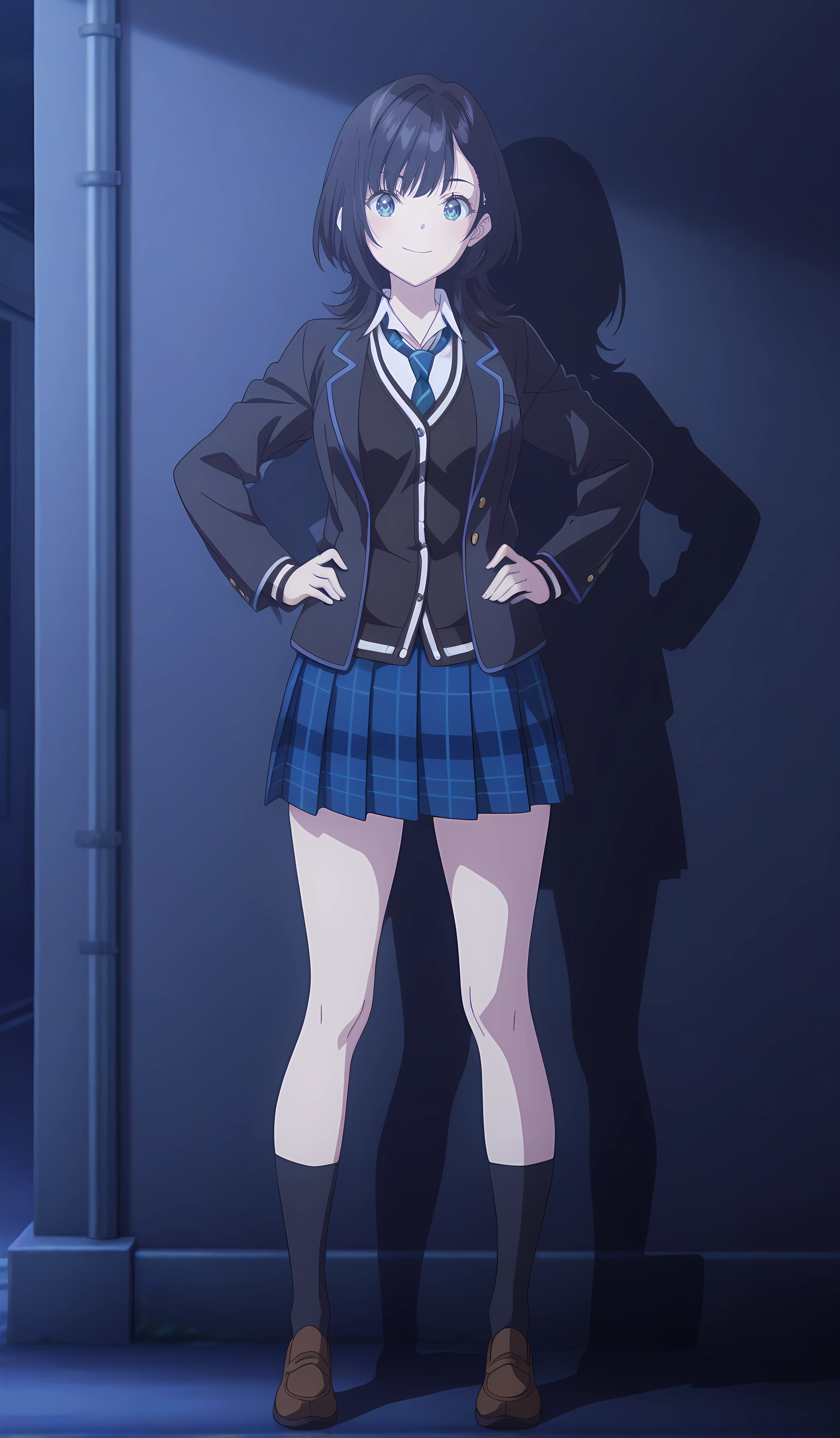 skirt, school uniform, socks, plaid, jacket, black socks, plaid skirt, blue skirt, black jacket, brown footwear, shoes, pleated skirt,