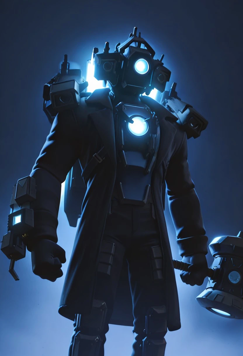Titan Cameraman, robot, dark gray metal skin, camera head, camera for head, glowing blue eye, no pupil, cameras on shoulders, open black coat, blue core in , black pants, black gloves, black shoes, jetpack, holding hammer