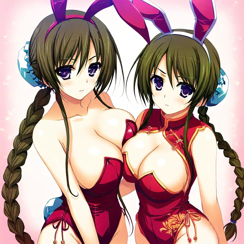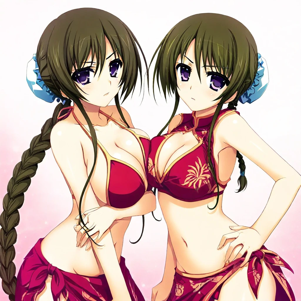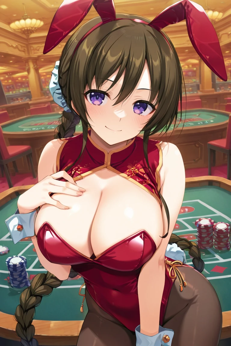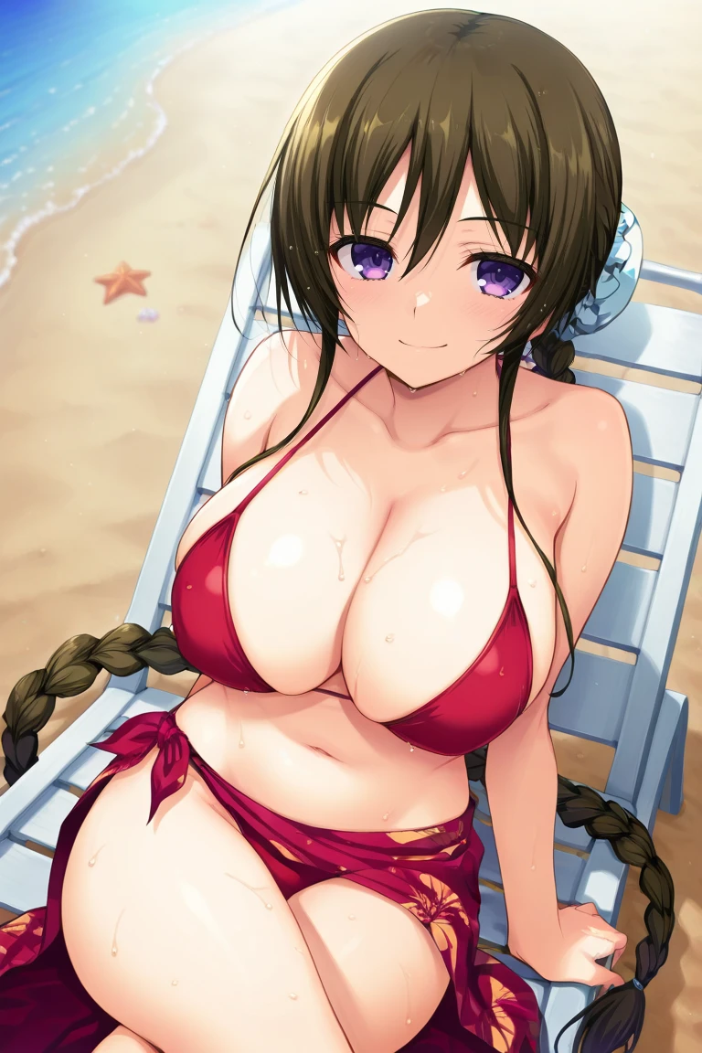 brown hair, very long hair, bangs, hair between eyes, side locks, single braid, braided ponytail, bun cover, purple eyes, large breasts,