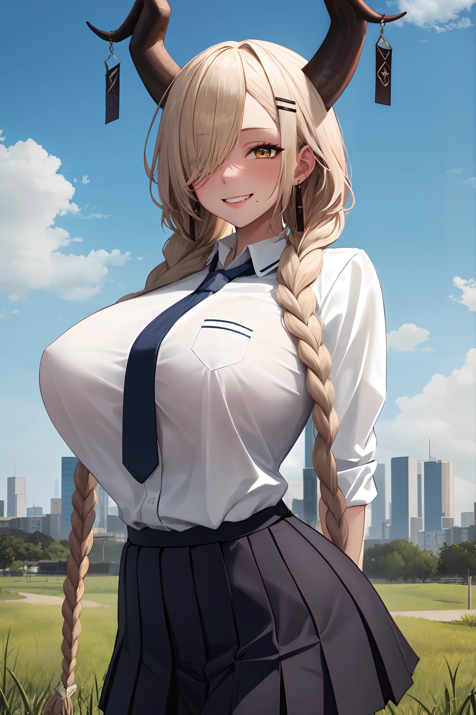 Character trigger : azlnowari, mole under mouth, huge breasts, very long hair, low twin braids, hair ornament, earrings
