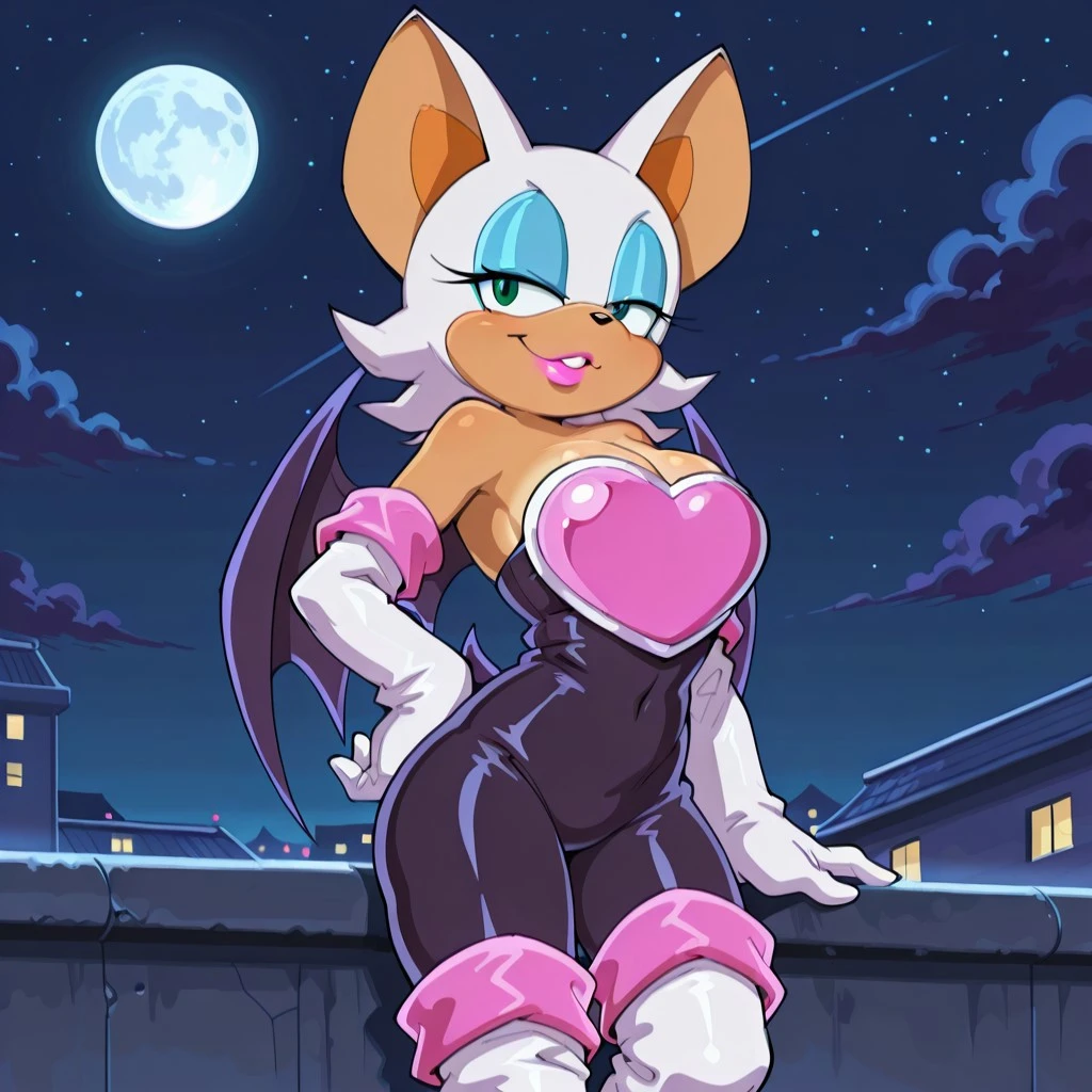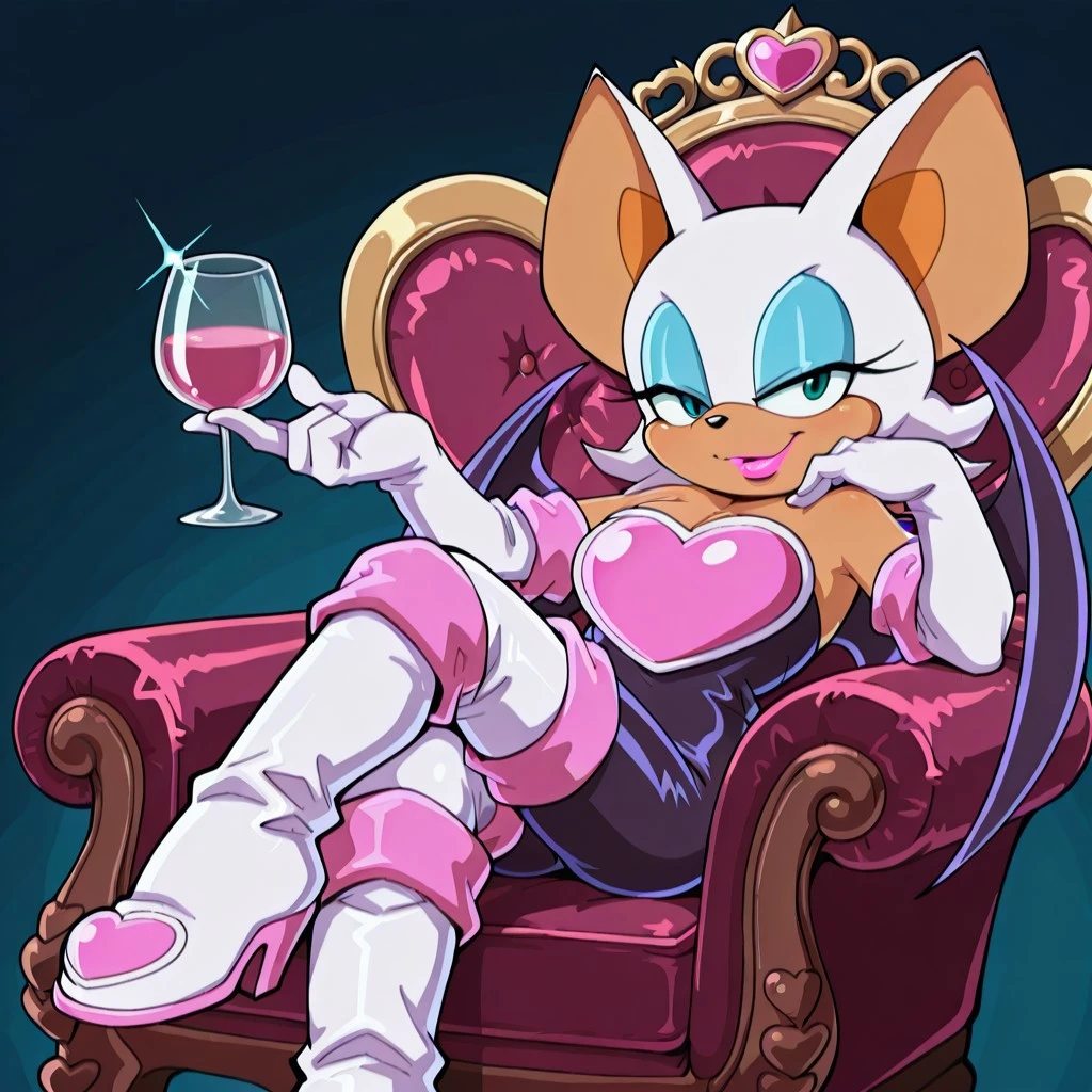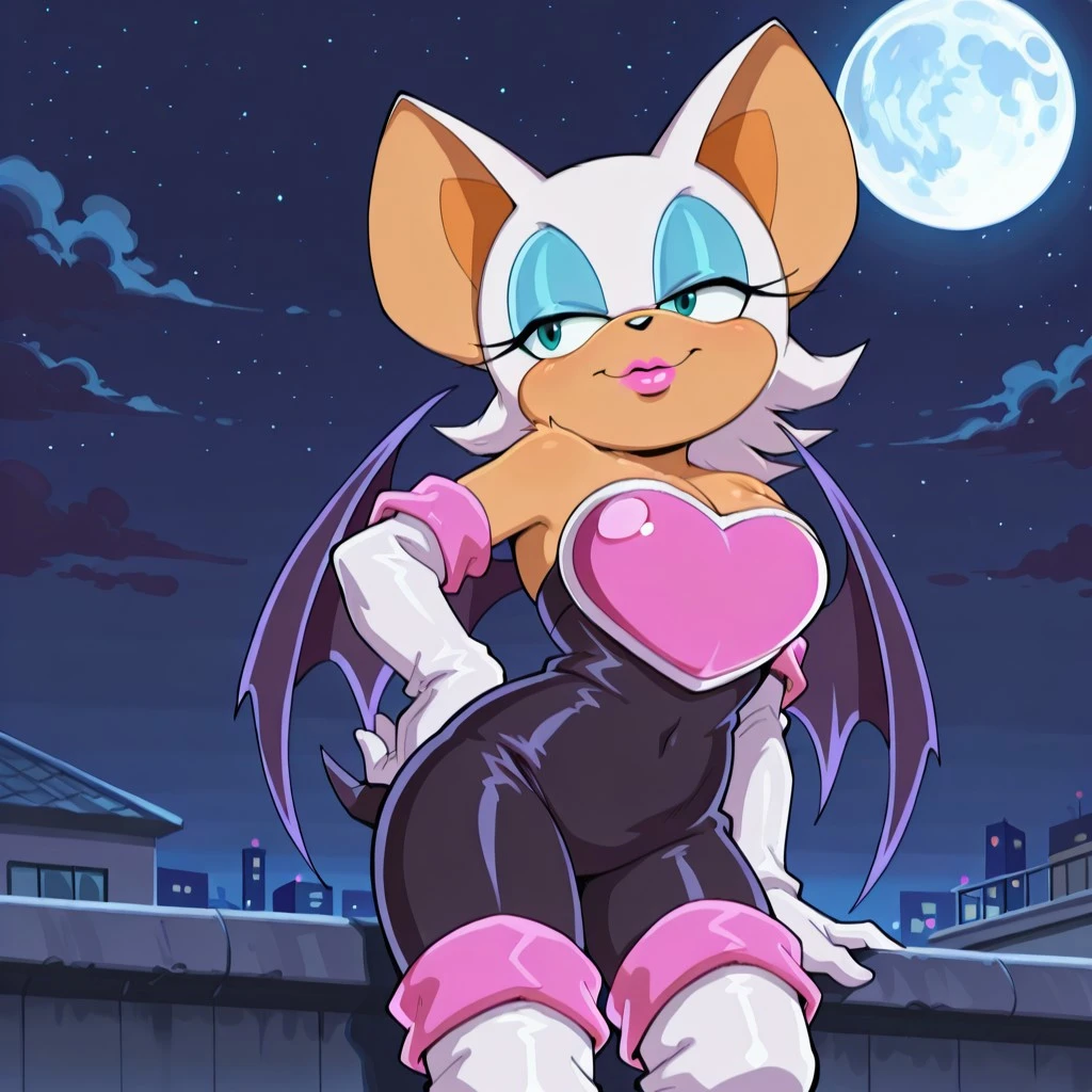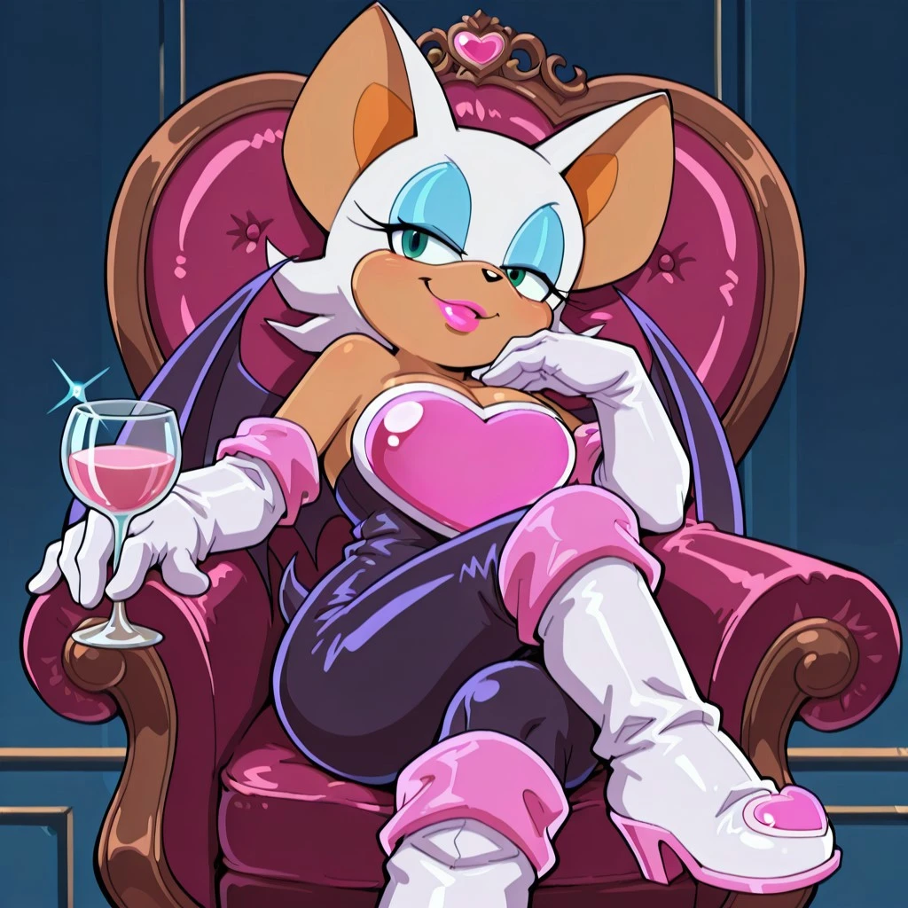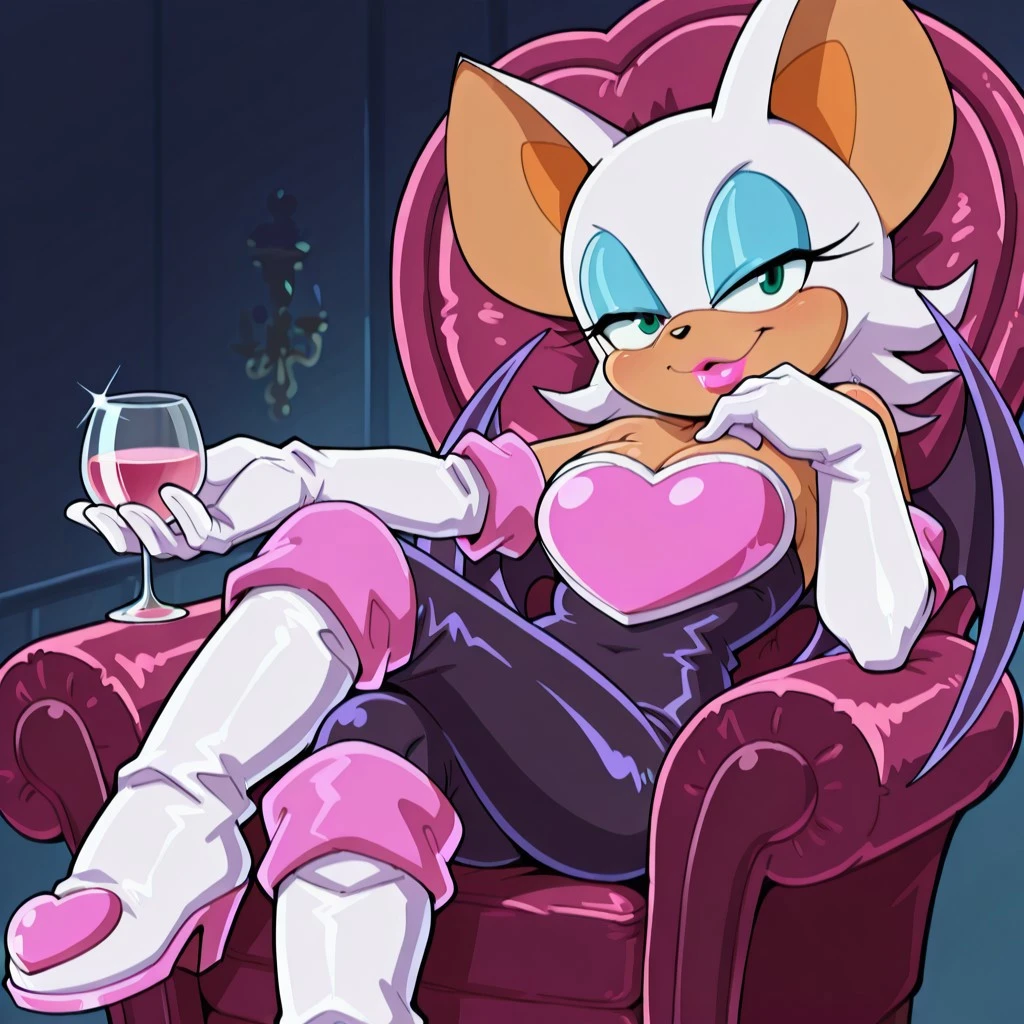 bat female, solo, curvy, light brown body, large ears with light brown accent, turquoise green eyes, black nose, pink lipstick, white head fur with tapered back, light blue eyeshadow, two long eyelashes, breasts, cleavage, black bat wings, bat tail, black sleeveless , bare shoulders, pink chest_plate, long white gloves with thick pink trim, long white boots with pink accents,