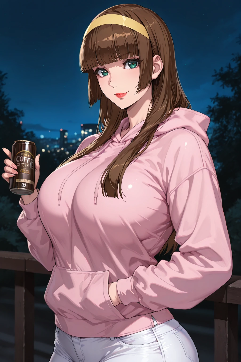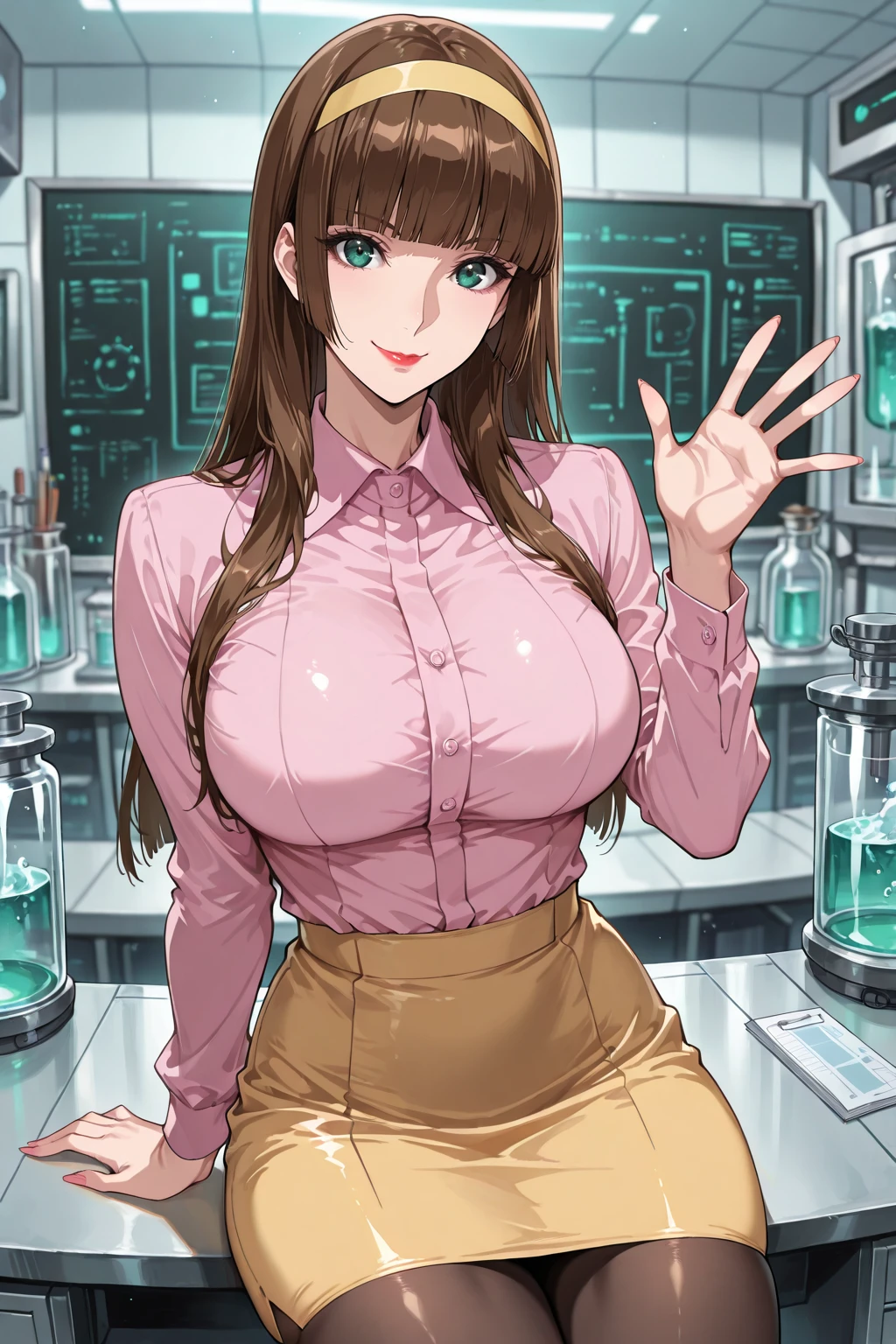 mazsayaka, brown hair, long hair, blunt bangs, yellow hairband, green eyes, lipstick