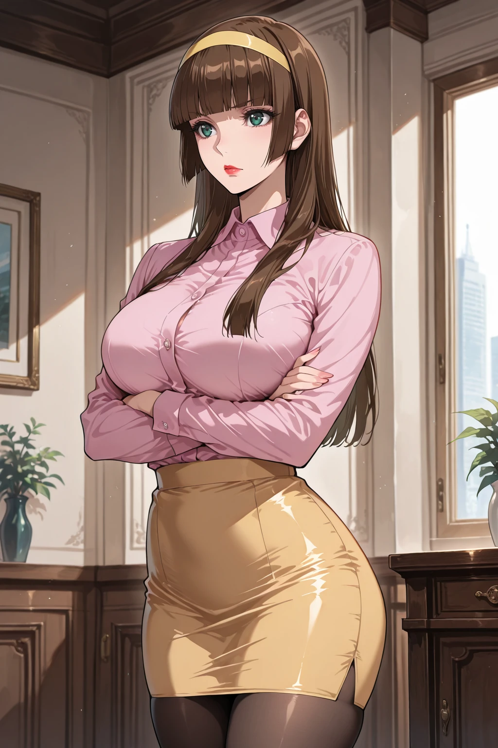 pink collared shirt, long sleeves, yellow skirt, pencil skirt, pantyhose