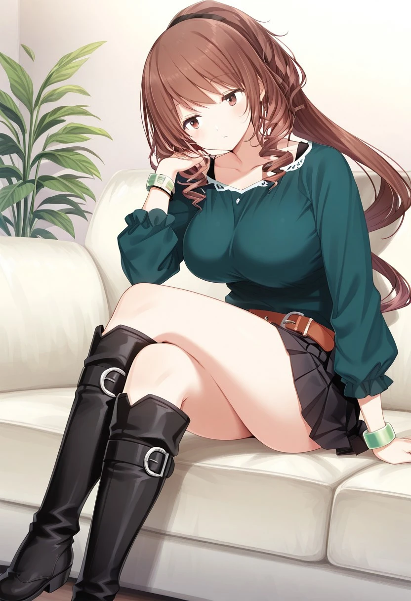green outfit, knee boots, black boots, skirt, belt, bracelet, pleated skirt, black skirt, green shirt, long sleeves