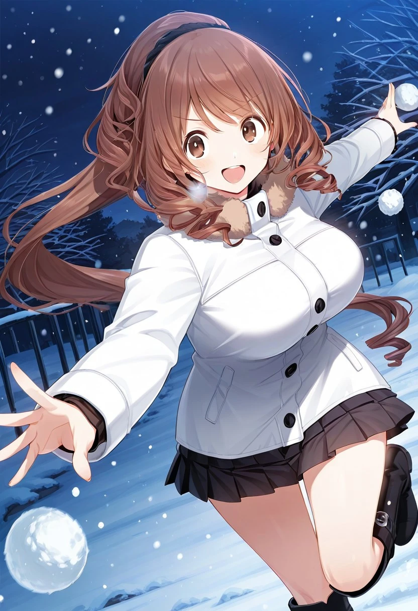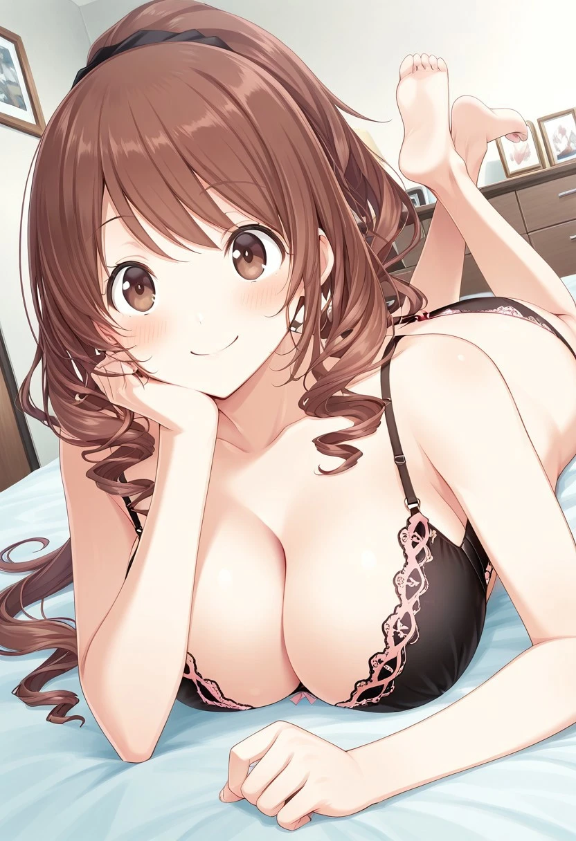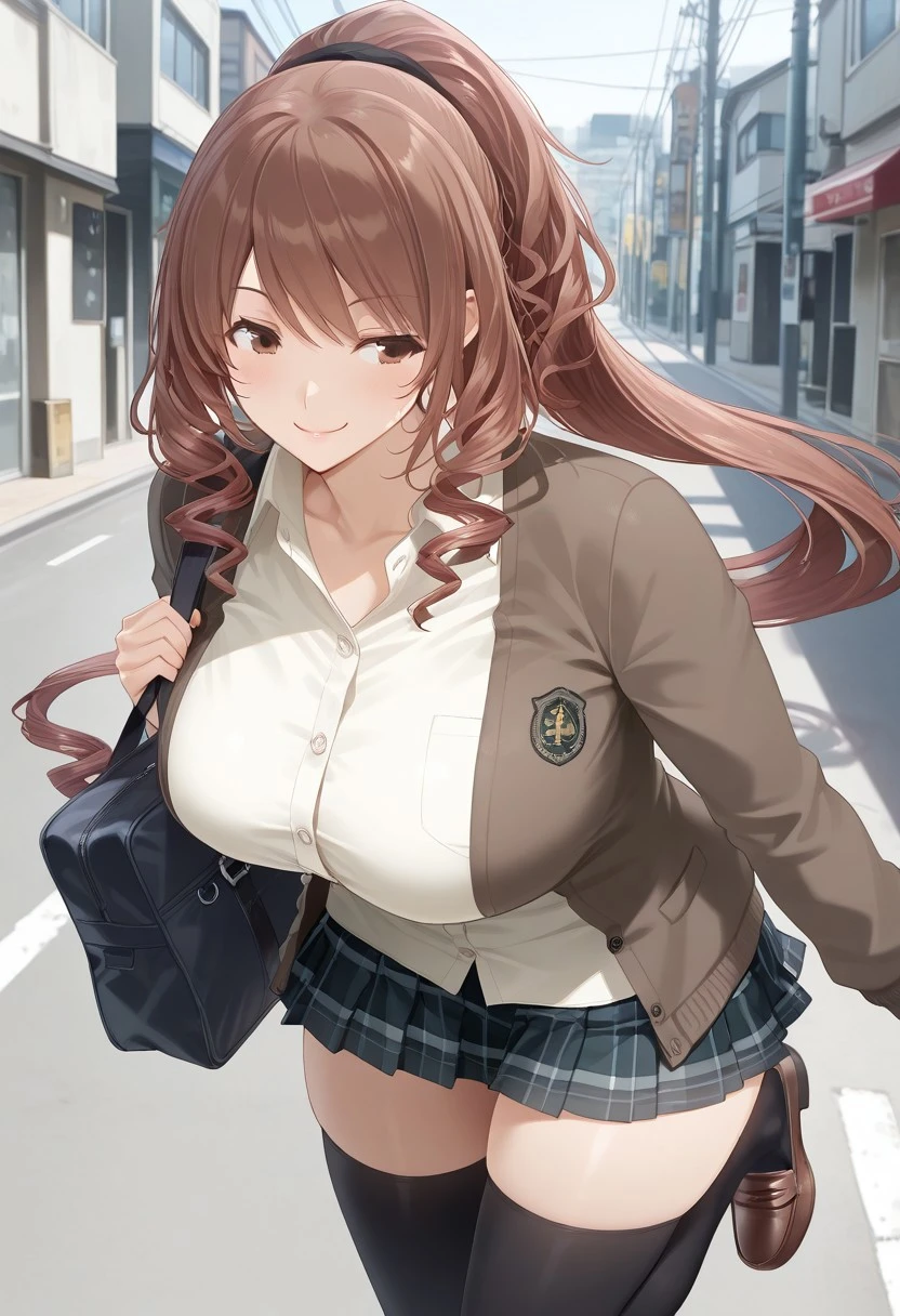 brown hair, long hair, drill hair, ponytail, brown eyes, large breasts,