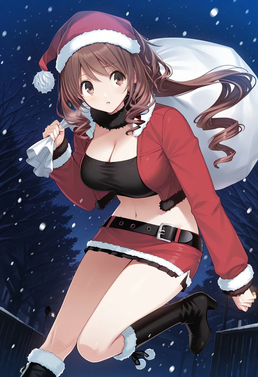 Christmas outfit, santa hat, skirt, miniskirt, belt, santa costume, jacket,open jacket, fur trim, knee boots, black boots, midriff, open clothes, cropped jacket, long sleeves, black crop top, cleavage, high heel boots