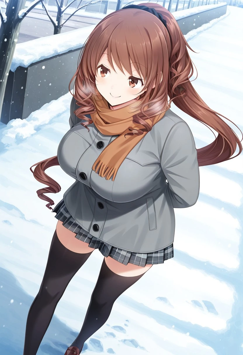 gray coat, scarf, pleated skirt, plaid skirt, thighhighs, zettai ryouiki, loafers, brown shoes