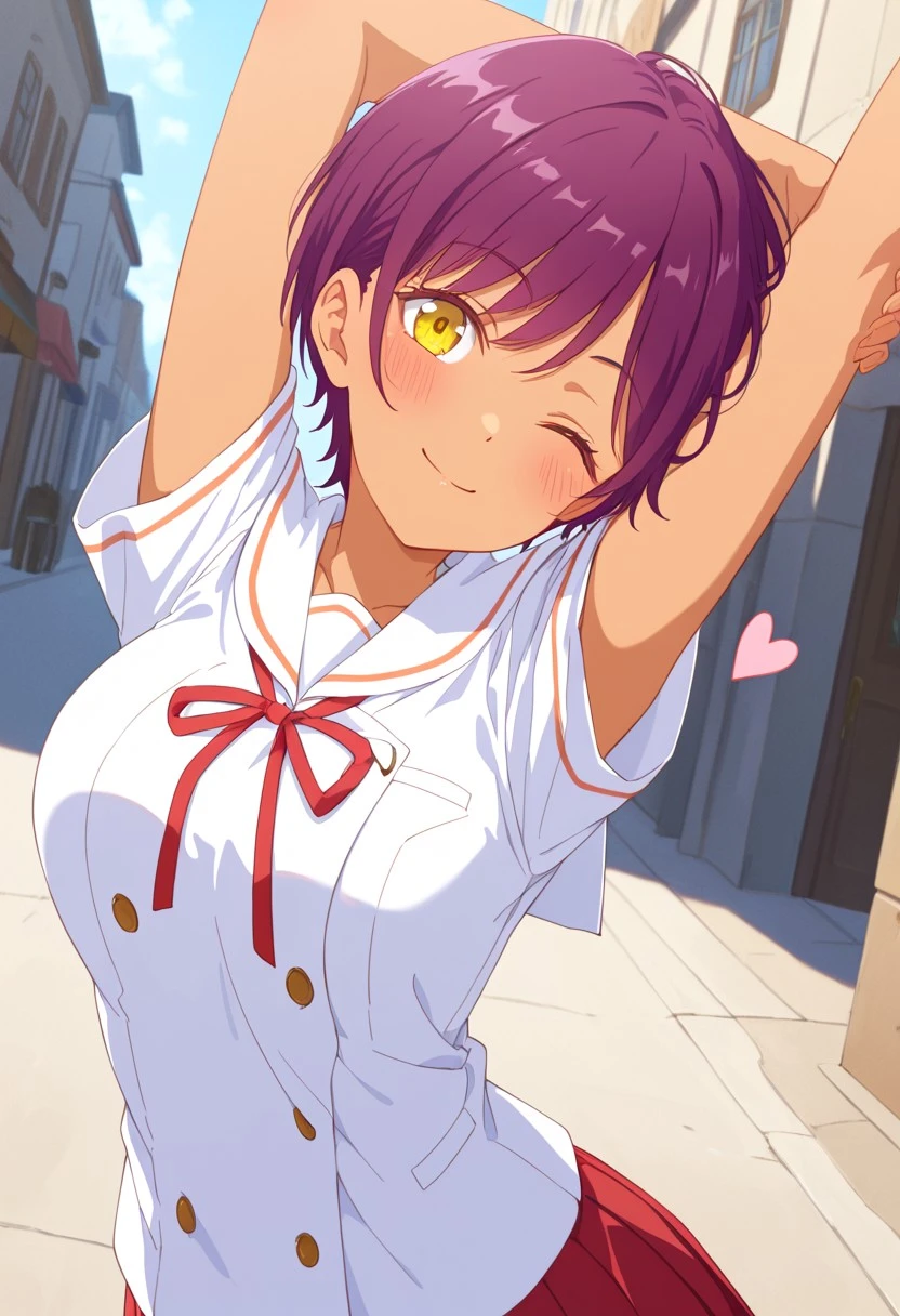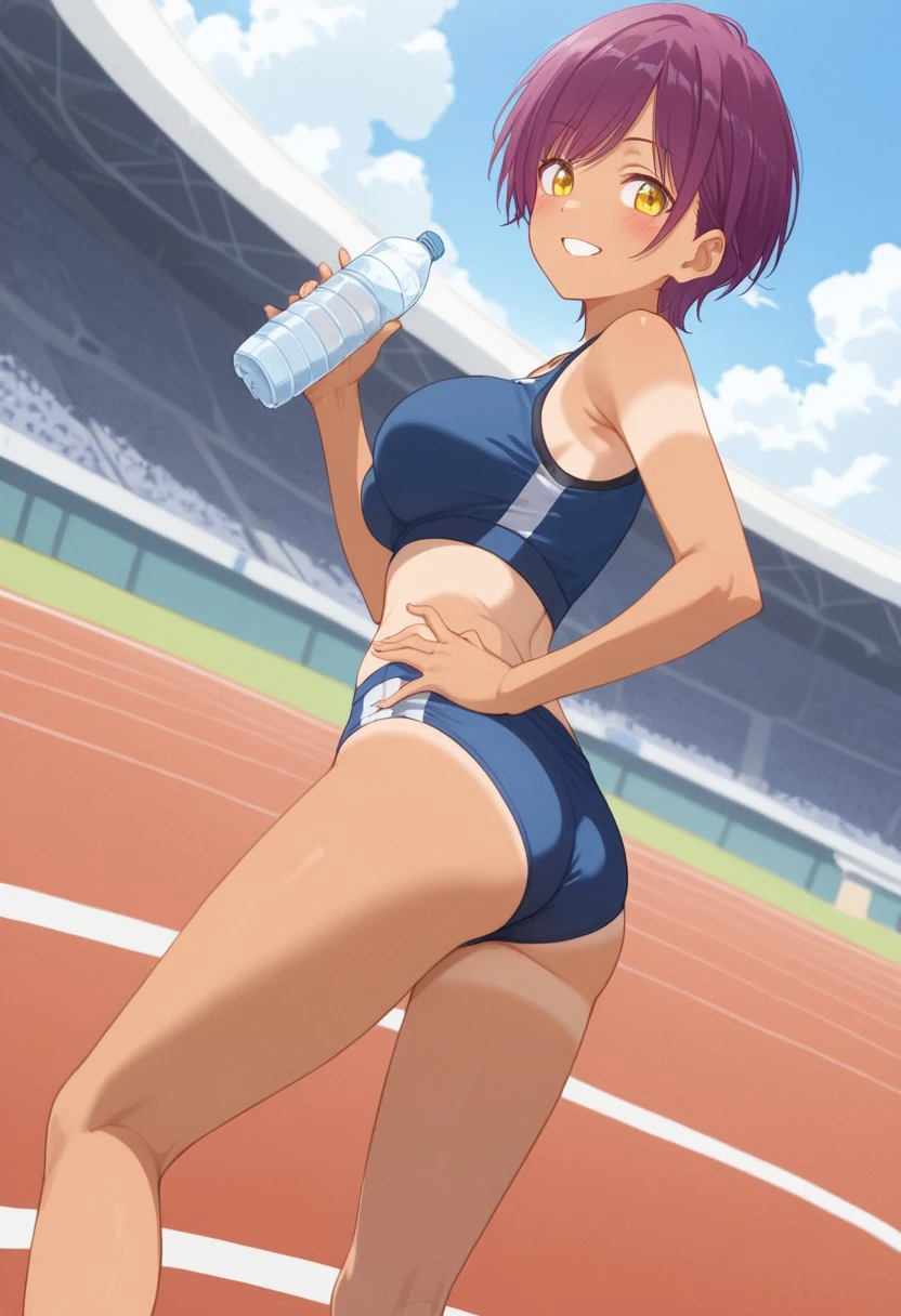 Trigger: Haru_Hinata, short hair, reddish-purple hair, yellow eyes, tanned skined female, large breasts, slim,