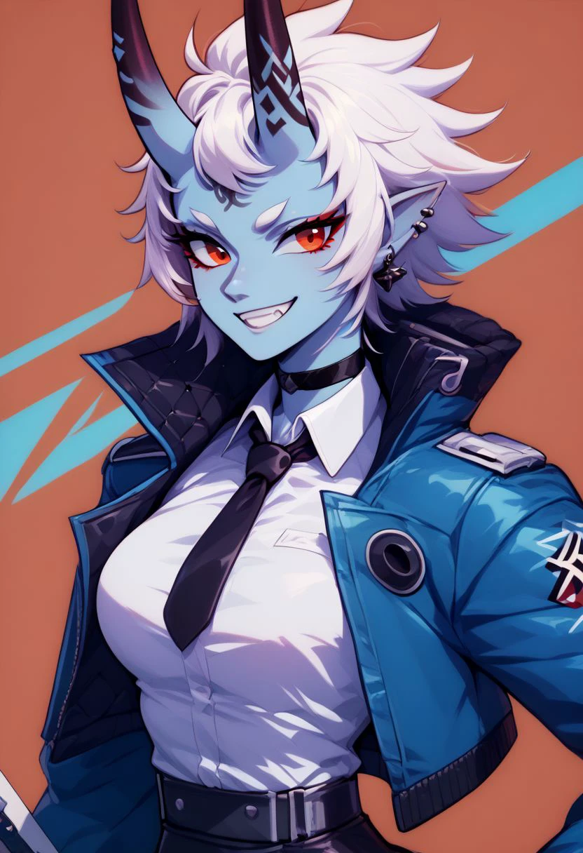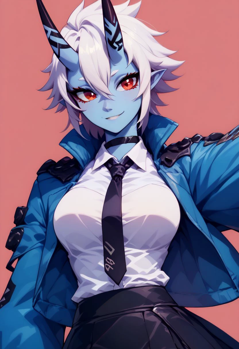 soukaku, red eyes, blue skin, white hair, short hair, horns, oni, black choker, jacket, white collared shirt, black tie, black skirt,